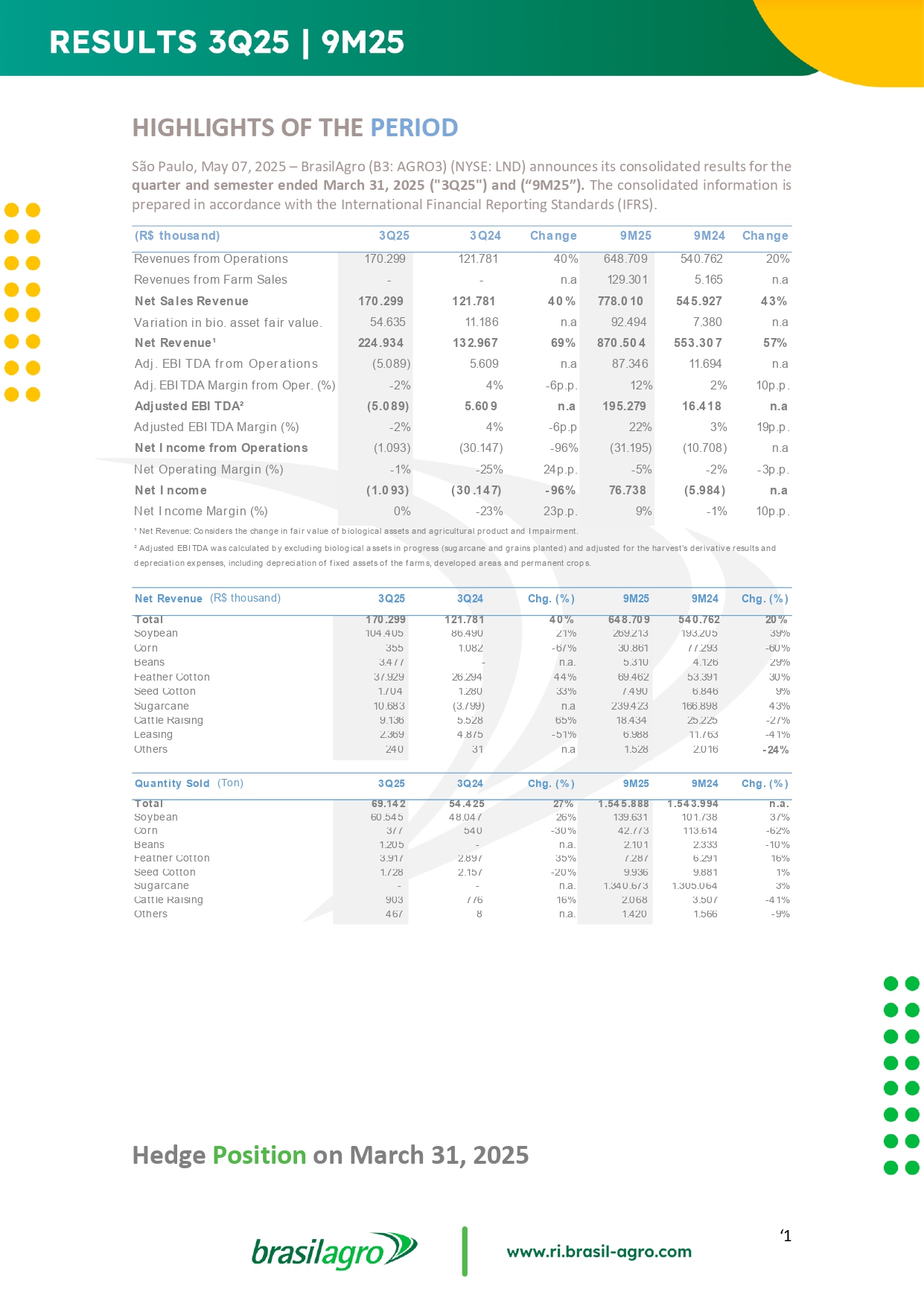 ‘1 HIGHLIGHTS OF THE PERIOD São Paulo, May 07 , 2025 – BrasilAgro (B 3 : AGRO 3 ) (NYSE : LND) announces its consolidated results for the quarter and semester ended March 31 , 2025 (" 3 Q 25 ") and (“ 9 M 25 ”) . The consolidated information is prepared in accordance with the International Financial Reporting Standards (IFRS) . Hedge Position on March 31, 2025 Cha nge 9M24 9M25 Cha nge 3 Q24 3 Q25 (R$ thousa nd) 20% 540.762 648.709 40% 121.781 170.299 Revenues f rom Operations n.a 5.165 129.301 n.a - - Revenues f rom Farm Sales 4 3 % 54 5.927 778.0 10 4 0 % 121.781 170 .299 Net Sa les Revenue n.a 7.380 92.494 n.a 11.186 54.635 Variation in bio. a sset fair value. 57% 553 .30 7 870 .50 4 69% 132.967 224 .934 Net Revenue¹ n.a 11.694 87.346 n.a 5.609 (5.089) Adj. EBI TDA f r om Op er a t i ons 10p.p. 2% 12% - 6p.p. 4% - 2% Adj. EBI TDA Margin f rom Oper. (%) n.a 16.4 18 195.279 n.a 5.60 9 (5.0 89) Adjusted EBI TDA² 19p.p. 3% 22% - 6p.p 4% - 2% Adjusted EBI TDA Margin (%) n.a (10.708) (31.195) - 96% (30.147) (1.093) Net I ncome from Operations - 3p.p. - 2% - 5% 24p.p. - 25% - 1% Net Operating Margin (%) n.a (5.984 ) 76.738 - 96% (30 .14 7) (1.0 93 ) Net I ncome 10p.p. - 1% 9% 23p.p. - 23% 0% Net I ncome Margin (%) ¹ Net Revenue: Consider s the change in f air value of biological assets and agricultur al product and I mpairment. ² Adjusted EBI TDA was calculated by excluding biological assets in progress (sugar cane and grains planted) and adjusted f or the harvest’s derivative results and depreciation expenses, including depreciation of f ixed assets of the f arm s, developed areas and permanent cr ops. Chg. (% ) 9M24 9M25 Chg. (% ) 3Q24 3Q25 Net Revenue (R$ thousand) 20 % 54 0 .762 64 8.70 9 40% 121.781 170 .299 Total 39% 193.205 269.213 21% 86.490 104.405 Soybean - 60% 77.293 30.861 - 67% 1.082 355 Corn 29% 4.126 5.310 n.a. - 3.477 Beans 30% 53.391 69.462 44% 26.294 37.929 Feather Cotton 9% 6.846 7.490 33% 1.280 1.704 Seed Cotton 43% 166.898 239.423 n.a (3.799) 10.683 Sugarcane - 27% 25.225 18.434 65% 5.528 9.136 Cattle Raising - 41% 11.763 6.988 - 51% 4.875 2.369 Leasing - 24 % 2.016 1.528 n.a 31 240 Others Chg. (% ) 9M24 9M25 Chg. (% ) 3Q24 3Q25 Quantity Sold (Ton) n.a. 1.54 3.994 1.54 5.888 27% 54 .4 25 69.14 2 Total 37% 101.738 139.631 26% 48.047 60.545 Soybean - 62% 113.614 42.773 - 30% 540 377 Corn - 10% 2.333 2.101 n.a. - 1.205 Beans 16% 6.291 7.287 35% 2.897 3.917 Feather Cotton 1% 9.881 9.936 - 20% 2.157 1.728 Seed Cotton 3% 1.305.064 1.340.673 n.a. - - Sugarcane - 41% 3.507 2.068 16% 776 903 Cattle Raising - 9% 1.566 1.420 n.a. 8 467 Others