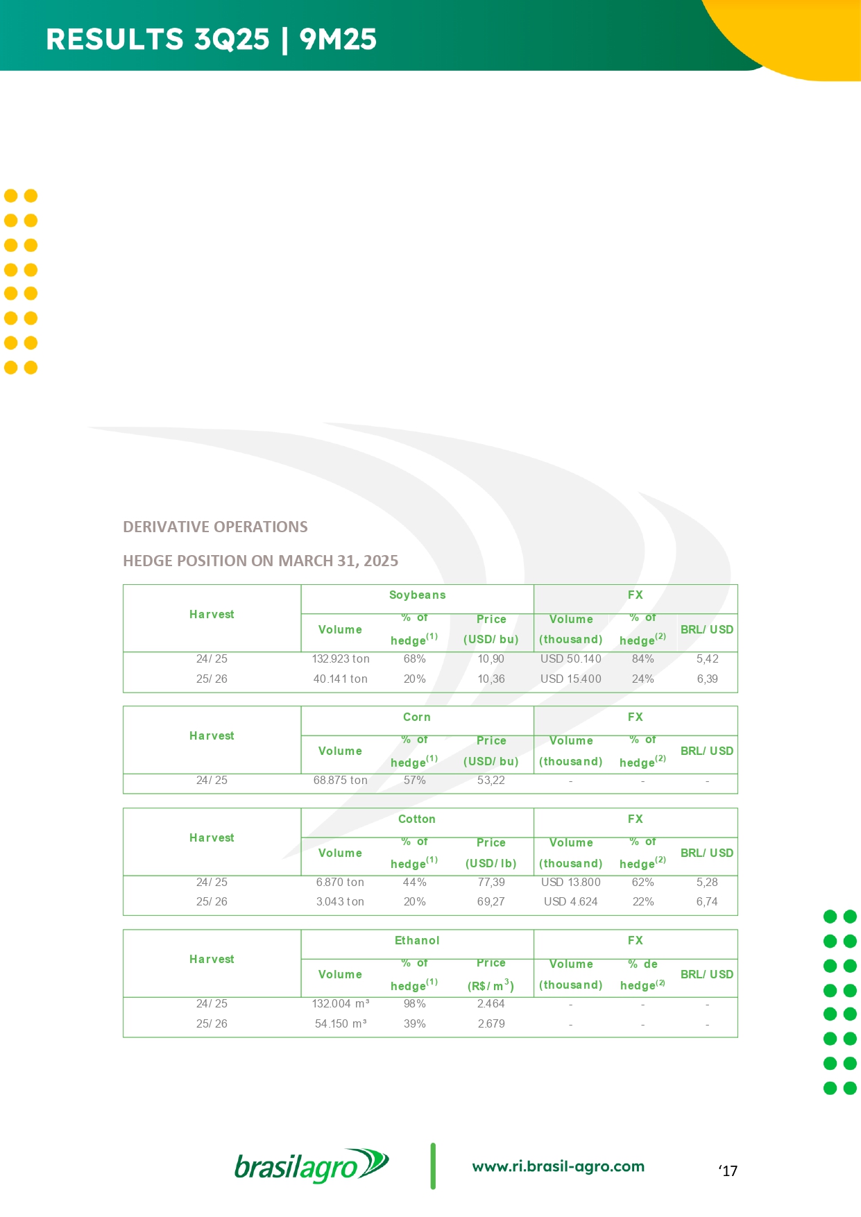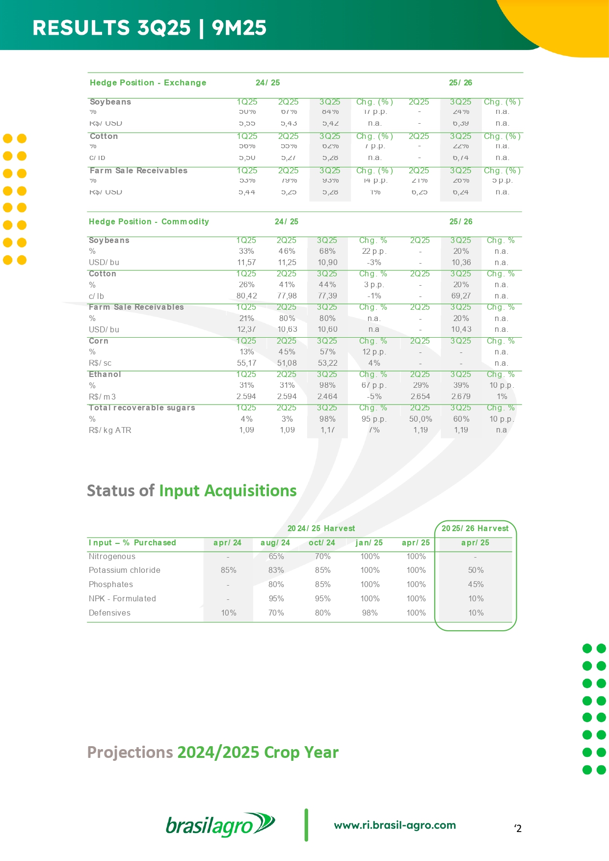 Status of Input Acquisitions Projections 2024/2025 Crop Year 25/ 26 Hedge Position - Exchange 24 / 25 Chg . (% ) 3Q25 2Q25 Chg . (% ) 3Q25 2Q25 1Q25 Soybeans n.a. 24% 84% 17 p.p. - 67% 50% % n.a. 6,39 n.a. - 5,42 5,43 5,55 R$/ USD Chg . (% ) 3Q25 2Q25 Chg . (% ) 3Q25 2Q25 1Q25 Cotton n.a. 22% 62% 7 p.p. - 55% 56% % n.a. 6,74 n.a. - 5,28 5,27 5,50 c/ lb Chg . (% ) 3Q25 2Q25 Chg . (% ) 3Q25 2Q25 1Q25 Farm Sale Receivables 5 p.p. 26% 93% 21% 14 p.p. 79% 53% % n.a. 6,24 6,25 1% 5,28 5,25 5,44 R$/ USD 25/ 26 24 / 25 Hedge Position - Commodity Chg . % 3Q25 2Q25 Chg . % 3Q25 2Q25 1Q25 Soybeans n.a. 20% - 22 p.p. 68% 46% 33% % n.a. 10,36 - - 3% 10,90 11,25 11,57 USD/ bu Chg . % 3Q25 2Q25 Chg . % 3Q25 2Q25 1Q25 Cotton n.a. 20% - 3 p.p. 44% 41% 26% % n.a. 69,27 - - 1% 77,39 77,98 80,42 c/ lb Chg . % 3Q25 2Q25 Chg . % 3Q25 2Q25 1Q25 Farm Sale Receivables n.a. 20% - n.a. 80% 80% 21% % n.a. 10,43 - n.a 10,60 10,63 12,37 USD/ bu Chg . % 3Q25 2Q25 Chg . % 3Q25 2Q25 1Q25 Corn n.a. - - 12 p.p. 57% 45% 13% % n.a. - - 4% 53,22 51,08 55,17 R$/ sc Chg . % 3Q25 2Q25 Chg . % 3Q25 2Q25 1Q25 Ethanol 10 p.p. 39% 29% 67 p.p. 98% 31% 31% % 1% 2.679 2.654 - 5% 2.464 2.594 2.594 R$/ m 3 Chg . % 3Q25 2Q25 Chg . % 3Q25 2Q25 1Q25 Total recoverable sugars 10 p.p. 60% 50,0% 95 p.p. 98% 3% 4% % n.a 1,19 1,19 7% 1,17 1,09 1,09 R$/ kg ATR 20 25/ 26 Harvest 20 24 / 25 Harvest apr/ 25 apr/ 25 jan/ 25 oct/ 24 aug/ 24 apr/ 24 I nput – % Purchased - 100% 100% 70% 65% - Nitrogenous 50% 100% 100% 85% 83% 85% Potassium chloride 45% 100% 100% 85% 80% - Phosphates 10% 100% 100% 95% 95% - NPK - Formulated 10% 100% 98% 80% 70% 10% Def ensiv es ‘ 2