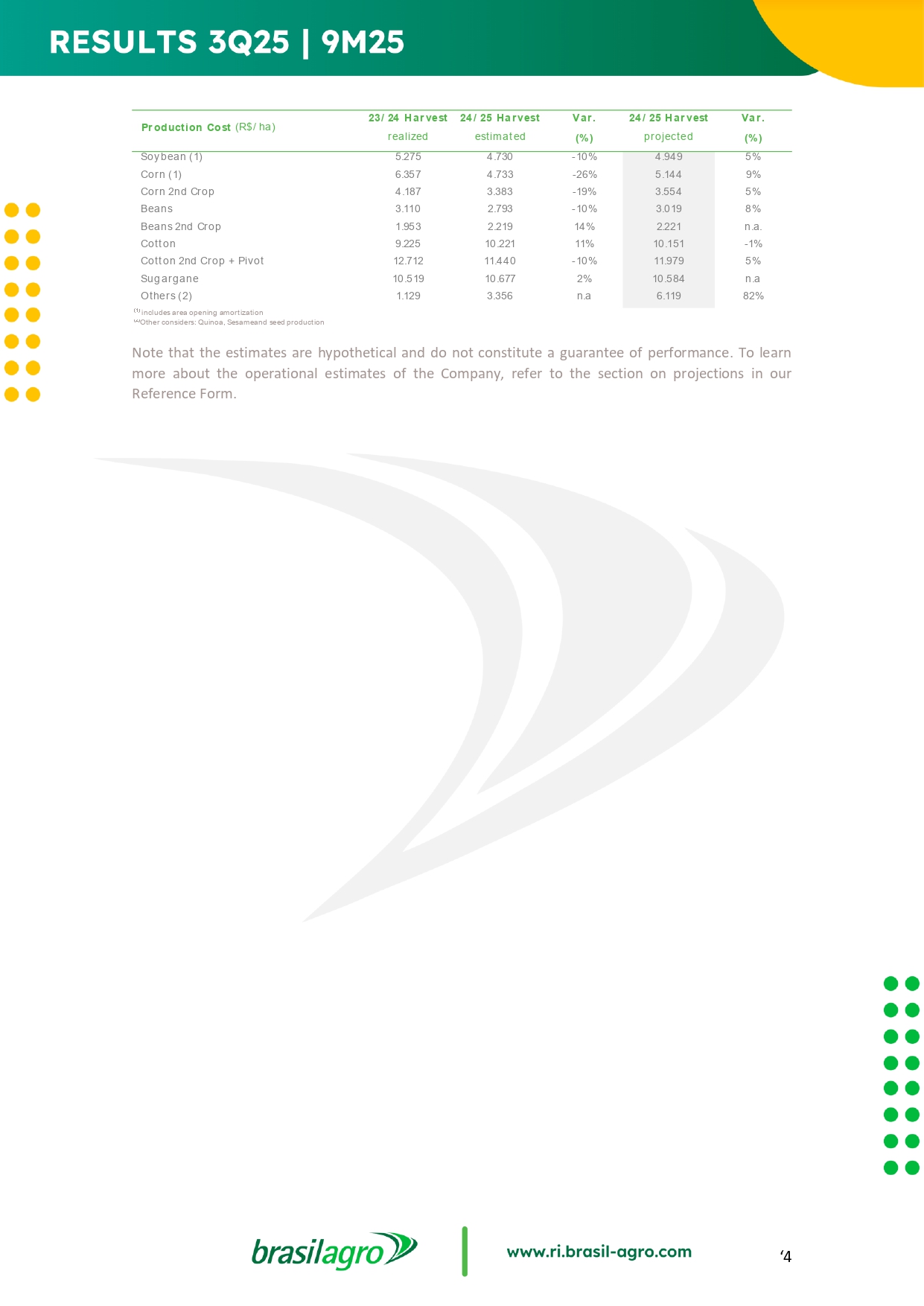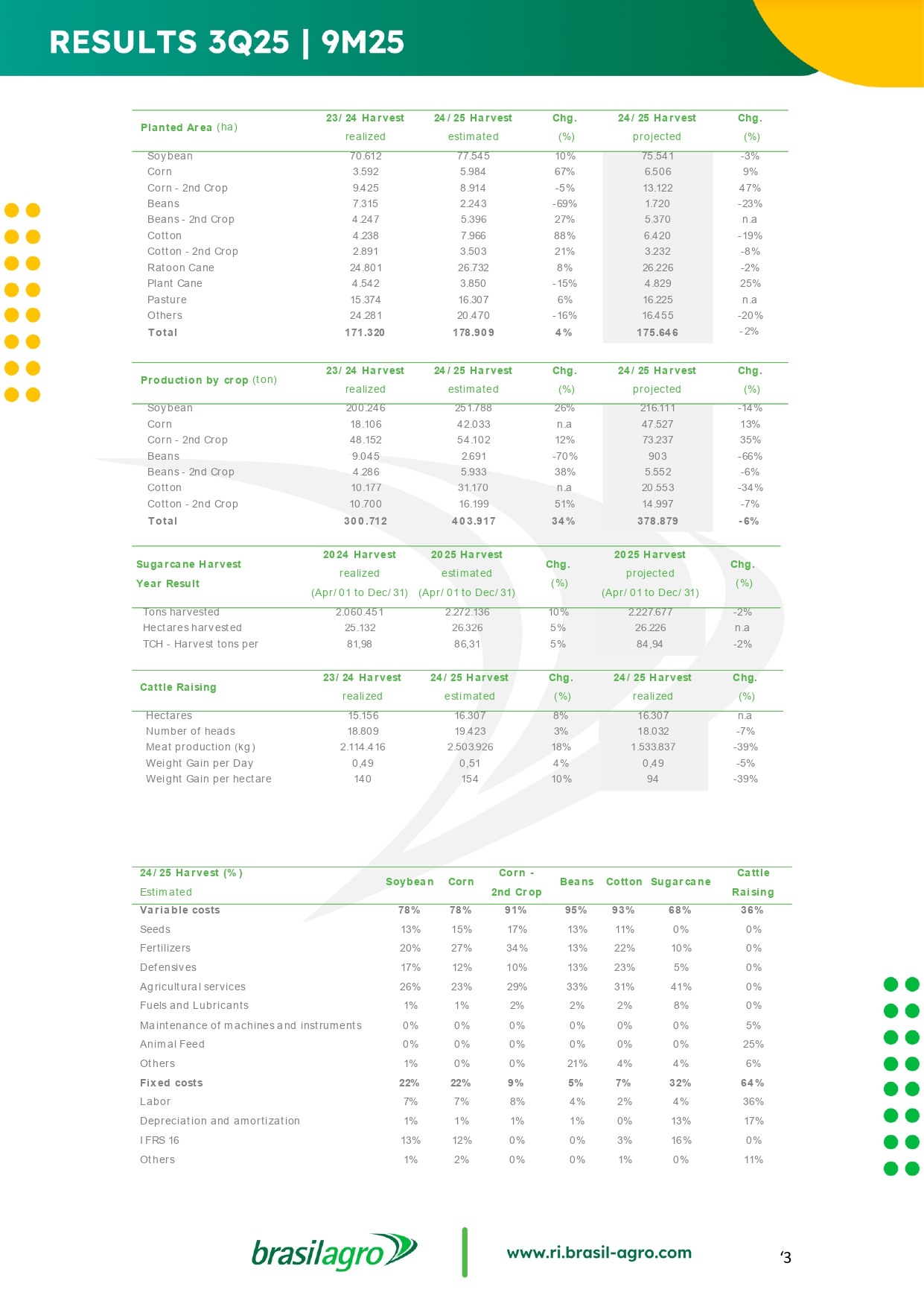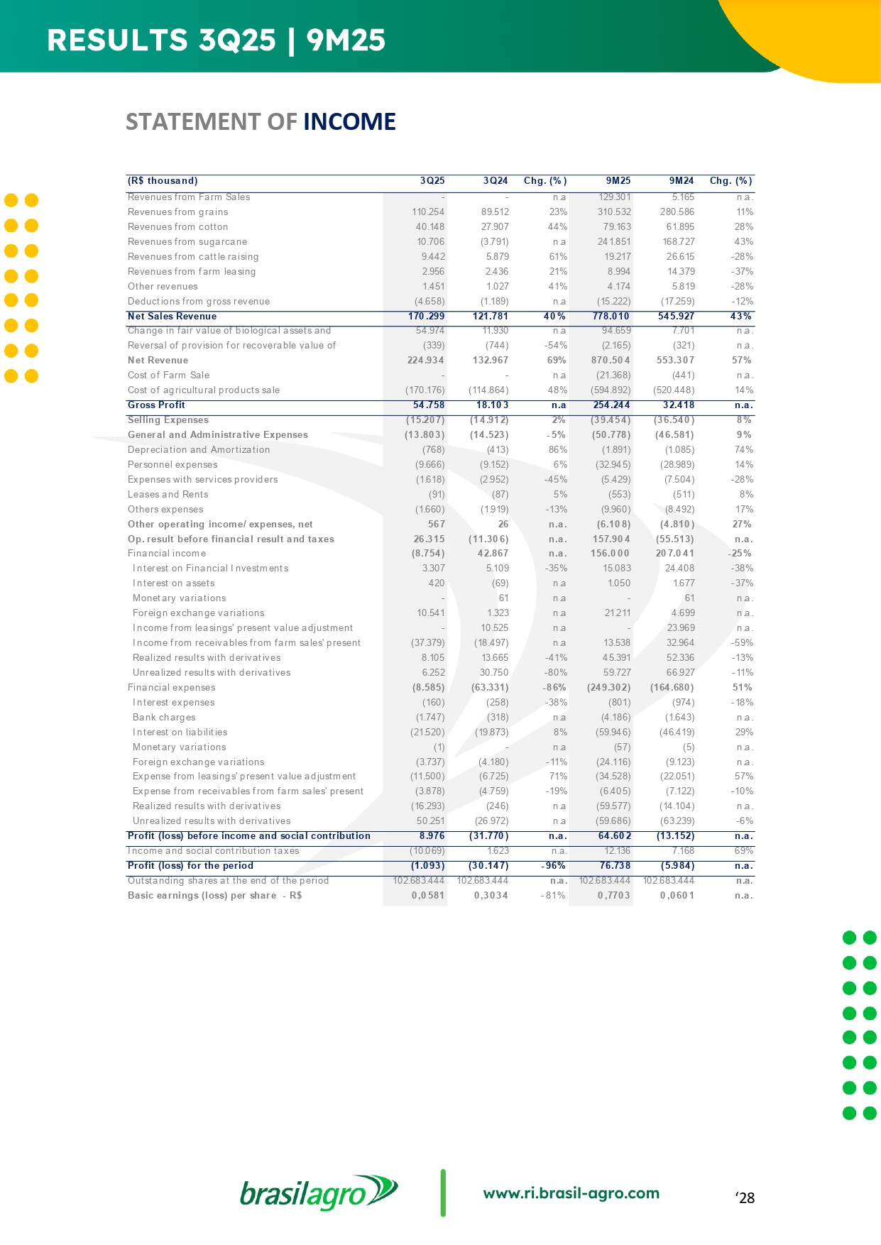 STATEMENT OF INCOME (R$ thousand) 3Q25 3Q24 Chg. (% ) 9M25 9M24 Chg. (% ) 5.165 n.a. 129.301 - n.a - Revenues f rom Farm Sales 280.586 11% 310.532 89.512 23% 110.254 Revenues f rom grains 61.895 28% 79.163 27.907 44% 40.148 Revenues f rom cotton 168.727 43% 241.851 (3.791) n.a 10.706 Revenues f rom sugarcane 26.615 - 28% 19.217 5.879 61% 9.442 Revenues f rom cattle raising 14.379 - 37% 8.994 2.436 21% 2.956 Revenues f rom farm leasing 5.819 - 28% 4.174 1.027 41% 1.451 Other revenues (17.259) - 12% (15.222) (1.189) n.a (4.658) Deductions f rom gross revenue 43% 545.927 778.0 10 40 % 121.781 170 .299 Net Sales Revenue 7.701 n.a. 94.659 11.930 n.a 54.974 Change in fair value of biological assets and (321) n.a. (2.165) (744) - 54% (339) Reversal of provision for recoverable value of 553.30 7 57% 870 .50 4 132.967 69% 224 .934 Net Revenue (441) n.a. (21.368) - n.a - Cost of Farm Sale (520.448) 14% (594.892) (114.864) 48% (170.176) Cost of agricultural products sale n.a. 32.418 254 .244 n.a 18.10 3 54 .758 Gross Profit (36.540 ) 8% (39.454 ) (14 .912) 2% (15.20 7) Selling Expenses (46.581) 9% (50 .778) (14 .523) - 5% (13.80 3) General and Administrative Expenses (1.085) 74% (1.891) (413) 86% (768) Depreciation and Amortizat ion (28.989) 14% (32.945) (9.152) 6% (9.666) Personnel expenses (7.504) - 28% (5.429) (2.952) - 45% (1.618) Expenses with services providers (511) 8% (553) (87) 5% (91) Leases and Rents (8.492) 17% (9.960) (1.919) - 13% (1.660) Others expenses (4 .810 ) 27% (6.10 8) 26 n.a. 567 Other operating income/ expenses, net (55.513) n.a. 157.90 4 (11.30 6) n.a. 26.315 Op. result before financial result and taxes 20 7.0 41 - 25% 156.0 0 0 42.867 n.a. (8.754 ) Financial income 24.408 - 38% 15.083 5.109 - 35% 3.307 I nterest on Financial I nvestments 1.677 - 37% 1.050 (69) n.a 420 I nterest on assets 61 n.a. - 61 n.a - Monetary variations 4.699 n.a. 21.211 1.323 n.a 10.541 Foreign exchange variations 23.969 n.a. - 10.525 n.a - I ncome f rom leasings' present value adjustment 32.964 - 59% 13.538 (18.497) n.a (37.379) I ncome f rom receivables f rom farm sales' present 52.336 - 13% 45.391 13.665 - 41% 8.105 Realized results with derivatives 66.927 - 11% 59.727 30.750 - 80% 6.252 Unrealized results with derivatives (164 .680 ) 51% (249.302) (63.331) - 86% (8.585) Financial expenses (974) - 18% (801) (258) - 38% (160) I nterest expenses (1.643) n.a. (4.186) (318) n.a (1.747) Bank charges (46.419) 29% (59.946) (19.873) 8% (21.520) I nterest on liabilities (5) n.a. (57) - n.a (1) Monetary variations (9.123) n.a. (24.116) (4.180) - 11% (3.737) Foreign exchange variations (22.051) 57% (34.528) (6.725) 71% (11.500) Expense f rom leasings' present value adjustment (7.122) - 10% (6.405) (4.759) - 19% (3.878) Expense f rom receivables f rom farm sales' present (14.104) n.a. (59.577) (246) n.a (16.293) Realized results with derivatives (63.239) - 6% (59.686) (26.972) n.a 50.251 Unrealized results with derivatives n.a. (13.152) 64 .60 2 n.a. (31.770 ) 8.976 Profit (loss) before income and social contribution 7.168 69% 12.136 n.a. 1.623 (10.069) I ncome and social contribution taxes n.a. (5.984 ) 76.738 - 96% (30 .147) (1.0 93) Profit (loss) for the period n.a. 102.683.444 102.683.444 n.a. 102.683.444 102.683.444 Outstanding shares at the end of the period n.a. 0 ,0 60 1 0 ,770 3 - 81% 0 ,30 34 0 ,0 581 Basic earnings (loss) per share - R$ ‘ 28