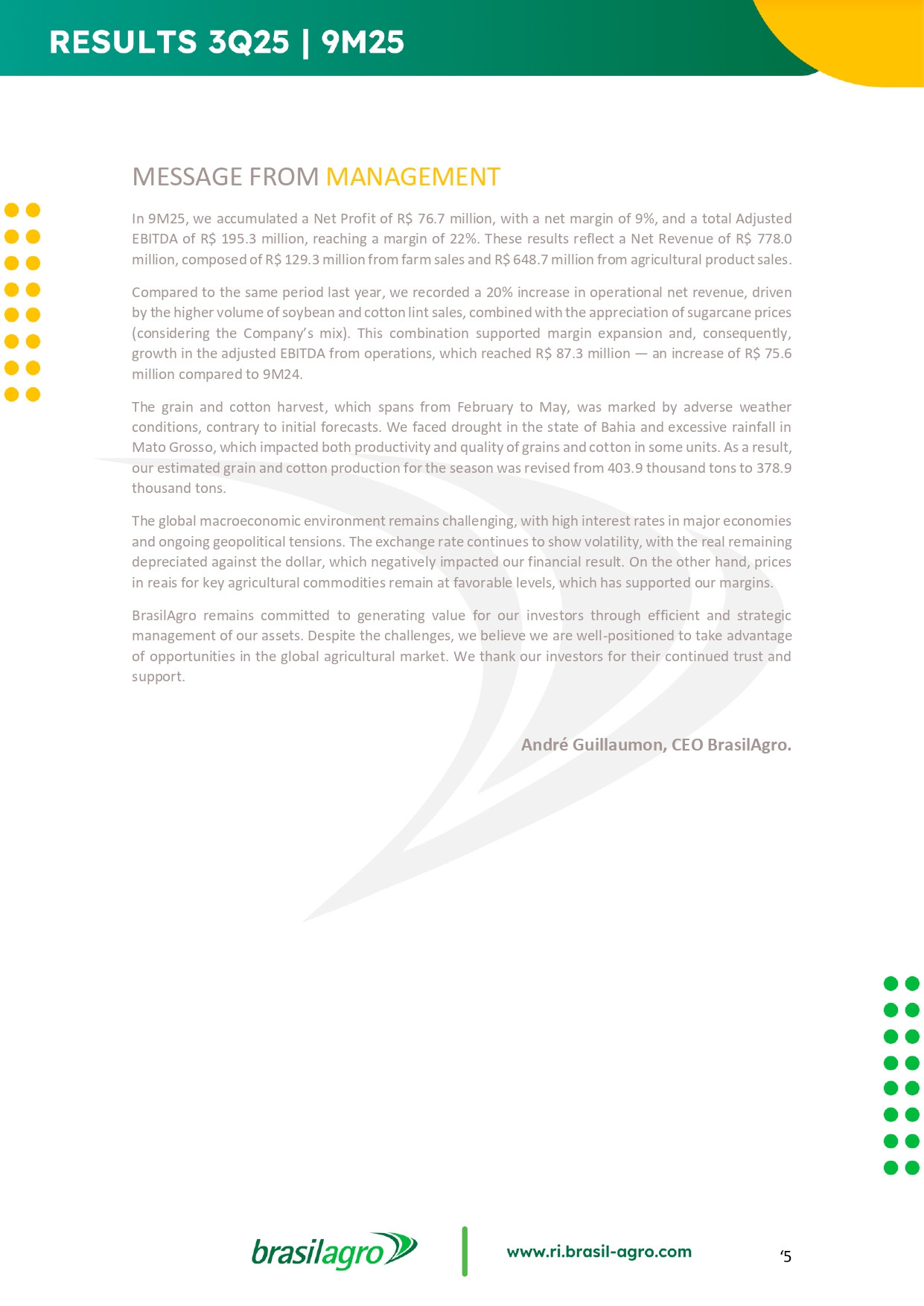 MESSAGE FROM MANAGEMENT In 9 M 25 , we accumulated a Net Profit of R $ 76 . 7 million, with a net margin of 9 % , and a total Adjusted EBITDA of R $ 195 . 3 million, reaching a margin of 22 % . These results reflect a Net Revenue of R $ 778 . 0 million, composed of R $ 129 . 3 million from farm sales and R $ 648 . 7 million from agricultural product sales . Compared to the same period last year, we recorded a 20 % increase in operational net revenue, driven by the higher volume of soybean and cotton lint sales, combined with the appreciation of sugarcane prices (considering the Company’s mix) . This combination supported margin expansion and, consequently, growth in the adjusted EBITDA from operations, which reached R $ 87 . 3 million — an increase of R $ 75 . 6 million compared to 9 M 24 . The grain and cotton harvest, which spans from February to May, was marked by adverse weather conditions, contrary to initial forecasts . We faced drought in the state of Bahia and excessive rainfall in Mato Grosso, which impacted both productivity and quality of grains and cotton in some units . As a result, our estimated grain and cotton production for the season was revised from 403 . 9 thousand tons to 378 . 9 thousand tons . The global macroeconomic environment remains challenging, with high interest rates in major economies and ongoing geopolitical tensions . The exchange rate continues to show volatility, with the real remaining depreciated against the dollar, which negatively impacted our financial result . On the other hand, prices in reais for key agricultural commodities remain at favorable levels, which has supported our margins . BrasilAgro remains committed to generating value for our investors through efficient and strategic management of our assets . Despite the challenges, we believe we are well - positioned to take advantage of opportunities in the global agricultural market . We thank our investors for their continued trust and support . ‘ 5 André Guillaumon, CEO BrasilAgro.
