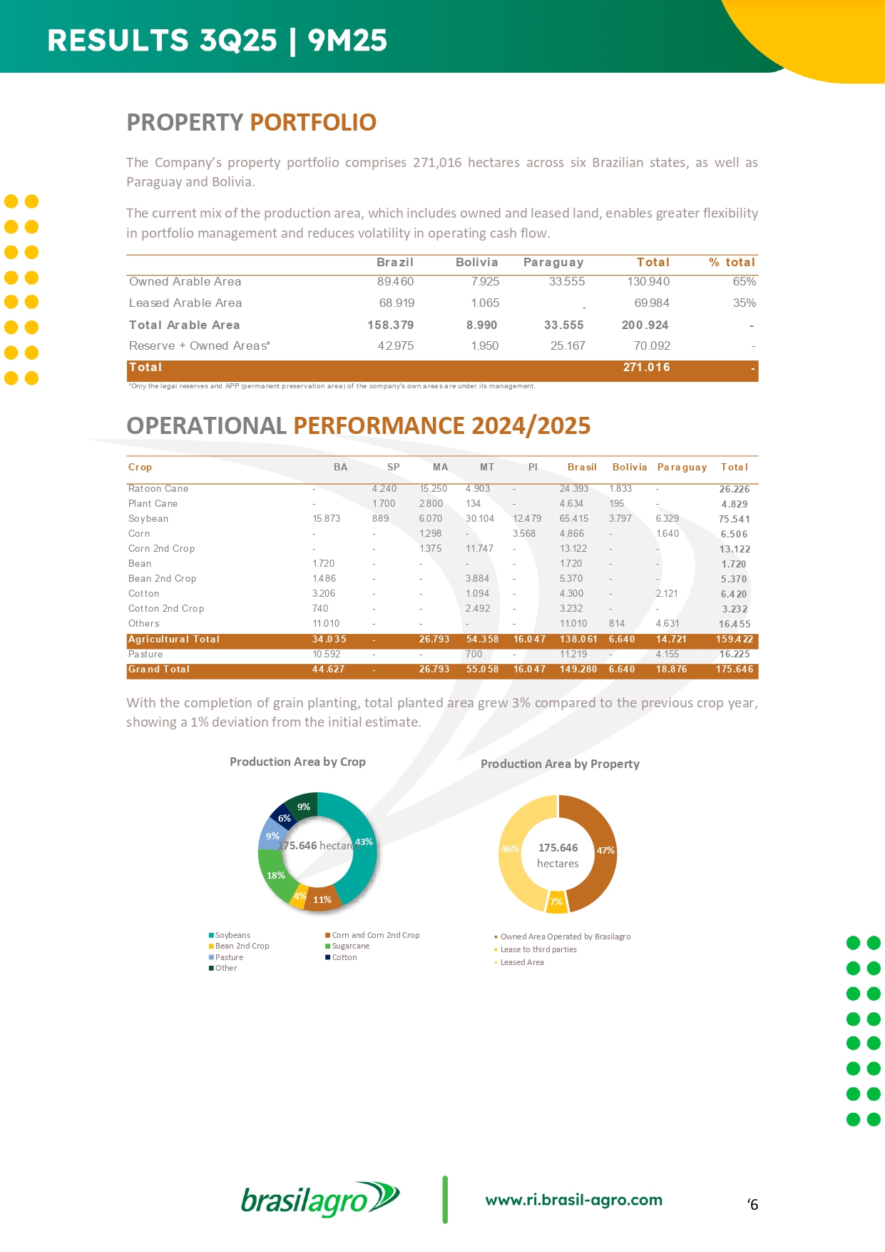 PROPERTY PORTFOLIO The Company’s property portfolio comprises 271,016 hectares across six Brazilian states, as well as Paraguay and Bolivia. The current mix of the production area, which includes owned and leased land, enables greater flexibility in portfolio management and reduces volatility in operating cash flow. OPERATIONAL PERFORMANCE 2024/2025 With the completion of grain planting, total planted area grew 3% compared to the previous crop year, showing a 1% deviation from the initial estimate. % total Total Paraguay Bolivia Brazil 65% 130.940 33.555 7.925 89.460 Owned Arable Area 35% 69.984 - 1.065 68.919 Leased Arable Area - 20 0 .924 33.555 8.990 158.379 Total Arable Area - 70.092 25.167 1.950 42.975 Reserve + Owned Areas* - 271.0 16 Total *Only the legal reser ves and APP (permanent preser vation area) of the com pany's own areas are under its management. Tota l Pa ra gua y Bolivia Bra sil PI MT MA SP BA Crop 26.226 - 1.833 24.393 - 4.903 15.250 4.240 - Ratoon Cane 4 .829 - 195 4.634 - 134 2.800 1.700 - Plant Cane 75.54 1 6.329 3.797 65.415 12.479 30.104 6.070 889 15.873 Soybean 6.50 6 1.640 - 4.866 3.568 - 1.298 - - Corn 13.122 - - 13.122 - 11.747 1.375 - - Corn 2nd Crop 1.720 - - 1.720 - - - - 1.720 Bean 5.370 - - 5.370 - 3.884 - - 1.486 Bean 2nd Crop 6.4 20 2.121 - 4.300 - 1.094 - - 3.206 Cotton 3.232 - - 3.232 - 2.492 - - 740 Cotton 2nd Crop 16.4 55 4.631 814 11.010 - - - - 11.010 Others 159.4 22 14 .721 6.64 0 138.0 61 16.0 4 7 54 .358 26.793 - 34 .0 35 Agricultura l Tota l 16.225 4.155 - 11.219 - 700 - - 10.592 Pasture 175.64 6 18.876 6.64 0 14 9.280 16.0 4 7 55.0 58 26.793 - 4 4 .627 Gra nd Tota l 43% 4% 11% 18% 9% 9% 6% Production Area by Crop Corn and Corn 2nd Crop Sugarcane Cotton Soybeans Bean 2nd Crop Pasture Other 175.646 hectares 47% 7% 46% Production Area by Property Owned Area Operated by Brasilagro Lease to third parties Leased Area ‘ 6 175.646 hectares