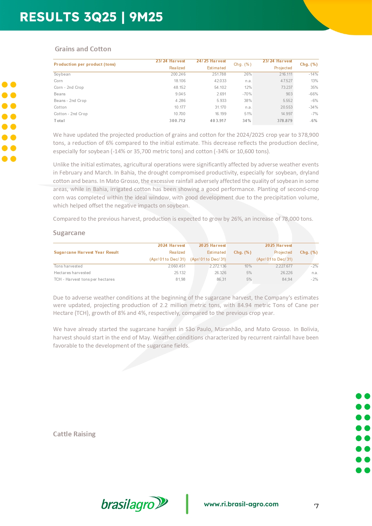 Grains and Cotton ‘ 7 We have updated the projected production of grains and cotton for the 2024 / 2025 crop year to 378 , 900 tons, a reduction of 6 % compared to the initial estimate . This decrease reflects the production decline, especially for soybean ( - 14 % or 35 , 700 metric tons) and cotton ( - 34 % or 10 , 600 tons) . Unlike the initial estimates, agricultural operations were significantly affected by adverse weather events in February and March . In Bahia, the drought compromised productivity, especially for soybean, dryland cotton and beans . In Mato Grosso, the excessive rainfall adversely affected the quality of soybean in some areas, while in Bahia, irrigated cotton has been showing a good performance . Planting of second - crop corn was completed within the ideal window, with good development due to the precipitation volume, which helped offset the negative impacts on soybean . Compared to the previous harvest, production is expected to grow by 26 % , an increase of 78 , 000 tons . Due to adverse weather conditions at the beginning of the sugarcane harvest, the Company's estimates were updated, projecting production of 2 . 2 million metric tons, with 84 . 94 metric Tons of Cane per Hectare (TCH), growth of 8 % and 4 % , respectively, compared to the previous crop year . We have already started the sugarcane harvest in São Paulo, Maranhão, and Mato Grosso . In Bolivia, harvest should start in the end of May . Weather conditions characterized by recurrent rainfall have been favorable to the development of the sugarcane fields . Cattle Raising 24 / 25 Ha rvest 23/ 24 Ha rvest 23/ 24 Ha rvest Chg. (% ) Projected Chg . (% ) Estimated Realized Production per product (tons) - 14% 216.111 26% 251.788 200.246 Soybean 13% 47.527 n.a. 42.033 18.106 Corn 35% 73.237 12% 54.102 48.152 Corn - 2nd Crop - 66% 903 - 70% 2.691 9.045 Beans - 6% 5.552 38% 5.933 4.286 Beans - 2nd Crop - 34% 20.553 n.a. 31.170 10.177 Cotton - 7% 14.997 51% 16.199 10.700 Cotton - 2nd Crop - 6% 378.879 34 % 4 0 3.917 30 0 .712 Tota l Sugarcane 20 25 Ha rvest 20 25 Ha rvest 20 24 Ha rvest Chg. (% ) Projected Chg. (% ) Estimated Realized Suga rca ne Ha rvest Yea r Result (Apr/ 01 to Dec/ 31) (Apr/ 01 to Dec/ 31) (Apr/ 01 to Dec/ 31) - 2% 2.227.677 10% 2.272.136 2.060.451 Tons harvested n.a. 26.226 5% 26.326 25.132 Hectares harvested - 2% 84,94 5% 86,31 81,98 TCH - Harvest tons per hectares