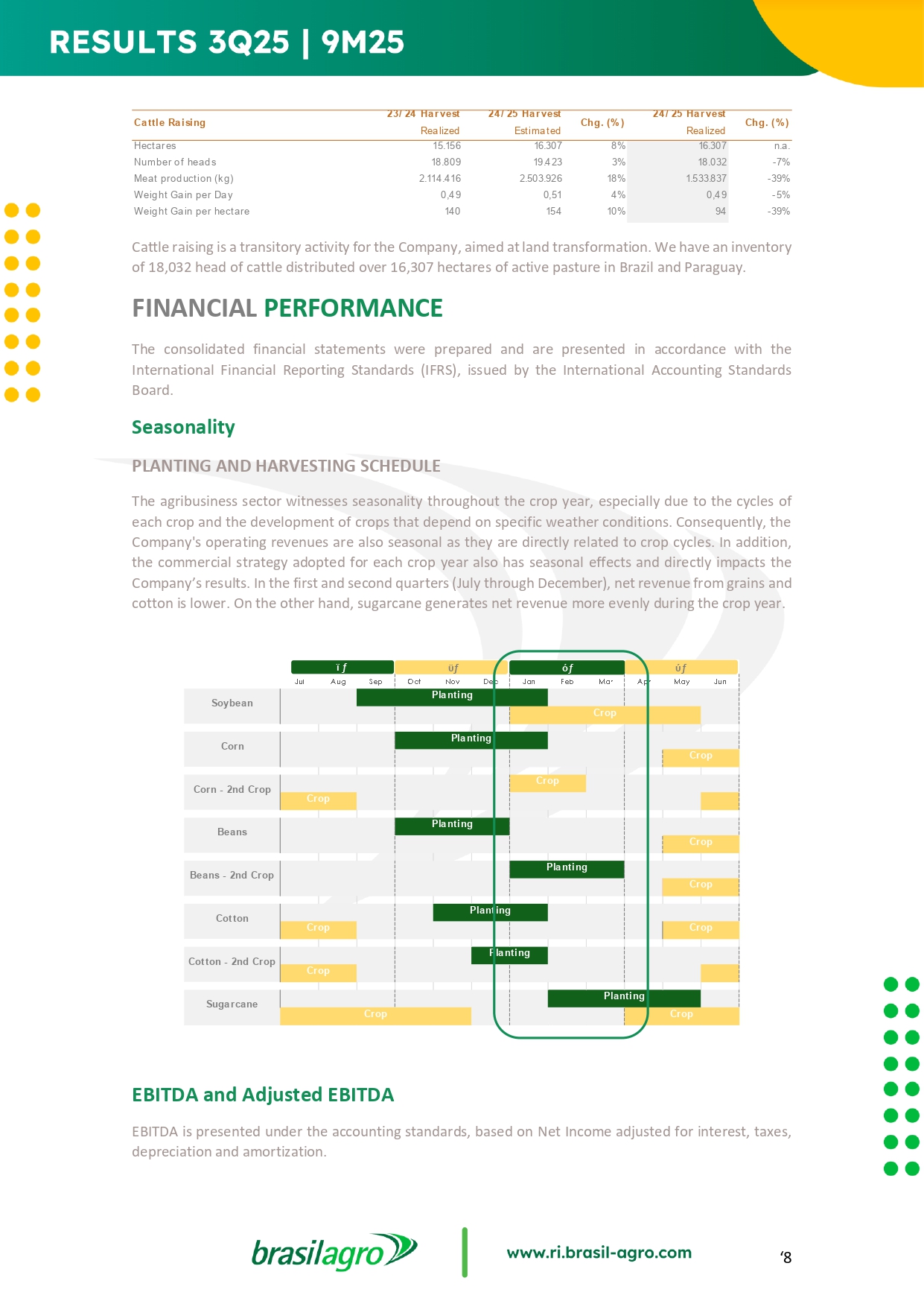 Cattle raising is a transitory activity for the Company, aimed at land transformation . We have an inventory of 18 , 032 head of cattle distributed over 16 , 307 hectares of active pasture in Brazil and Paraguay . FINANCIAL PERFORMANCE The consolidated financial statements were prepared and are presented in accordance with the International Financial Reporting Standards (IFRS), issued by the International Accounting Standards Board . Seasonality PLANTING AND HARVESTING SCHEDULE The agribusiness sector witnesses seasonality throughout the crop year, especially due to the cycles of each crop and the development of crops that depend on specific weather conditions . Consequently, the Company's operating revenues are also seasonal as they are directly related to crop cycles . In addition, the commercial strategy adopted for each crop year also has seasonal effects and directly impacts the Company’s results . In the first and second quarters (July through December), net revenue from grains and cotton is lower . On the other hand, sugarcane generates net revenue more evenly during the crop year . EBITDA and Adjusted EBITDA EBITDA is presented under the accounting standards, based on Net Income adjusted for interest, taxes, depreciation and amortization. 24 / 25 Ha rvest 24 / 25 Ha rvest Chg. (% ) Chg. (% ) 23/ 24 Ha rvest Ca ttle Ra ising Realized Estimated Realized n.a. 16.307 8% 16.307 15.156 Hectares - 7% 18.032 3% 19.423 18.809 Number of heads - 39% 1.533.837 18% 2.503.926 2.114.416 Meat production (kg) - 5% 0,49 4% 0,51 0,49 Weight Gain per Day - 39% 94 10% 154 140 Weight Gain per hectare Jul Sep Oct Dec Jan Mar Apr Jun Crop Sugarcane Planting Crop Crop Planting Cotton - 2nd Crop Crop Cotton Planting Crop Beans Beans - 2nd Crop Planting Planting Crop Crop Crop Corn - 2nd Crop Crop Corn Planting Soybean Planting Crop Crop ïf Aug óf Feb üf Nov úf May ‘ 8