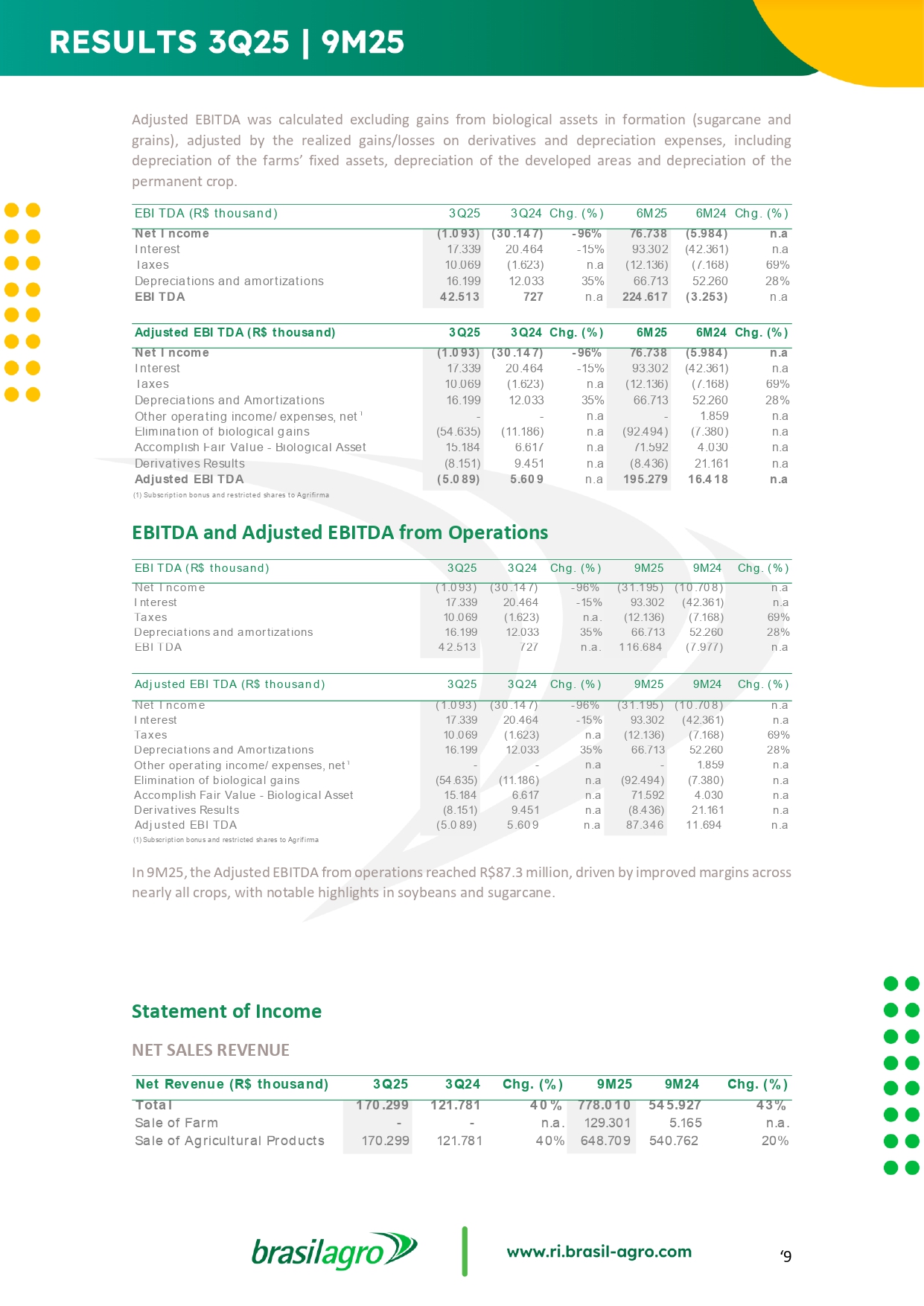 Adjusted EBITDA was calculated excluding gains from biological assets in formation (sugarcane and grains), adjusted by the realized gains/losses on derivatives and depreciation expenses, including depreciation of the farms’ fixed assets, depreciation of the developed areas and depreciation of the permanent crop . EBITDA and Adjusted EBITDA from Operations In 9M25, the Adjusted EBITDA from operations reached R$87.3 million, driven by improved margins across nearly all crops, with notable highlights in soybeans and sugarcane. Statement of Income NET SALES REVENUE Chg. (% ) 6M24 6M25 Chg. (% ) 3Q24 3Q25 EBI TDA (R$ t hou sa nd) n.a (5.984 ) 76.738 - 96% (30 .14 7) (1.0 93) Net I ncome n.a (42.361) 93.302 - 15% 20.464 17.339 I nterest 69% (7.168) (12.136) n.a (1.623) 10.069 Taxes 28% 52.260 66.713 35% 12.033 16.199 Depreciations and amortizations n.a (3.253) 224 .617 n.a 727 4 2.513 EBI TDA Chg. (% ) 6M24 6M25 Chg. (% ) 3Q24 3Q25 Adjusted EBI TDA (R$ thousand) n.a (5.984 ) 76.738 - 96% (30 .14 7) (1.0 93) Net I ncome n.a (42.361) 93.302 - 15% 20.464 17.339 I nterest 69% (7.168) (12.136) n.a (1.623) 10.069 Taxes 28% 52.260 66.713 35% 12.033 16.199 Depreciations and Amortizations n.a 1.859 - n.a - - Other operating income/ expenses, net 1 n.a (7.380) (92.494) n.a (11.186) (54.635) Elimination of biological gains n.a 4.030 71.592 n.a 6.617 15.184 Accomplish Fair Value - Biological Asset n.a 21.161 (8.436) n.a 9.451 (8.151) Derivatives Results n.a 16.4 18 195.279 n.a 5.60 9 (5.0 89) Adjusted EBI TDA (1) Sub scrip t ion bonus and restricted sha res to Agrifirma Chg. (% ) 9M24 9M25 Chg. (% ) 3Q24 3Q25 EBI TDA (R$ t hou sa nd) n.a (10 .70 8) (31.195) - 96% (30 .14 7) (1.0 93) Net I ncom e n.a (42.361) 93.302 - 15% 20.464 17.339 I nterest 69% (7.168) (12.136) n.a. (1.623) 10.069 Taxes 28% 52.260 66.713 35% 12.033 16.199 Depreciations and amortizations n.a (7.977) 116.684 n.a. 727 4 2.513 EBI TDA Chg. (% ) 9M24 9M25 Chg. (% ) 3Q24 3Q25 Adjust ed EBI TDA (R$ t hou sa nd) n.a (10 .70 8) (31.195) - 96% (30 .14 7) (1.0 93) Net I ncom e n.a (42.361) 93.302 - 15% 20.464 17.339 I nterest 69% (7.168) (12.136) n.a (1.623) 10.069 Taxes 28% 52.260 66.713 35% 12.033 16.199 Depreciations and Amortizations n.a 1.859 - n.a - - Other operating income/ expenses, net 1 n.a (7.380) (92.494) n.a (11.186) (54.635) Elimination of biological gains n.a 4.030 71.592 n.a 6.617 15.184 Accomplish Fair Value - Biological Asset n.a 21.161 (8.436) n.a 9.451 (8.151) Derivatives Results n.a 11.694 87.34 6 n.a 5.60 9 (5.0 89) Adjust ed EBI TDA (1) Sub scrip t ion bonus and restricted sha res to Agrifirma Net Revenue (R$ thousand) 3Q25 3Q24 Chg. (% ) 9M25 9M24 Chg. (% ) 54 5.927 4 3% 778.0 10 4 0 % 121.781 170 .299 Total 5.165 n.a. 129.301 n.a. - - Sale of Farm 540.762 20% 648.709 40% 121.781 170.299 Sale of Agricultural Products ‘ 9