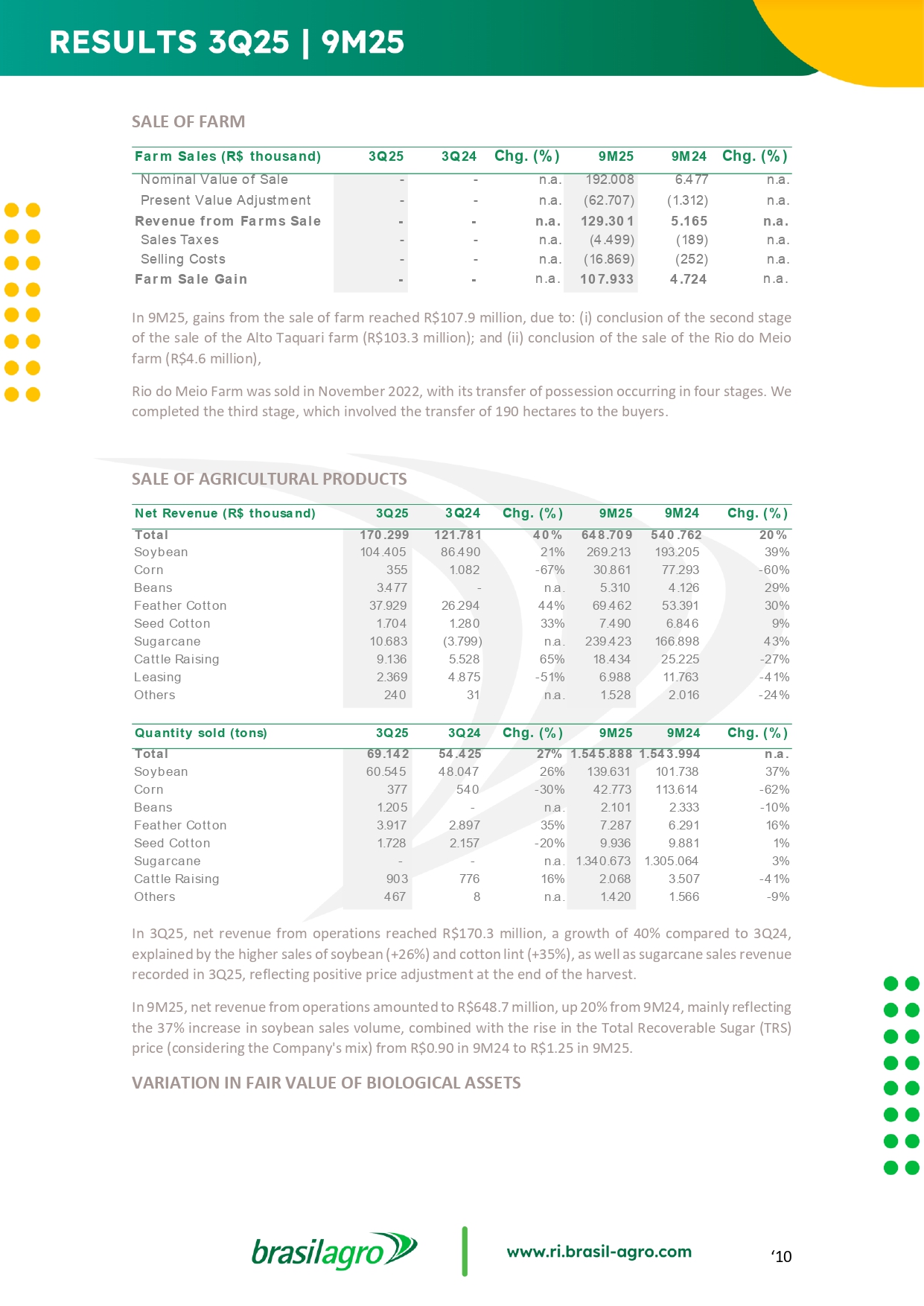 SALE OF FARM In 9 M 25 , gains from the sale of farm reached R $ 107 . 9 million, due to : (i) conclusion of the second stage of the sale of the Alto Taquari farm (R $ 103 . 3 million) ; and (ii) conclusion of the sale of the Rio do Meio farm (R $ 4 . 6 million), Rio do Meio Farm was sold in November 2022 , with its transfer of possession occurring in four stages . We completed the third stage, which involved the transfer of 190 hectares to the buyers . SALE OF AGRICULTURAL PRODUCTS In 3 Q 25 , net revenue from operations reached R $ 170 . 3 million, a growth of 40 % compared to 3 Q 24 , explained by the higher sales of soybean (+ 26 % ) and cotton lint (+ 35 % ), as well as sugarcane sales revenue recorded in 3 Q 25 , reflecting positive price adjustment at the end of the harvest . In 9 M 25 , net revenue from operations amounted to R $ 648 . 7 million, up 20 % from 9 M 24 , mainly reflecting the 37 % increase in soybean sales volume, combined with the rise in the Total Recoverable Sugar (TRS) price (considering the Company's mix) from R $ 0 . 90 in 9 M 24 to R $ 1 . 25 in 9 M 25 . VARIATION IN FAIR VALUE OF BIOLOGICAL ASSETS 9M24 Chg. (% ) 9M25 3Q24 Chg. (% ) 3Q25 Fa rm Sa les (R$ thousa nd) 6.477 n.a. 192.008 - n.a. - Nominal Value of Sale (1.312) n.a. (62.707) - n.a. - Present Value Adjustment 5.165 n.a . 129.30 1 - n.a . - Revenue from Fa rms Sa le (189) n.a. (4.499) - n.a. - Sales Taxes (252) n.a. (16.869) - n.a. - Selling Costs 4 .724 n .a . 10 7.933 - n .a . - Fa rm Sa le Ga in Chg. (% ) 9M24 9M25 Chg. (% ) 3 Q24 3Q25 Net Revenue (R$ thousa nd) 20 % 54 0 .762 64 8.70 9 4 0 % 121.781 170 .299 Total 39% 193.205 269.213 21% 86.490 104.405 Soybean - 60% 77.293 30.861 - 67% 1.082 355 Corn 29% 4.126 5.310 n.a. - 3.477 Beans 30% 53.391 69.462 44% 26.294 37.929 Feather Cotton 9% 6.846 7.490 33% 1.280 1.704 Seed Cotton 43% 166.898 239.423 n.a. (3.799) 10.683 Sugarcane - 27% 25.225 18.434 65% 5.528 9.136 Cattle Raising - 41% 11.763 6.988 - 51% 4.875 2.369 Leasing - 24% 2.016 1.528 n.a. 31 240 Others Chg. (% ) 9M24 9M25 Chg. (% ) 3Q24 3Q25 Qua ntity sold (tons) n.a . 27% 1.54 5.888 1.54 3.994 54 .4 25 69.14 2 Total 37% 101.738 139.631 26% 48.047 60.545 Soybean - 62% 113.614 42.773 - 30% 540 377 Corn - 10% 2.333 2.101 n.a. - 1.205 Beans 16% 6.291 7.287 35% 2.897 3.917 Feather Cotton 1% 9.881 9.936 - 20% 2.157 1.728 Seed Cotton 3% 1.305.064 1.340.673 n.a. - - Sugarcane - 41% 3.507 2.068 16% 776 903 Cattle Raising - 9% 1.566 1.420 n.a. 8 467 Others ‘ 10
