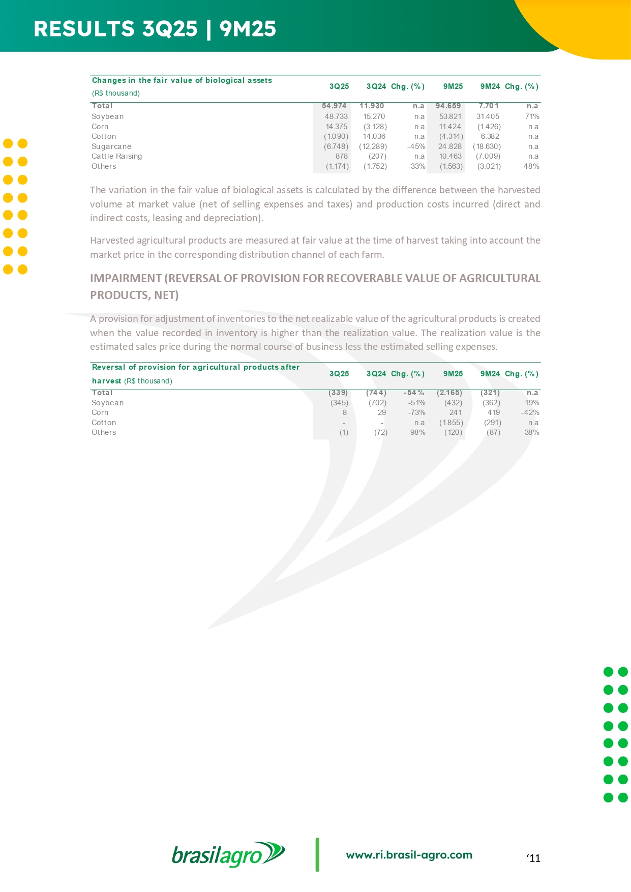 The variation in the fair value of biological assets is calculated by the difference between the harvested volume at market value (net of selling expenses and taxes) and production costs incurred (direct and indirect costs, leasing and depreciation) . Harvested agricultural products are measured at fair value at the time of harvest taking into account the market price in the corresponding distribution channel of each farm . IMPAIRMENT (REVERSAL OF PROVISION FOR RECOVERABLE VALUE OF AGRICULTURAL PRODUCTS, NET) A provision for adjustment of inventories to the net realizable value of the agricultural products is created when the value recorded in inventory is higher than the realization value . The realization value is the estimated sales price during the normal course of business less the estimated selling expenses . ‘ 11 Changes in the fair value of biological assets 9M24 Chg. (% ) 9M25 3Q24 Chg. (% ) 3Q25 (R$ thousand) n.a 7.70 1 94 .659 n.a 11.930 54 .974 Total 71% 31.405 53.821 n.a 15.270 48.733 Soybean n.a (1.426) 11.424 n.a (3.128) 14.375 Corn n.a 6.382 (4.314) n.a 14.036 (1.090) Cotton n.a (18.630) 24.828 - 45% (12.289) (6.748) Sugarcane n.a (7.009) 10.463 n.a (207) 878 Cattle Raising - 48% (3.021) (1.563) - 33% (1.752) (1.174) Others Reversal of provision for agricultural products after 9M24 Chg. (% ) 9M25 3Q24 Chg. (% ) 3Q25 harvest (R$ thousand) n.a (321) (2.165) - 54 % (74 4 ) (339) Total 19% (362) (432) - 51% (702) (345) Soybean - 42% 419 241 - 73% 29 8 Corn n.a (291) (1.855) n.a - - Cotton 38% (87) (120) - 98% (72) (1) Others