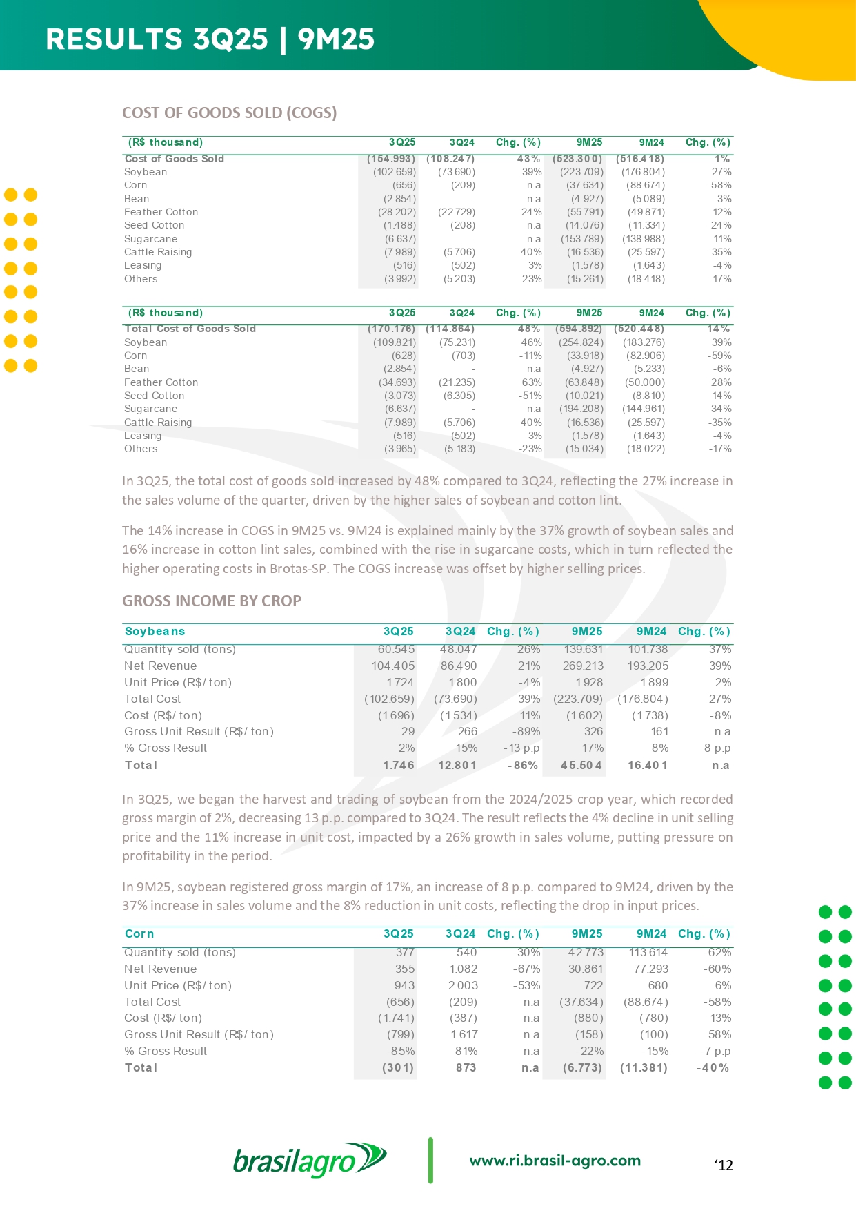 COST OF GOODS SOLD (COGS) ‘ 12 In 3 Q 25 , the total cost of goods sold increased by 48 % compared to 3 Q 24 , reflecting the 27 % increase in the sales volume of the quarter, driven by the higher sales of soybean and cotton lint . The 14 % increase in COGS in 9 M 25 vs . 9 M 24 is explained mainly by the 37 % growth of soybean sales and 16 % increase in cotton lint sales, combined with the rise in sugarcane costs, which in turn reflected the higher operating costs in Brotas - SP . The COGS increase was offset by higher selling prices . In 3 Q 25 , we began the harvest and trading of soybean from the 2024 / 2025 crop year, which recorded gross margin of 2 % , decreasing 13 p . p . compared to 3 Q 24 . The result reflects the 4 % decline in unit selling price and the 11 % increase in unit cost, impacted by a 26 % growth in sales volume, putting pressure on profitability in the period . In 9 M 25 , soybean registered gross margin of 17 % , an increase of 8 p . p . compared to 9 M 24 , driven by the 37 % increase in sales volume and the 8 % reduction in unit costs, reflecting the drop in input prices . Chg. (% ) 9M24 9M25 Chg. (% ) 3Q24 3Q25 (R$ thousand) 1% (516.4 18) (523 .30 0 ) 4 3% (10 8.24 7) (154 .993) Cost of Goods Sold 27% (176.804) (223.709) 39% (73.690) (102.659) Soybean - 58% (88.674) (37.634) n.a (209) (656) Corn - 3% (5.089) (4.927) n.a - (2.854) Bean 12% (49.871) (55.791) 24% (22.729) (28.202) Feather Cotton 24% (11.334) (14.076) n.a (208) (1.488) Seed Cotton 11% (138.988) (153.789) n.a - (6.637) Sugarcane - 35% (25.597) (16.536) 40% (5.706) (7.989) Cattle Raising - 4% (1.643) (1.578) 3% (502) (516) Leasing - 17% (18.418) (15.261) - 23% (5.203) (3.992) Others Chg. (% ) 9M24 9M25 Chg. (% ) 3Q24 3Q25 (R$ thousand) 14 % (520 .4 4 8) (594 .892) 4 8% (114 .864 ) (170 .176) Total Cost of Goods Sold 39% (183.276) (254.824) 46% (75.231) (109.821) Soybean - 59% (82.906) (33.918) - 11% (703) (628) Corn - 6% (5.233) (4.927) n.a - (2.854) Bean 28% (50.000) (63.848) 63% (21.235) (34.693) Feather Cotton 14% (8.810) (10.021) - 51% (6.305) (3.073) Seed Cotton 34% (144.961) (194.208) n.a - (6.637) Sugarcane - 35% (25.597) (16.536) 40% (5.706) (7.989) Cattle Raising - 4% (1.643) (1.578) 3% (502) (516) Leasing - 17% (18.022) (15.034) - 23% (5.183) (3.965) Others GROSS INCOME BY CROP Chg. (% ) 9M24 9M25 Chg. (% ) 3Q24 3Q25 Soybea ns 37% 101.738 139.631 26% 48.047 60.545 Quant ity sold (tons) 39% 193.205 269.213 21% 86.490 104.405 Net Revenue 2% 1.899 1.928 - 4% 1.800 1.724 Unit Price (R$/ ton) 27% (176.804) (223.709) 39% (73.690) (102.659) Total Cost - 8% (1.738) (1.602) 11% (1.534) (1.696) Cost (R$/ ton) n.a 161 326 - 89% 266 29 Gross Unit Result (R$/ ton) 8 p.p 8% 17% - 13 p.p 15% 2% % Gross Result n.a 16.4 0 1 4 5.50 4 - 86% 12.80 1 1.74 6 Tota l Chg. (% ) 9M24 9M25 Chg. (% ) 3Q24 3Q25 Corn - 62% 113.614 42.773 - 30% 540 377 Quant ity sold (tons) - 60% 77.293 30.861 - 67% 1.082 355 Net Revenue 6% 680 722 - 53% 2.003 943 Unit Price (R$/ ton) - 58% (88.674) (37.634) n.a (209) (656) Total Cost 13% (780) (880) n.a (387) (1.741) Cost (R$/ ton) 58% (100) (158) n.a 1.617 (799) Gross Unit Result (R$/ ton) - 7 p.p - 15% - 22% n.a 81% - 85% % Gross Result - 4 0 % (11.381) (6.773) n.a 873 (30 1) Tota l