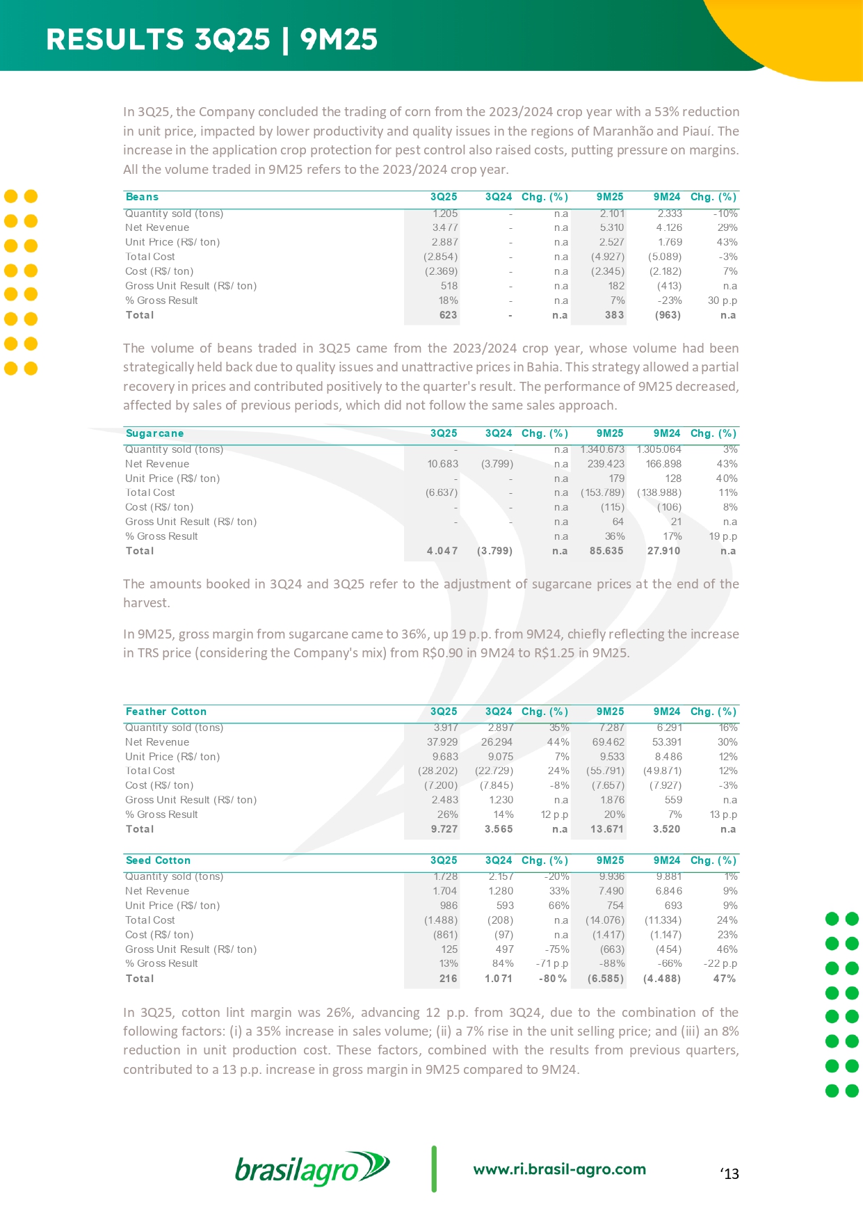 The volume of beans traded in 3 Q 25 came from the 2023 / 2024 crop year, whose volume had been strategically held back due to quality issues and unattractive prices in Bahia . This strategy allowed a partial recovery in prices and contributed positively to the quarter's result . The performance of 9 M 25 decreased, affected by sales of previous periods, which did not follow the same sales approach . The amounts booked in 3Q24 and 3Q25 refer to the adjustment of sugarcane prices at the end of the harvest. In 9M25, gross margin from sugarcane came to 36%, up 19 p.p. from 9M24, chiefly reflecting the increase in TRS price (considering the Company's mix) from R$0.90 in 9M24 to R$1.25 in 9M25. In 3 Q 25 , cotton lint margin was 26 % , advancing 12 p . p . from 3 Q 24 , due to the combination of the following factors : (i) a 35 % increase in sales volume ; (ii) a 7 % rise in the unit selling price ; and (iii) an 8 % reduction in unit production cost . These factors, combined with the results from previous quarters, contributed to a 13 p . p . increase in gross margin in 9 M 25 compared to 9 M 24 . In 3 Q 25 , the Company concluded the trading of corn from the 2023 / 2024 crop year with a 53 % reduction in unit price, impacted by lower productivity and quality issues in the regions of Maranhão and Piauí . The increase in the application crop protection for pest control also raised costs, putting pressure on margins . All the volume traded in 9 M 25 refers to the 2023 / 2024 crop year . Bea ns 3 Q 25 3 Q 24 Chg . ( % ) 9 M 25 9 M 24 Chg . ( % ) 2.333 - 10% 2.101 - n.a 1.205 Quant ity sold (tons) 4.126 29% 5.310 - n.a 3.477 Net Revenue 1.769 43% 2.527 - n.a 2.887 Unit Price (R$/ ton) (5.089) - 3% (4.927) - n.a (2.854) Total Cost (2.182) 7% (2.345) - n.a (2.369) Cost (R$/ ton) (413) n.a 182 - n.a 518 Gross Unit Result (R$/ ton) - 23% 30 p.p 7% - n.a 18% % Gross Result (963) n.a 383 - n.a 623 Tota l Chg. (% ) 9M24 9M25 Chg. (% ) 3Q24 3Q25 Suga rca ne 3% 1.305.064 1.340.673 n.a - - Quant ity sold (tons) 43% 166.898 239.423 n.a (3.799) 10.683 Net Revenue 40% 128 179 n.a - - Unit Price (R$/ ton) 11% (138.988) (153.789) n.a - (6.637) Total Cost 8% (106) (115) n.a - - Cost (R$/ ton) n.a 21 64 n.a - - Gross Unit Result (R$/ ton) 19 p.p 17% 36% n.a % Gross Result n.a 27.910 85.635 n.a (3.799) 4 .0 4 7 Tota l ‘ 13 Chg. (% ) 9M24 9M25 Chg. (% ) 3Q24 3Q25 Fea ther Cotton 16% 6.291 7.287 35% 2.897 3.917 Quant ity sold (tons) 30% 53.391 69.462 44% 26.294 37.929 Net Revenue 12% 8.486 9.533 7% 9.075 9.683 Unit Price (R$/ ton) 12% (49.871) (55.791) 24% (22.729) (28.202) Total Cost - 3% (7.927) (7.657) - 8% (7.845) (7.200) Cost (R$/ ton) n.a 559 1.876 n.a 1.230 2.483 Gross Unit Result (R$/ ton) 13 p.p 7% 20% 12 p.p 14% 26% % Gross Result n.a 3.520 13.671 n.a 3.565 9.727 Tota l Chg. (% ) 9M24 9M25 Chg. (% ) 3Q24 3Q25 Seed Cotton 1% 9.881 9.936 - 20% 2.157 1.728 Quant ity sold (tons) 9% 6.846 7.490 33% 1.280 1.704 Net Revenue 9% 693 754 66% 593 986 Unit Price (R$/ ton) 24% (11.334) (14.076) n.a (208) (1.488) Total Cost 23% (1.147) (1.417) n.a (97) (861) Cost (R$/ ton) 46% (454) (663) - 75% 497 125 Gross Unit Result (R$/ ton) - 22 p.p - 66% - 88% - 71 p.p 84% 13% % Gross Result 4 7% (4 .4 88) (6.585) - 80 % 1.0 71 216 Tota l