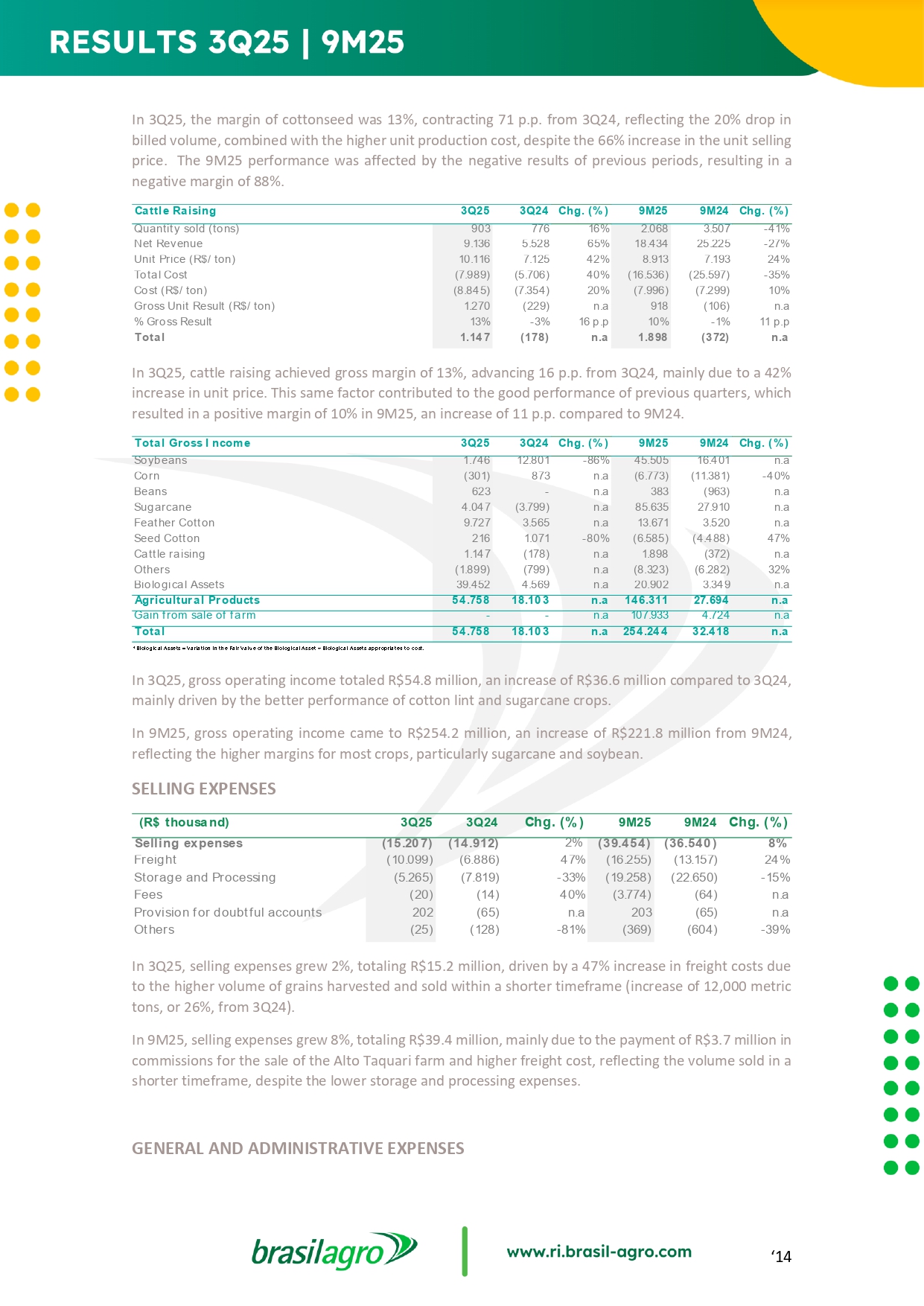 In 3 Q 25 , the margin of cottonseed was 13 % , contracting 71 p . p . from 3 Q 24 , reflecting the 20 % drop in billed volume, combined with the higher unit production cost, despite the 66 % increase in the unit selling price . The 9 M 25 performance was affected by the negative results of previous periods, resulting in a negative margin of 88 % . In 3Q25, gross operating income totaled R$54.8 million, an increase of R$36.6 million compared to 3Q24, mainly driven by the better performance of cotton lint and sugarcane crops. In 9M25, gross operating income came to R$254.2 million, an increase of R$221.8 million from 9M24, reflecting the higher margins for most crops, particularly sugarcane and soybean. SELLING EXPENSES In 3 Q 25 , selling expenses grew 2 % , totaling R $ 15 . 2 million, driven by a 47 % increase in freight costs due to the higher volume of grains harvested and sold within a shorter timeframe (increase of 12 , 000 metric tons, or 26 % , from 3 Q 24 ) . In 9 M 25 , selling expenses grew 8 % , totaling R $ 39 . 4 million, mainly due to the payment of R $ 3 . 7 million in commissions for the sale of the Alto Taquari farm and higher freight cost, reflecting the volume sold in a shorter timeframe, despite the lower storage and processing expenses . GENERAL AND ADMINISTRATIVE EXPENSES Chg. (% ) 9M24 9M25 Chg. (% ) 3Q24 3Q25 Ca ttle Ra ising - 41% 3.507 2.068 16% 776 903 Quant ity sold (tons) - 27% 25.225 18.434 65% 5.528 9.136 Net Revenue 24% 7.193 8.913 42% 7.125 10.116 Unit Price (R$/ ton) - 35% (25.597) (16.536) 40% (5.706) (7.989) Total Cost 10% (7.299) (7.996) 20% (7.354) (8.845) Cost (R$/ ton) n.a (106) 918 n.a (229) 1.270 Gross Unit Result (R$/ ton) 11 p.p - 1% 10% 16 p.p - 3% 13% % Gross Result n.a (372) 1.898 n.a (178) 1.14 7 Tota l In 3 Q 25 , cattle raising achieved gross margin of 13 % , advancing 16 p . p . from 3 Q 24 , mainly due to a 42 % increase in unit price . This same factor contributed to the good performance of previous quarters, which resulted in a positive margin of 10 % in 9 M 25 , an increase of 11 p . p . compared to 9 M 24 . Tota l Gross I ncome 3 Q 25 3 Q 24 Chg . ( % ) 9 M 25 9 M 24 Chg . ( % ) 16.401 n.a 45.505 12.801 - 86% 1.746 Soybeans (11.381) - 40% (6.773) 873 n.a (301) Corn (963) n.a 383 - n.a 623 Beans 27.910 n.a 85.635 (3.799) n.a 4.047 Sugarcane 3.520 n.a 13.671 3.565 n.a 9.727 Feather Cotton (4.488) 47% (6.585) 1.071 - 80% 216 Seed Cotton (372) n.a 1.898 (178) n.a 1.147 Cattle raising (6.282) 32% (8.323) (799) n.a (1.899) Others 3.349 n.a 20.902 4.569 n.a 39.452 Biological Assets n.a 27.694 14 6.311 n.a 18.10 3 54 .758 Agricultura l Products n.a 4.724 107.933 - n.a - Gain f rom sale of f arm n.a 32.4 18 254 .24 4 n.a 18.10 3 54 .758 Tota l ¹ Biological Asset s = Variation in the Fair Value of the Biological Asset + Biological Asset s appropriated to cost. Chg. (% ) 9M24 9M25 Chg. (% ) 3Q24 3Q25 (R$ thousa nd) 8% (36.54 0 ) (39.4 54 ) 2% (14 .912) (15.20 7) Selling expenses 24% (13.157) (16.255) 47% (6.886) (10.099) Freight - 15% (22.650) (19.258) - 33% (7.819) (5.265) Storage and Processing n.a (64) (3.774) 40% (14) (20) Fees n.a (65) 203 n.a (65) 202 Provision f or doubtf ul accounts - 39% (604) (369) - 81% (128) (25) Others ‘ 14