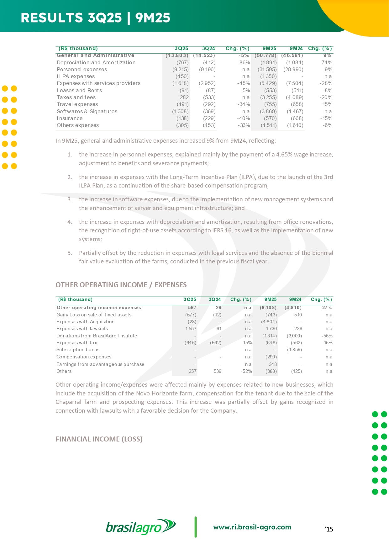 In 9M25, general and administrative expenses increased 9% from 9M24, reflecting: 1. the increase in personnel expenses, explained mainly by the payment of a 4 . 65 % wage increase, adjustment to benefits and severance payments ; 2. the increase in expenses with the Long - Term Incentive Plan (ILPA), due to the launch of the 3 rd ILPA Plan, as a continuation of the share - based compensation program ; 3. the increase in software expenses, due to the implementation of new management systems and the enhancement of server and equipment infrastructure ; and 4. the increase in expenses with depreciation and amortization, resulting from office renovations, the recognition of right - of - use assets according to IFRS 16 , as well as the implementation of new systems ; 5. Partially offset by the reduction in expenses with legal services and the absence of the biennial fair value evaluation of the farms, conducted in the previous fiscal year . OTHER OPERATING INCOME / EXPENSES Other operating income/expenses were affected mainly by expenses related to new businesses, which include the acquisition of the Novo Horizonte farm, compensation for the tenant due to the sale of the Chaparral farm and prospecting expenses . This increase was partially offset by gains recognized in connection with lawsuits with a favorable decision for the Company . FINANCIAL INCOME (LOSS) (R$ thousand) 3 Q25 3Q24 Chg. (% ) 9M25 9M24 Chg. (% ) (4 6.581) 9% (50 .778) (14 .523 ) - 5% (13 .80 3 ) General and Administrative (1.084) 74% (1.891) (412) 86% (767) Depreciation and Amortization (28.990) 9% (31.595) (9.196) n.a (9.215) Personnel expenses - n.a (1.350) - n.a (450) I LPA expenses (7.504) - 28% (5.429) (2.952) - 45% (1.618) Expenses with services providers (511) 8% (553) (87) 5% (91) Leases and Rents (4.089) - 20% (3.255) (533) n.a 282 Taxes and fees (658) 15% (755) (292) - 34% (191) Travel expenses (1.467) n.a (3.869) (369) n.a (1.308) Softwares & Signatures (668) - 15% (570) (229) - 40% (138) I nsurance (1.610) - 6% (1.511) (453) - 33% (305) Others expenses Chg. (% ) 9M24 9M25 Chg. (% ) 3Q24 3Q25 (R$ thousa nd) 27% (4 .810 ) (6.10 8) n.a 26 567 Other opera ting income/ expenses n.a 510 (743) n.a (12) (577) Gain/ Loss on sale of f ixed assets n.a - (4.804) n.a - (23) Expenses with Acquisition n.a 226 1.730 n.a 61 1.557 Expenses with lawsuits - 56% (3.000) (1.314) n.a - - Donations f rom BrasilAgro I nstitute 15% (562) (646) 15% (562) (646) Expenses with tax n.a (1.859) - n.a - - Subscription bonus n.a - (290) n.a - - Compensation expenses n.a - 348 n.a - - Earnings f rom advantageous purchase n.a (125) (388) - 52% 539 257 Others ‘ 15