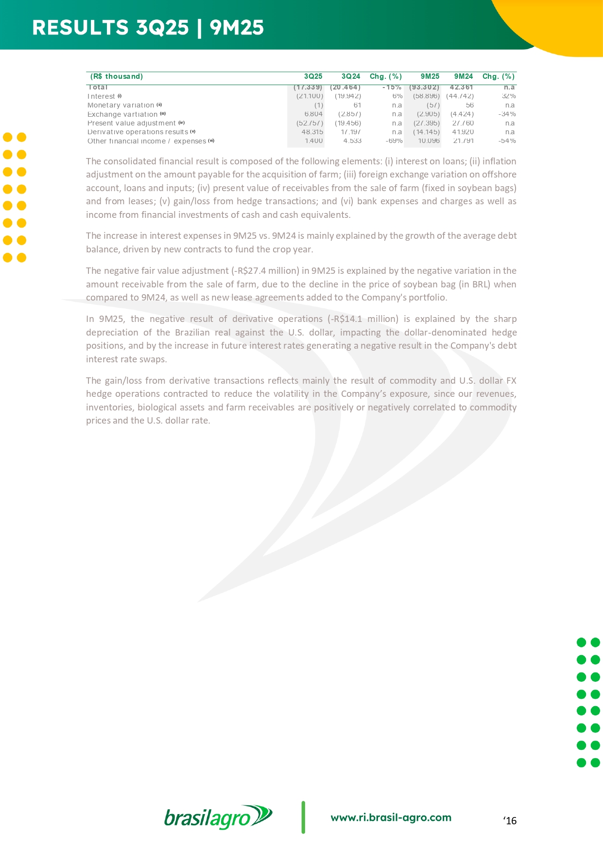 The consolidated financial result is composed of the following elements : (i) interest on loans ; (ii) inflation adjustment on the amount payable for the acquisition of farm ; (iii) foreign exchange variation on offshore account, loans and inputs ; (iv) present value of receivables from the sale of farm (fixed in soybean bags) and from leases ; (v) gain/loss from hedge transactions ; and (vi) bank expenses and charges as well as income from financial investments of cash and cash equivalents . The increase in interest expenses in 9 M 25 vs . 9 M 24 is mainly explained by the growth of the average debt balance, driven by new contracts to fund the crop year . The negative fair value adjustment ( - R $ 27 . 4 million) in 9 M 25 is explained by the negative variation in the amount receivable from the sale of farm, due to the decline in the price of soybean bag (in BRL) when compared to 9 M 24 , as well as new lease agreements added to the Company's portfolio . In 9 M 25 , the negative result of derivative operations ( - R $ 14 . 1 million) is explained by the sharp depreciation of the Brazilian real against the U . S . dollar, impacting the dollar - denominated hedge positions, and by the increase in future interest rates generating a negative result in the Company's debt interest rate swaps . The gain/loss from derivative transactions reflects mainly the result of commodity and U . S . dollar FX hedge operations contracted to reduce the volatility in the Company’s exposure, since our revenues, inventories, biological assets and farm receivables are positively or negatively correlated to commodity prices and the U . S . dollar rate . ‘ 16 Chg. (% ) 9M24 9M25 Chg. (% ) 3Q24 3Q25 (R$ thousand) n.a 4 2.361 (93.30 2) - 15% (20 .4 64 ) (17.339) Total 32% (44.742) (58.896) 6% (19.942) (21.100) I nterest (i) n.a 56 (57) n.a 61 (1) Monetary variation (ii) - 34% (4.424) (2.905) n.a (2.857) 6.804 Exchange vartiation (iii) n.a 27.760 (27.395) n.a (19.456) (52.757) Present value adjustment (iv) n.a 41.920 (14.145) n.a 17.197 48.315 Derivative operations results (v) - 54% 21.791 10.096 - 69% 4.533 1.400 Other f inancial income / expenses (vi)