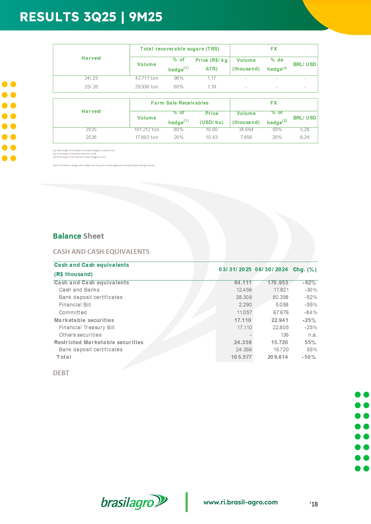 (1) Percentage of the soybean volume hedged, in metric tons. (2) Percentage of expected revenue in USD. (3) Percentage of the ethanol volume hedged, in m³. Note: For ethanol hedge, we consider the crop year as the sugarcane calendar (April through March). Balance Sheet CASH AND CASH EQUIVALENTS DEBT FX Total recoverable sugars (TRS) Harvest BRL/ USD % de hedge (2) Volume (thousand) Price (R$/ kg ATR) % of hedge ( 1) Volume - - - 1,17 98% 42.717 ton 24/ 25 - - - 1,19 60% 29.936 ton 25/ 26 FX Farm Sale Receivables Harvest BRL/ USD % of hedge ( 2) Volume (thousand) Price (USD/ bu) % of hedge ( 1) Volume 5,28 93% 34.664 10,60 80% 101.212 ton 2025 6,24 26% 7.856 10,43 20% 17.883 ton 2026 Ca sh a nd Ca sh equiva lents (R$ thousa nd) 0 3/ 31/ 20 25 0 6/ 30 / 20 24 Chg. (% ) - 62% 170 .953 64 .111 Ca sh a nd Ca sh equiva lents - 30% 17.821 12.456 Cash and Banks - 52% 80.398 38.308 Bank deposit certif icates - 55% 5.058 2.290 Financial Bill - 84% 67.676 11.057 Committed - 25% 22.94 1 17.110 Ma rketa ble securities - 25% 22.805 17.110 Financial Treasury Bill n.a. 136 - Others securities 55% 15.720 24 .356 Restricted Ma rketa ble securities 55% 15.720 24.356 Bank deposit certif icates - 50 % 20 9.614 10 5.577 Tota l ‘ 18
