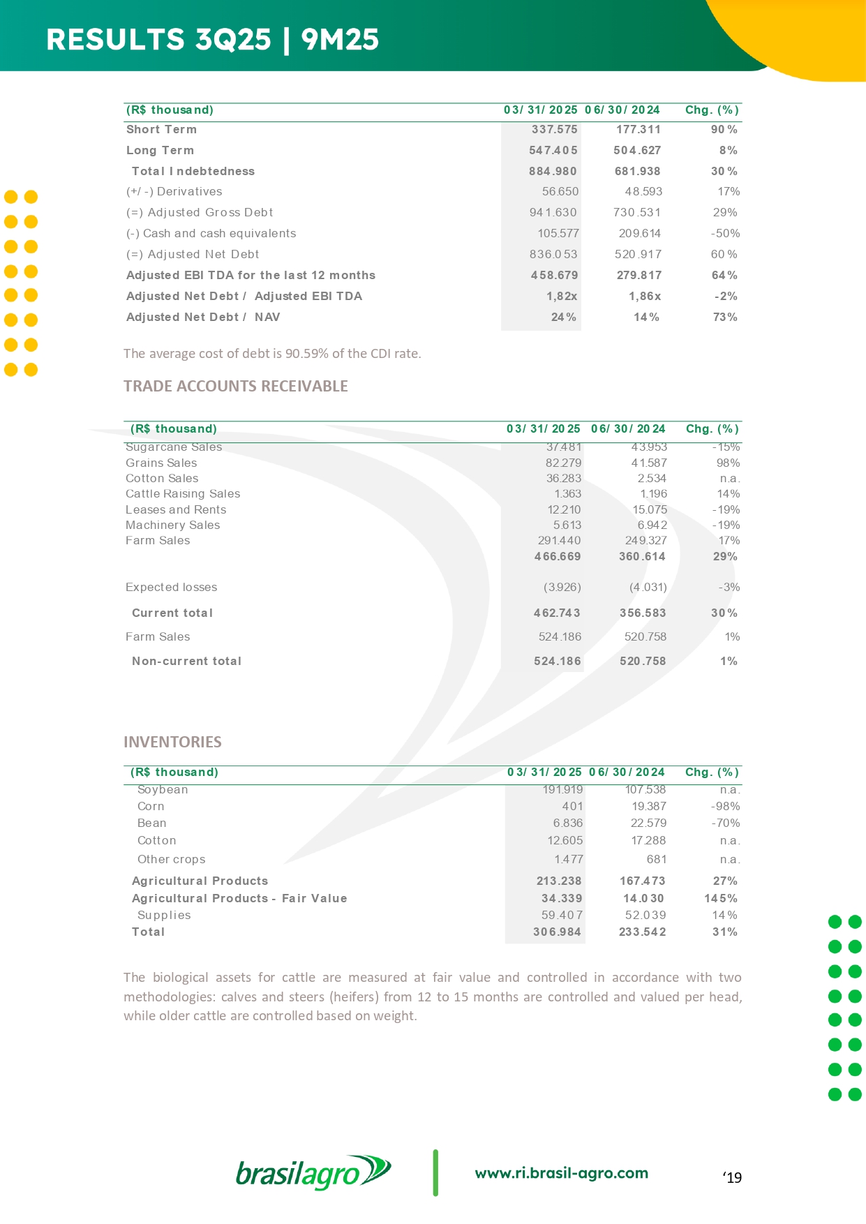 The biological assets for cattle are measured at fair value and controlled in accordance with two methodologies : calves and steers (heifers) from 12 to 15 months are controlled and valued per head, while older cattle are controlled based on weight . Chg. (% ) 0 6/ 30 / 20 24 0 3/ 31/ 20 25 (R$ thousa nd) 90 % 177.311 337.575 Short Term 8% 50 4 .627 54 7.4 0 5 Long Term 30 % 681.938 884 .980 Tota l I ndebtedness 17% 48.593 56.650 (+/ - ) Derivatives 29% 730 .531 94 1.630 (=) Adjust ed Gr o ss Deb t - 50% 209.614 105.577 ( - ) Cash and cash equivalents 60 % 520 .917 836.0 53 (=) Adjust ed Net Deb t 64 % 279.817 4 58.679 Adjusted EBI TDA for the la st 12 months - 2% 1,86x 1,82x Adjusted Net Debt / Adjusted EBI TDA 73% 14 % 24 % Adjusted Net Debt / NAV The average cost of debt is 90.59% of the CDI rate. TRADE ACCOUNTS RECEIVABLE Chg. (% ) 0 6/ 30 / 20 24 0 3/ 31/ 20 25 (R$ thousa nd) - 15% 43.953 37.481 Sugarcane Sales 98% 41.587 82.279 Grains Sales n.a. 2.534 36.283 Cotton Sales 14% 1.196 1.363 Cattle Raising Sales - 19% 15.075 12.210 Leases and Rents - 19% 6.942 5.613 Machinery Sales 17% 249.327 291.440 Farm Sales 29% 360 .614 4 66.669 - 3% (4.031) (3.926) Expected losses 30 % 356.583 4 62.74 3 Current tota l 1% 520.758 524.186 Farm Sales 1% 520 .758 524 .186 Non - current tota l INVENTORIES (R$ thousa nd) 0 3/ 31/ 20 25 0 6/ 30 / 20 24 Chg. (% ) n.a. 107.538 191.919 Soybean - 98% 19.387 401 Corn - 70% 22.579 6.836 Bean n.a. 17.288 12.605 Cotton n.a. 681 1.477 Other crops 27% 167.4 73 213.238 Agricultura l Products 14 5% 14 .0 30 34 .339 Agricultura l Products - Fa ir Va lue 14 % 52.0 39 59.4 0 7 Sup p l ies 31% 233.54 2 30 6.984 Tota l ‘ 19