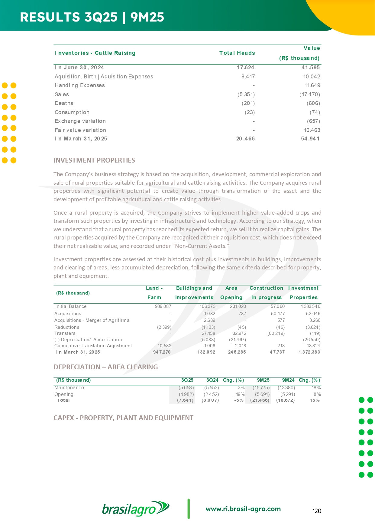 The Company’s business strategy is based on the acquisition, development, commercial exploration and sale of rural properties suitable for agricultural and cattle raising activities . The Company acquires rural properties with significant potential to create value through transformation of the asset and the development of profitable agricultural and cattle raising activities . Once a rural property is acquired, the Company strives to implement higher value - added crops and transform such properties by investing in infrastructure and technology . According to our strategy, when we understand that a rural property has reached its expected return, we sell it to realize capital gains . The rural properties acquired by the Company are recognized at their acquisition cost, which does not exceed their net realizable value, and recorded under “Non - Current Assets . " Investment properties are assessed at their historical cost plus investments in buildings, improvements and clearing of areas, less accumulated depreciation, following the same criteria described for property, plant and equipment . DEPRECIATION – AREA CLEARING CAPEX - PROPERTY, PLANT AND EQUIPMENT I nventories - Ca ttle Ra ising Tota l Hea ds Va lue ( R$ thousa nd) 4 1.595 17.624 I n J une 30 , 20 24 10.042 8.417 Aquisition, Birth | Aquisition Expenses 11.649 - Handling Expenses (17.470) (5.351) Sales (606) (201) Deaths (74) (23) Consumption (657) - Exchange variation 10.463 - Fair value variation 54 .94 1 20 .4 66 I n Ma rch 31, 20 25 INVESTMENT PROPERTIES (R$ thousand) La nd - Buildings and Area Construction I nvestment Farm improvements Opening in progress Properties 1.333.540 57.060 231.020 106.373 939.087 I nitial Balance 52.046 50.177 787 1.082 - Acquisitions 3.266 577 - 2.689 - Acquisitions - Merger of Agrif irma (3.624) (46) (45) (1.133) (2.399) Reductions (119) (60.249) 32.972 27.158 - Transf ers (26.550) - (21.467) (5.083) - ( - ) Depreciation/ Amortization 13.824 218 2.018 1.006 10.582 Cumulative Translation Adjustment 1.372.383 4 7.737 24 5.285 132.0 92 94 7.270 I n March 31, 20 25 Chg. (% ) 9M24 9M25 Chg. (% ) 3Q24 3Q25 (R$ thousa nd) 18% (13.380) (15.775) 2% (5.553) (5.658) Maintenance 8% (5.291) (5.691) - 19% (2.452) (1.982) Opening 15% (18.672) (21.4 66) - 5% (8.0 0 7) (7.64 1) Tota l ‘ 20