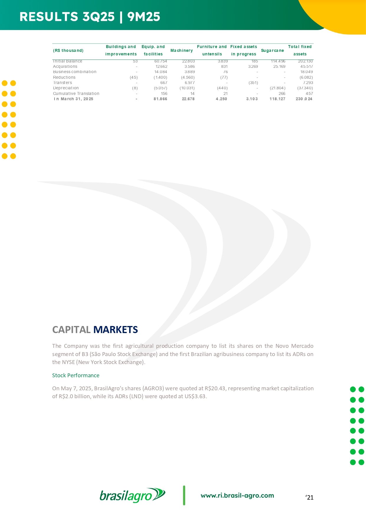 CAPITAL MARKETS The Company was the first agricultural production company to list its shares on the Novo Mercado segment of B 3 (São Paulo Stock Exchange) and the first Brazilian agribusiness company to list its ADRs on the NYSE (New York Stock Exchange) . Stock Performance On May 7 , 2025 , BrasilAgro’s shares (AGRO 3 ) were quoted at R $ 20 . 43 , representing market capitalization of R $ 2 . 0 billion, while its ADRs (LND) were quoted at US $ 3 . 63 . (R$ thousand) Buildings and Equip. and Machinery Furniture and Fixed assets Sugarcane Total fixed assets in progress untensils facilities improvements 202.130 114.496 185 3.839 22.803 60.754 53 I nitial Balance 45.517 25.169 3.269 831 3.586 12.662 - Acquisitions 18.049 - - 76 3.889 14.084 - Business combination (6.082) - - (77) (4.560) (1.400) (45) Reductions 7.293 - (351) - 6.977 667 - Transfers (37.340) (21.804) - (440) (10.031) (5.057) (8) Depreciation 457 266 - 21 14 156 - Cumulative Translation 230 .0 24 118.127 3.10 3 4 .250 22.678 81.866 - I n March 31, 20 25 ‘ 21