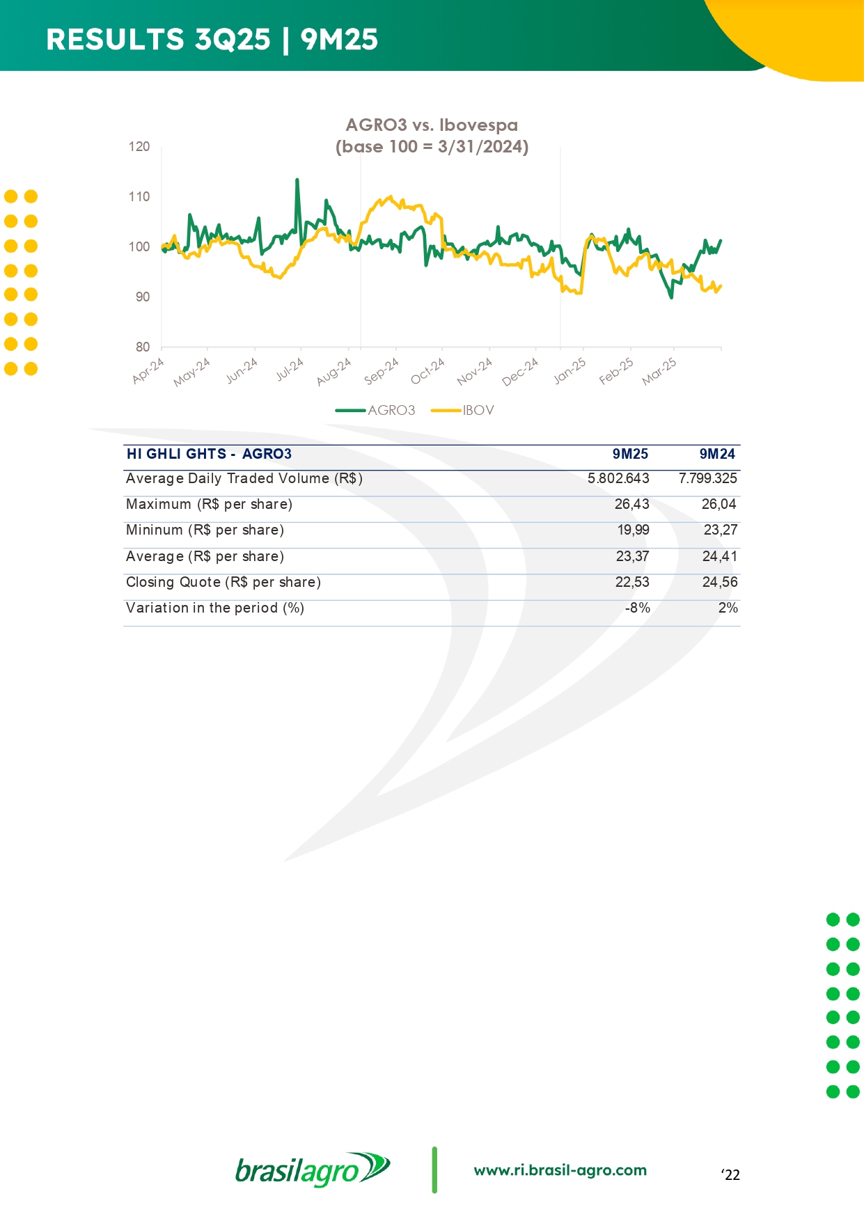 110 100 90 80 120 AGRO3 vs. Ibovespa (base 100 = 3/31/2024) IBOV AGRO3 9M24 9M25 HI GHLI GHTS - AGRO3 7.799.325 5.802.643 Average Daily Traded Volume (R$) 26,04 26,43 Maximum (R$ per share) 23,27 19,99 Mininum (R$ per share) 24,41 23,37 Average (R$ per share) 24,56 22,53 Closing Quote (R$ per share) 2% - 8% Variation in the period (%) ‘ 22