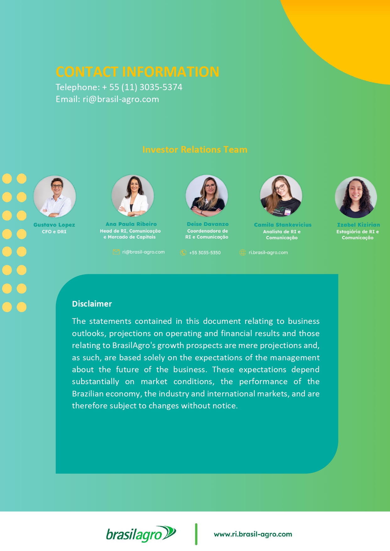 ‘23 CONTACT INFORMATION Telephone: + 55 (11) 3035 - 5374 Email: ri@brasil - agro.com Investor Relations Team Disclaimer The statements contained in this document relating to business outlooks, projections on operating and financial results and those relating to BrasilAgro's growth prospects are mere projections and, as such, are based solely on the expectations of the management about the future of the business . These expectations depend substantially on market conditions, the performance of the Brazilian economy, the industry and international markets, and are therefore subject to changes without notice .