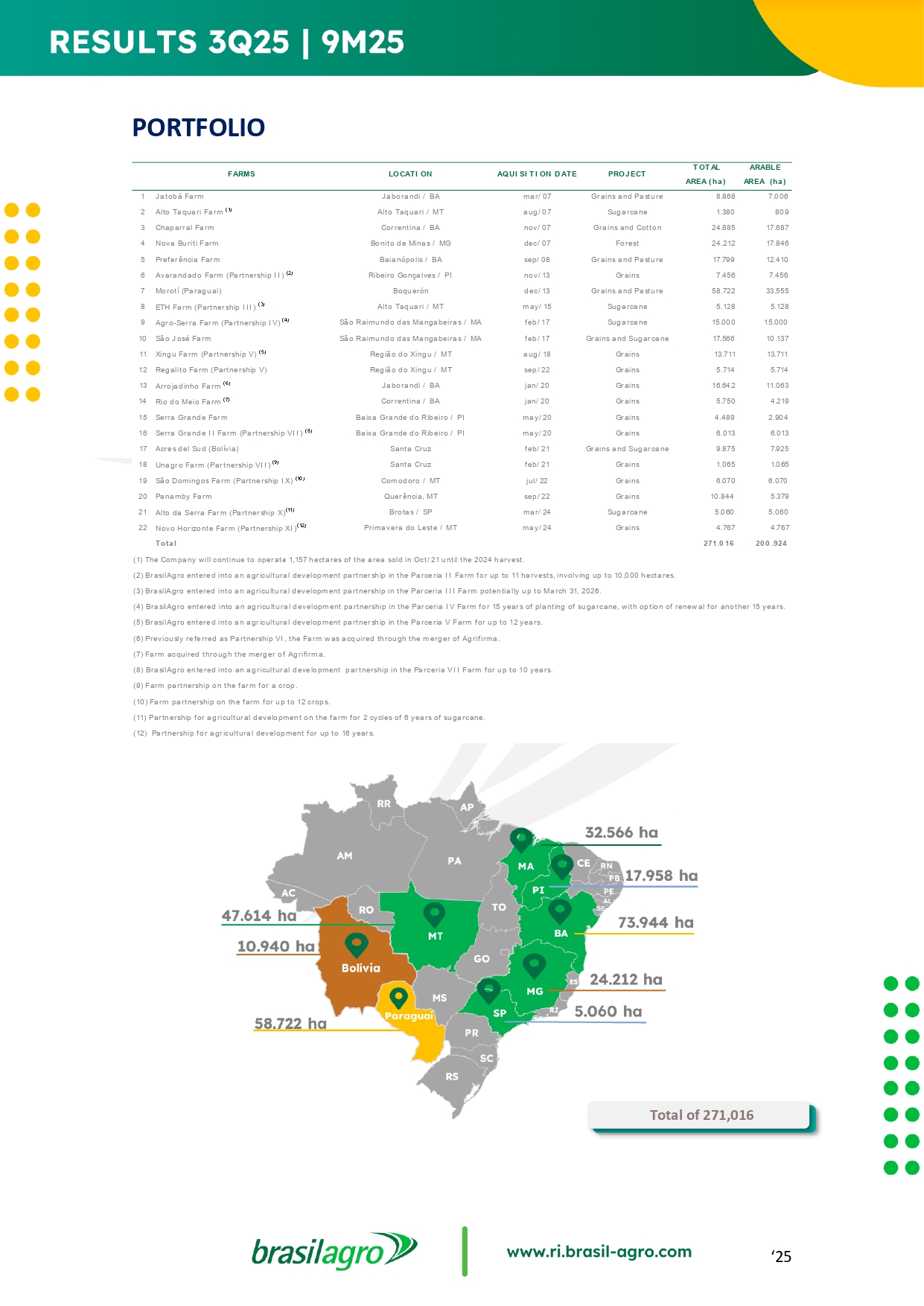 PORTFOLIO TOTAL ARABLE FARMS LOCATI ON AQUI SI TI ON DATE PROJECT AREA (ha) AREA (ha) 7.006 8.868 Grains and Pasture mar/ 07 J aborandi / BA 1 J atobá Farm 809 1.380 Sugarcane aug/ 07 Alto Taquari / MT 2 Alto Taquari Farm (1) 17.687 24.885 Grains and Cotton nov/ 07 Correntina / BA 3 Chaparral Farm 17.846 24.212 Forest dec/ 07 Bonito de Minas / MG 4 Nova Buriti Farm 12.410 17.799 Grains and Pasture sep/ 08 Baianópolis / BA 5 Preferência Farm 7.456 7.456 Grains nov/ 13 Ribeiro Gonçalves / PI 6 Avarandado Farm (Partnership I I ) (2) 33.555 58.722 Grains and Pasture dec/ 13 Boquerón 7 Morotí (Paraguai) 5.128 5.128 Sugarcane may/ 15 Alto Taquari / MT 8 ETH Farm (Partnership I I I ) (3) 15.000 15.000 Sugarcane feb/ 17 São Raimundo das Mangabeiras / MA 9 Agro - Serra Farm (Partnership I V) (4) 10.137 17.566 Grains and Sugarcane feb/ 17 São Raimundo das Mangabeiras / MA 10 São J osé Farm 13.711 13.711 Grains aug/ 18 Região do Xingu / MT 11 Xingu Farm (Partnership V) (5) 5.714 5.714 Grains sep/ 22 Região do Xingu / MT 12 Regalito Farm (Partnership V) 11.063 16.642 Grains jan/ 20 J aborandi / BA 13 Arrojadinho Farm (6) 4.219 5.750 Grains jan/ 20 Correntina / BA 14 Rio do Meio Farm (7) 2.904 4.489 Grains may/ 20 Baixa Grande do Ribeiro / PI 15 Serra Grande Farm 6.013 6.013 Grains may/ 20 Baixa Grande do Ribeiro / PI 16 Serra Grande I I Farm (Partnership VI I ) (8) 7.925 9.875 Grains and Sugarcane feb/ 21 Santa Cruz 17 Acres del Sud (Bolívia) 1.065 1.065 Grains feb/ 21 Santa Cruz 18 Unagro Farm (Partnership VI I ) (9) 6.070 6.070 Grains jul/ 22 Comodoro / MT 19 São Domingos Farm (Partnership I X) (10) 5.379 10.844 Grains sep/ 22 Querência, MT 20 Panamby Farm 5.060 5.060 Sugarcane mar/ 24 Brotas / SP 21 Alto da Serra Farm (Partnership X) (11) 4.767 4.767 Grains may/ 24 Primavera do Leste / MT 22 Novo Horizonte Farm (Partnership XI ) (12) 20 0 .924 271.0 16 Total (1) The Company will continue to operate 1,157 hectares of the area sold in Oct/ 21 until the 2024 harvest. (2) BrasilAgro entered into an agricultural development partnership in the Parceria I I Farm for up to 11 harvests, involving up to 10,000 hectares. (3) BrasilAgro entered into an agricultural development partnership in the Parceria I I I Farm potentially up to March 31, 2026. (4) BrasilAgro entered into an agricultural development partnership in the Parceria I V Farm for 15 years of planting of sugarcane, with option of renewal for another 15 years. (5) BrasilAgro entered into an agricultural development partnership in the Parceria V Farm for up to 12 years. (6) Previously referred as Partnership VI , the Farm was acquired through the merger of Agrifirma. (7) Farm acquired through the merger of Agrifirma. (8) BrasilAgro entered into an agricultural development partnership in the Parceria VI I Farm for up to 10 years. (9) Farm partnership on the farm for a crop. (10) Farm partnership on the farm for up to 12 crops. (11) Partnership for agricultural development on the farm for 2 cycles of 6 years of sugarcane. (12) Partnership for agricultural development for up to 16 years. Total of 271,016 ‘ 25