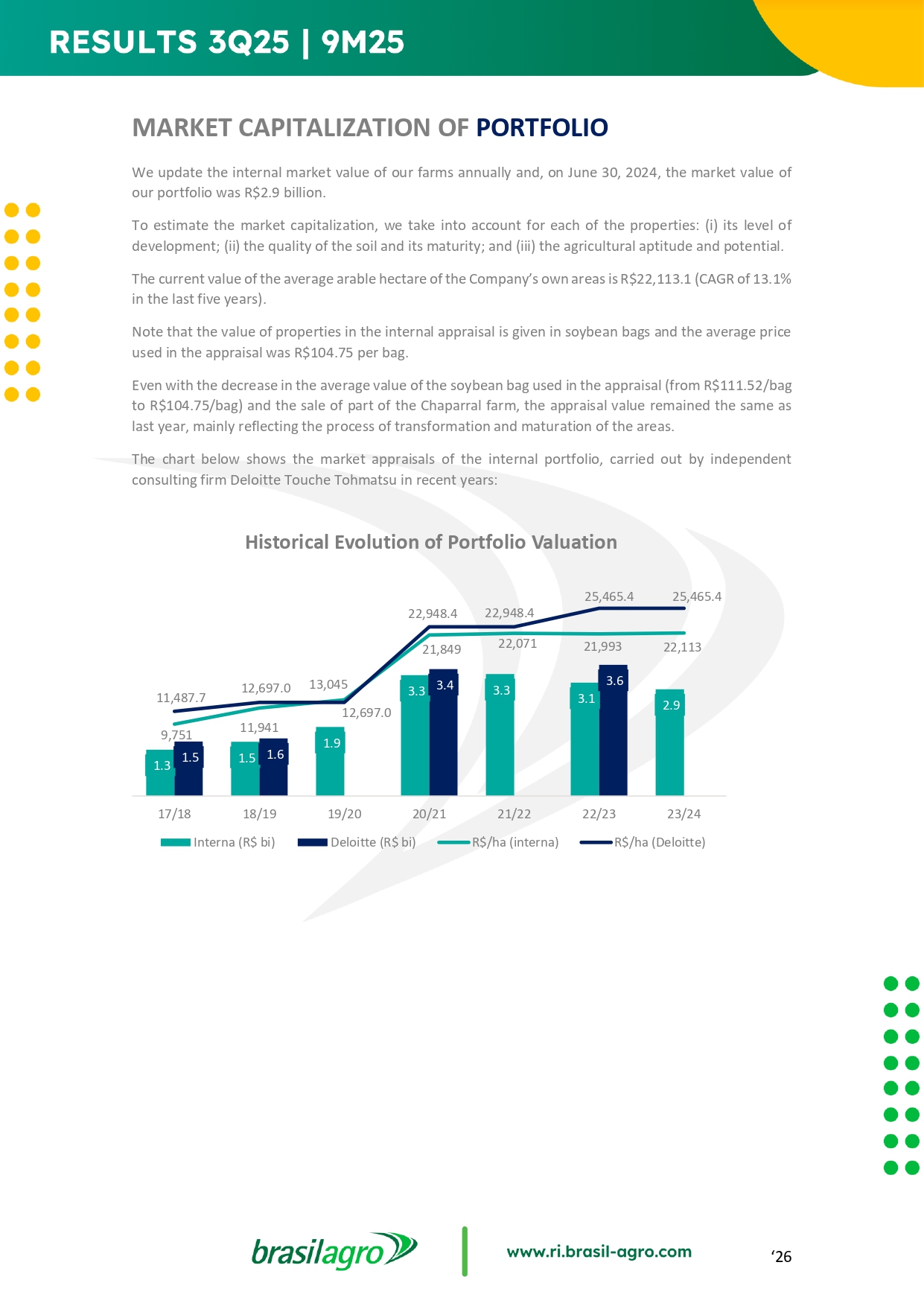 1.3 1.5 1.9 3.3 3.3 3.1 2.9 1.5 1.6 3.4 3.6 9,751 11,941 13,045 21,849 22,071 21,993 22,113 11,487.7 12,697.0 12,697.0 22,948.4 22,948.4 25,465.4 25,465.4 17/18 18/19 21/22 MARKET CAPITALIZATION OF PORTFOLIO We update the internal market value of our farms annually and, on June 30 , 2024 , the market value of our portfolio was R $ 2 . 9 billion . To estimate the market capitalization, we take into account for each of the properties : (i) its level of development ; (ii) the quality of the soil and its maturity ; and (iii) the agricultural aptitude and potential . The current value of the average arable hectare of the Company’s own areas is R $ 22 , 113 . 1 (CAGR of 13 . 1 % in the last five years) . Note that the value of properties in the internal appraisal is given in soybean bags and the average price used in the appraisal was R $ 104 . 75 per bag . Even with the decrease in the average value of the soybean bag used in the appraisal (from R $ 111 . 52 /bag to R $ 104 . 75 /bag) and the sale of part of the Chaparral farm, the appraisal value remained the same as last year, mainly reflecting the process of transformation and maturation of the areas . The chart below shows the market appraisals of the internal portfolio, carried out by independent consulting firm Deloitte Touche Tohmatsu in recent years : Historical Evolution of Portfolio Valuation Interna (R$ bi) 19/20 20/21 Deloitte (R$ bi) R$/ha (interna) 22/23 23/24 R$/ha (Deloitte) ‘ 26