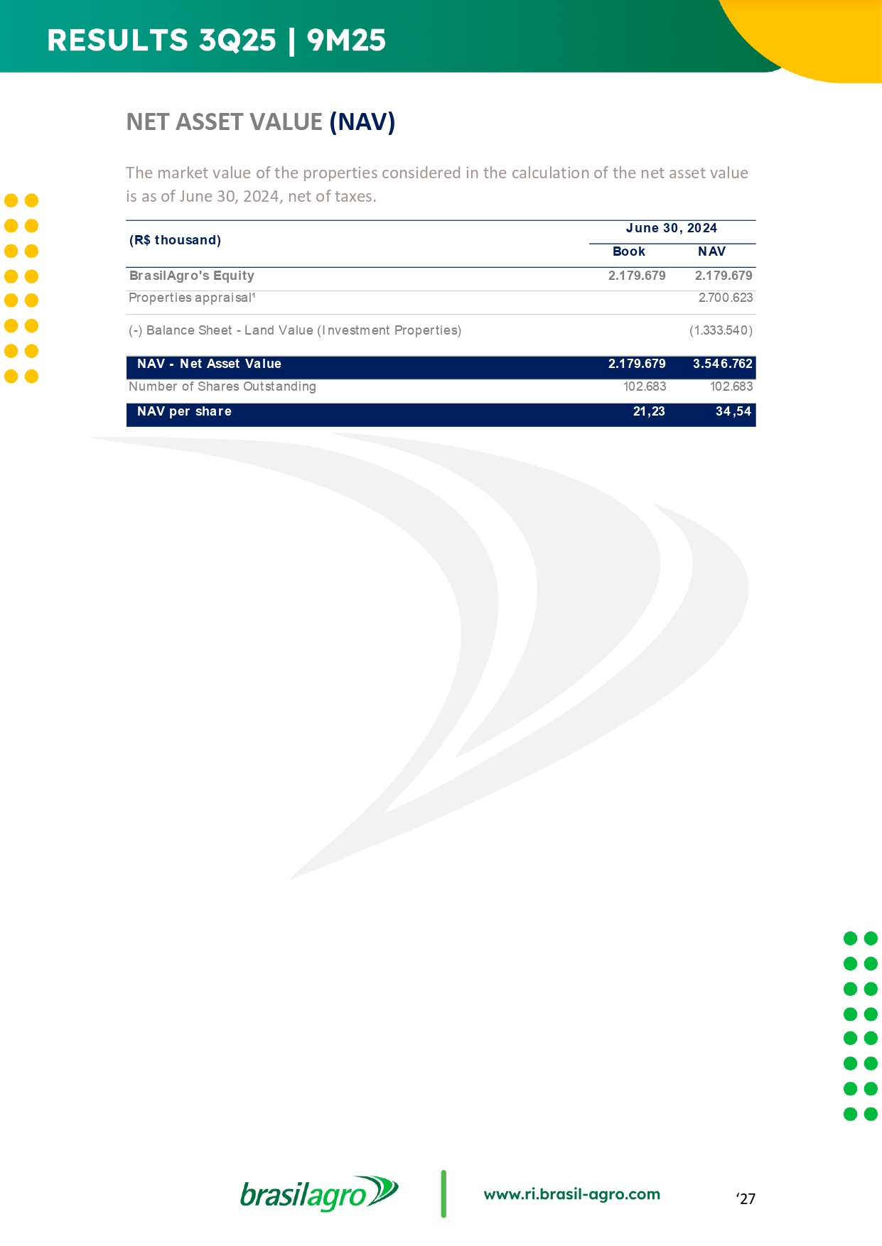 NET ASSET VALUE (NAV) ‘ 27 The market value of the properties considered in the calculation of the net asset value is as of June 30, 2024, net of taxes. June 30 , 20 24 (R$ thousand) NAV Book 2.179.679 2.179.679 BrasilAgro's Equity 2.700.623 Properties appraisal¹ (1.333.540) ( - ) Balance Sheet - Land Value (I nvestment Properties) 3.54 6.762 2.179.679 NAV - Net Asset Value 102.683 102.683 Number of Shares Outstanding 34 ,54 21,23 NAV per share