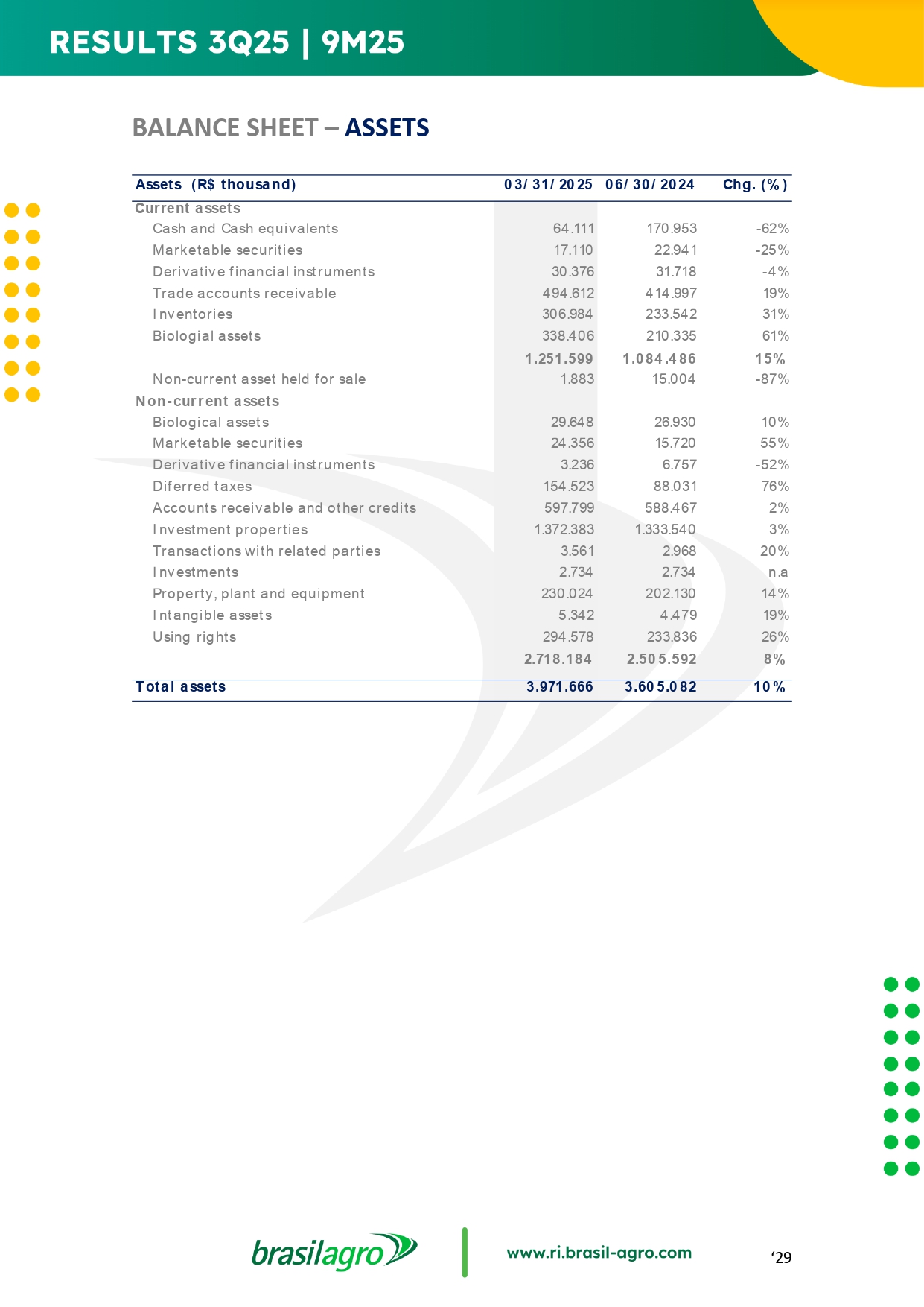 BALANCE SHEET – ASSETS Assets (R$ thousand) 0 3/ 31/ 20 25 0 6/ 30 / 20 24 Chg. (% ) Current assets 170.953 - 62% 64.111 Cash and Cash equivalents 22.941 - 25% 17.110 Marketable securities 31.718 - 4% 30.376 Derivative f inancial instruments 414.997 19% 494.612 Trade accounts receivable 233.542 31% 306.984 I nventories 210.335 61% 338.406 Biolog ial assets 1.0 84 .4 86 15% 1.251.599 15.004 - 87% 1.883 Non - current asset held for sale Non - current assets 26.930 10% 29.648 Biolog ical assets 15.720 55% 24.356 Marketable securities 6.757 - 52% 3.236 Derivative f inancial instruments 88.031 76% 154.523 Diferred taxes 588.467 2% 597.799 Accounts receivable and other credits 1.333.540 3% 1.372.383 I nvestment properties 2.968 20% 3.561 Transactions with related parties 2.734 n.a 2.734 I nvestments 202.130 14% 230.024 Property, plant and equipment 4.479 19% 5.342 I ntangible assets 233.836 26% 294.578 Using rights 2.50 5.592 8% 2.718.184 3.60 5.0 82 10 % 3.971.666 Total assets ‘ 29