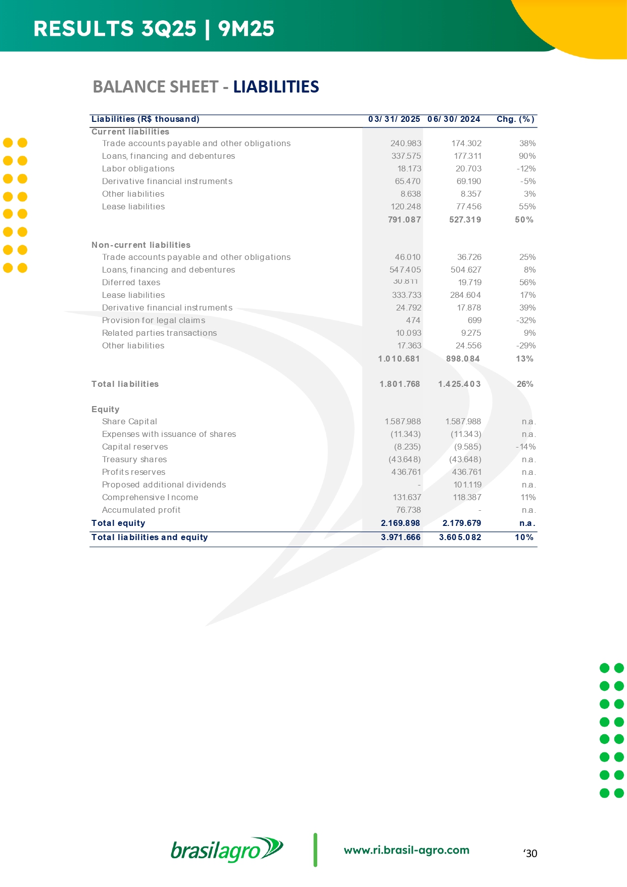 BALANCE SHEET - LIABILITIES Liabilities (R$ thousand) 0 3/ 31/ 20 25 0 6/ 30 / 20 24 Chg. (% ) Current liabilities 174.302 38% 240.983 Trade accounts payable and other obligations 177.311 90% 337.575 Loans, f inancing and debentures 20.703 - 12% 18.173 Labor obligations 69.190 - 5% 65.470 Derivative f inancial instruments 8.357 3% 8.638 Other liabilities 77.456 55% 120.248 Lease liabilities 527.319 50 % 791.0 87 Non - current liabilities 36.726 25% 46.010 Trade accounts payable and other obligations 504.627 8% 547.405 Loans, f inancing and debentures 19.719 56% 30.811 Diferred taxes 284.604 17% 333.733 Lease liabilities 17.878 39% 24.792 Derivative f inancial instruments 699 - 32% 474 Provision for legal claims 9.275 9% 10.093 Related parties t ransactions 24.556 - 29% 17.363 Other liabilities 898.0 84 13% 1.0 10 .681 1.4 25.4 0 3 26% 1.80 1.768 Total liabilities Equity 1.587.988 n.a. 1.587.988 Share Capital (11.343) n.a. (11.343) Expenses with issuance of shares (9.585) - 14% (8.235) Capital reserves (43.648) n.a. (43.648) Treasury shares 436.761 n.a. 436.761 Profits reserves 101.119 n.a. - Proposed additional dividends 118.387 11% 131.637 Comprehensive I ncome - n.a. 76.738 Accumulated profit 2.179.679 n.a. 2.169.898 Total equity 3.60 5.0 82 10 % 3.971.666 Total liabilities and equity ‘ 30