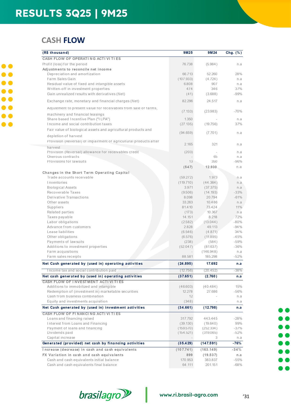 CASH FLOW (R$ thousand) 9M25 9M24 Chg. (% ) CASH FLOW OF OPERATI NG ACTI VI TI ES (5.984) n.a 76.738 Prof it (loss) f or the period Adjustments to reconcile net income 52.260 28% 66.713 Depreciation and amortization (4.724) n.a (107.933) Farm Sales Gain 907 n.a 6.808 Residual value of f ixed and intangible assets 346 37% 474 Written - of f in investment properties (3.688) - 99% (41) Gain unrealized results with derivatives (Net) 24.517 n.a 82.296 Exchange rate, monetary and f inancial charges (Net) (23.983) - 70% (7.133) Adjustment to present value f or receivables f rom sale of f arms, machinery and f inancial leasings - n.a 1.350 Share based I ncentive Plan ("I LPA") (19.756) 37% (27.135) I ncome and social contribution taxes (7.701) n.a (94.659) Fair value of biological assets and agricultural products and depletion of harvest 321 n.a 2.165 Provision (Reversal) of impairment of agricultural products af ter harvest - n.a (203) Provision (Reversal) allowance f or receivables credit 65 n.a - Onerous contracts 350 - 96% 13 Provisions f or law suits 12.930 n.a (547) Changes in the Short Term Operating Capital 1.973 n.a (59.272) Trade accounts receivable (44.364) n.a (119.710) I nventories (37.375) n.a 3.971 Biological Assets (14.193) - 33% (9.506) Recoverable Taxes 20.794 - 61% 8.098 Derivative Transactions 10.486 n.a 33.263 Other assets 73.424 11% 81.410 Suppliers 10.367 n.a (173) Related parties 8.218 72% 14.151 Taxes payable (13.044) - 80% (2.582) Labor obligations 49.113 - 94% 2.828 Advance f rom customers (4.871) 34% (6.546) Lease liabilities (11.895) - 45% (6.576) Other obligations (584) - 59% (238) Payments of law suits (81.637) - 36% (52.047) Additions to investment properties (146.948) n.a - Farm acquisitions 185.298 - 52% 88.581 Farm sales receipts n.a 17.692 (24 .895) Net Cash generated by (used in) operating activities - 38% (20.452) (12.756) I ncome tax and social contribution paid n.a (2.760 ) (37.651) Net cash generated by (used in) operating activities CASH FLOW OF I NVESTMENT ACTI VI TI ES (40.484) 15% (46.603) Additions to immobilized and intangible 27.686 - 56% 12.278 Redemption of (investment in) marketable securities - n.a 12 Cash f rom business combination - n.a (348) Equity and investments acquisition n.a (12.798) (34 .661) Net Cash generated by (used in) investment activities CASH FLOW OF FI NANCI NG ACTI VI TI ES - 28% 443.445 317.792 Loans and f inancing raised 99% (19.640) (39.130) I nterest f rom Loans and Financing - 37% (252.334) (159.570) Payment of loans and f inancing - 52% (319.065) (154.521) Dividends paid n.a 3 - Capital increase - 76% (147.591) (35.429) Generated (provided) net cash by financing activities - 34 % (163.149) (10 7.741) I ncrease (decrease) in cash and cash equivalents n.a (19.537) 899 FX Variation in cash and cash equivalents - 55% 383.837 170.953 Cash and cash equivalents initial balance - 68% 201.151 64.111 Cash and cash equivalents f inal balance ‘ 31