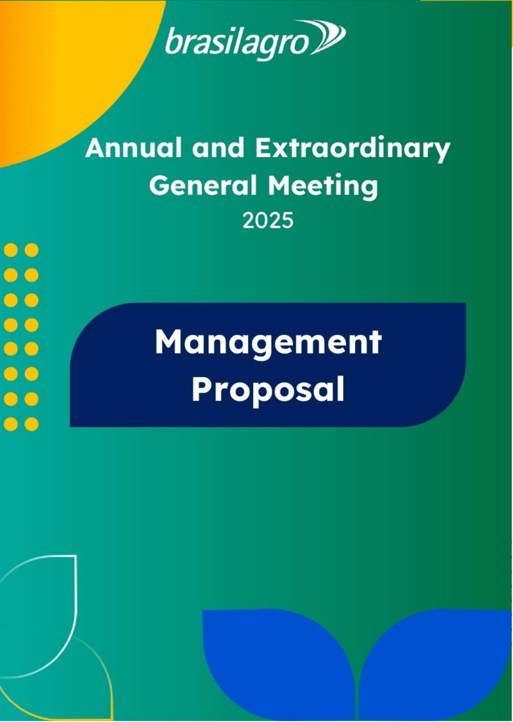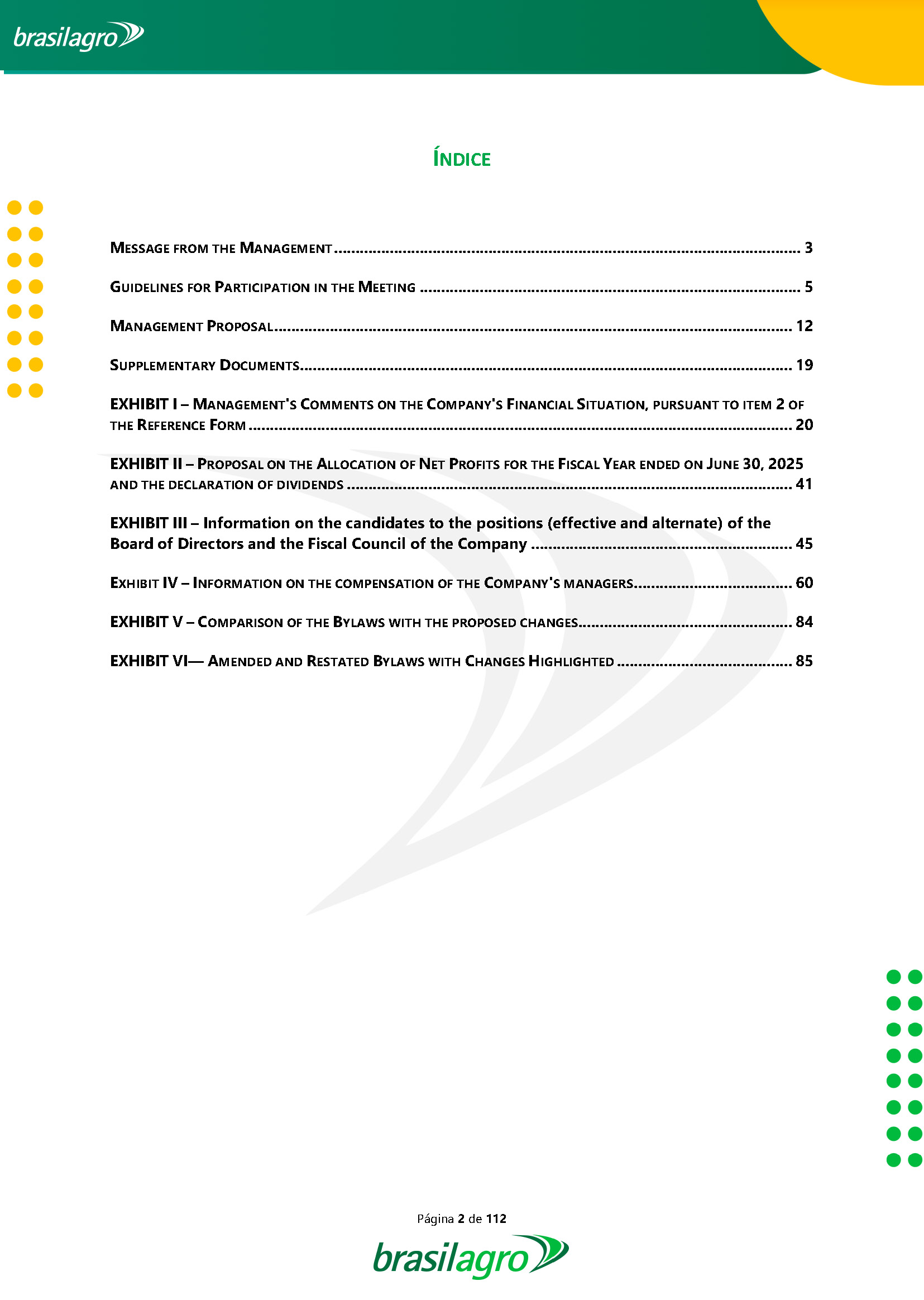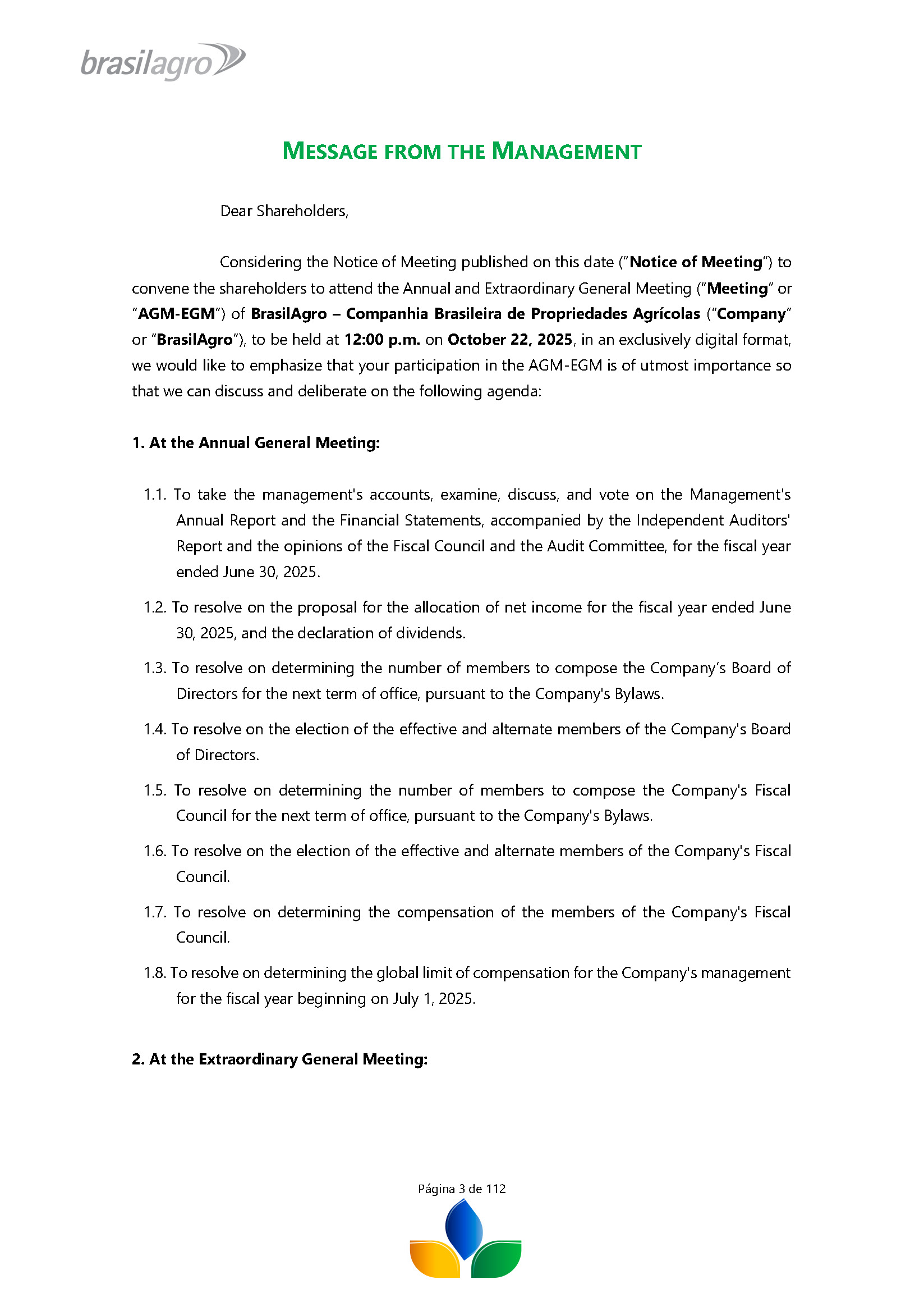 M ESSAGE FROM THE M ANAGEMENT Dear Shareholders, Considering the Notice of Meeting published on this date (“ Notice of Meeting ”) to convene the shareholders to attend the Annual and Extraordinary General Meeting (“ Meeting ” or “ AGM - EGM ”) of BrasilAgro – Companhia Brasileira de Propriedades Agrícolas (“ Company ” or “ BrasilAgro ”), to be held at 12 : 00 p . m . on October 22 , 2025 , in an exclusively digital format, we would like to emphasize that your participation in the AGM - EGM is of utmost importance so that we can discuss and deliberate on the following agenda : 1. At the Annual General Meeting: 1. To take the management's accounts, examine, discuss, and vote on the Management's Annual Report and the Financial Statements, accompanied by the Independent Auditors' Report and the opinions of the Fiscal Council and the Audit Committee, for the fiscal year ended June 30 , 2025 . 2. To resolve on the proposal for the allocation of net income for the fiscal year ended June 30 , 2025 , and the declaration of dividends . 3. To resolve on determining the number of members to compose the Company’s Board of Directors for the next term of office, pursuant to the Company's Bylaws. 4. To resolve on the election of the effective and alternate members of the Company's Board of Directors. 5. To resolve on determining the number of members to compose the Company's Fiscal Council for the next term of office, pursuant to the Company's Bylaws. 6. To resolve on the election of the effective and alternate members of the Company's Fiscal Council. 7. To resolve on determining the compensation of the members of the Company's Fiscal Council. 8. To resolve on determining the global limit of compensation for the Company's management for the fiscal year beginning on July 1, 2025. 1. At the Extraordinary General Meeting: Página 3 de 112