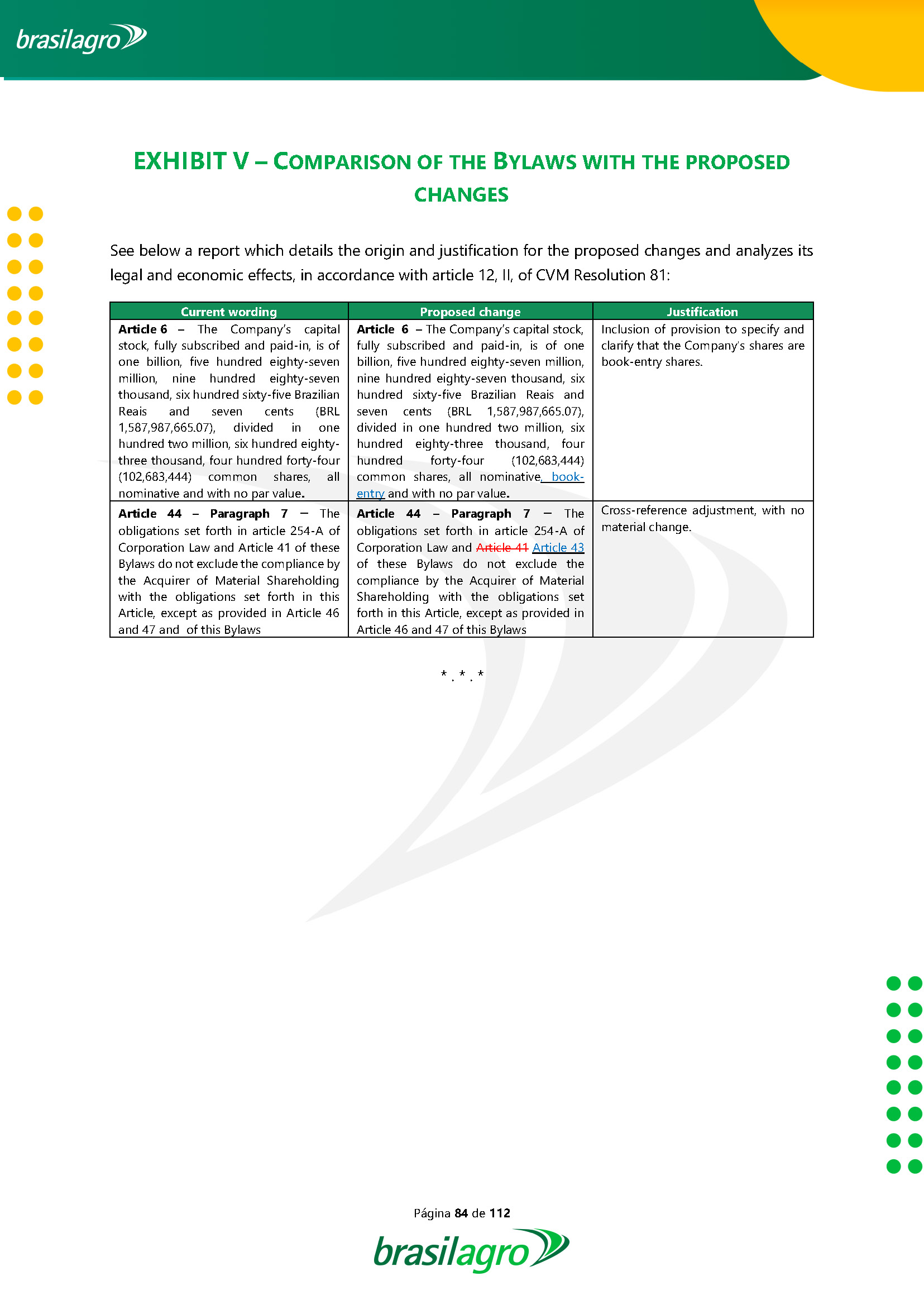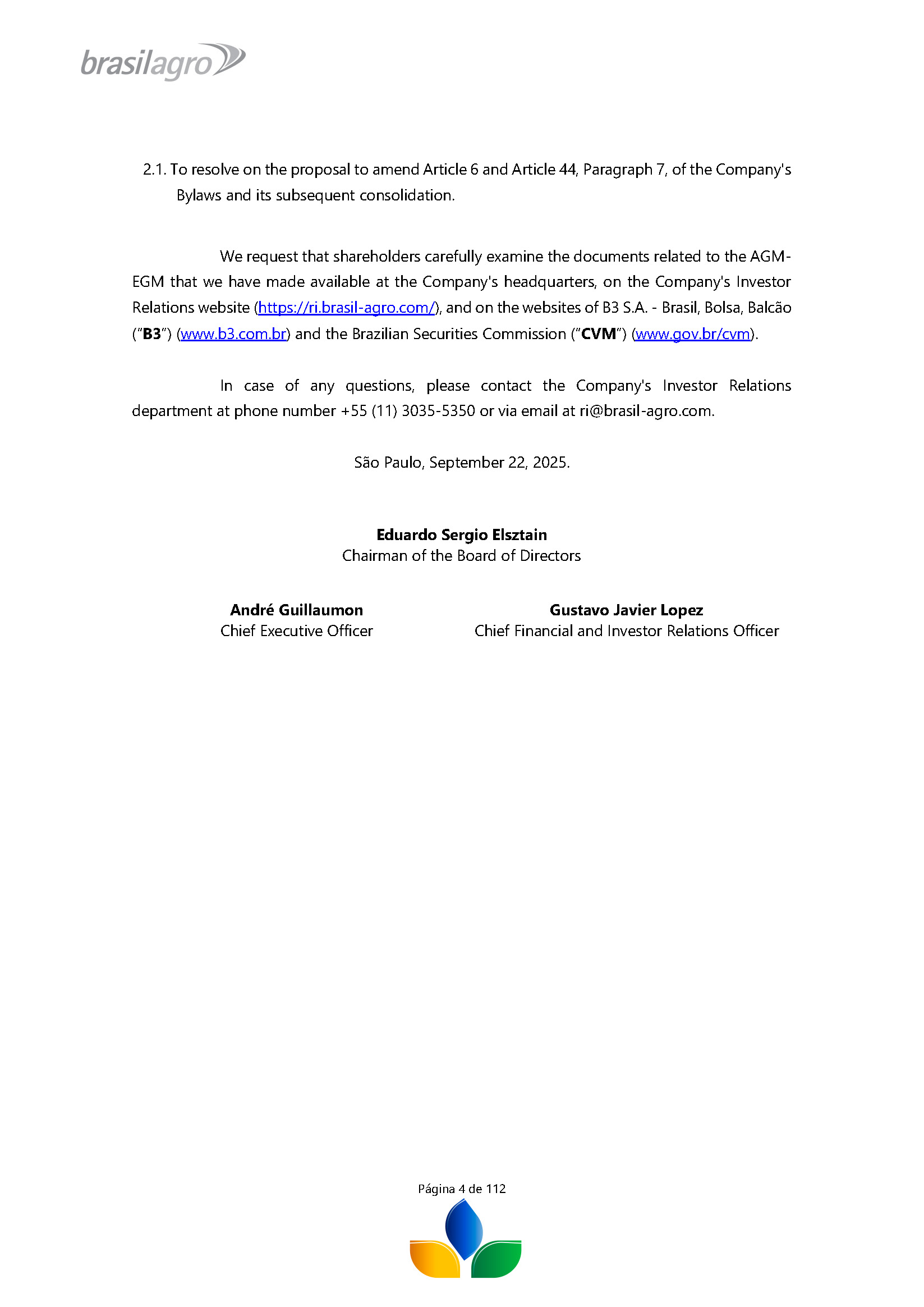 2.1. To resolve on the proposal to amend Article 6 and Article 44, Paragraph 7, of the Company's Bylaws and its subsequent consolidation. We request that shareholders carefully examine the documents related to the AGM - EGM that we have made available at the Company's headquarters, on the Company's Investor Relations website ( https : //ri . brasil - agro . com/ ), and on the websites of B 3 S . A . - Brasil, Bolsa, Balcão (“ B 3 ”) ( www . b 3 . com . br ) and the Brazilian Securities Commission (“ CVM ”) ( www . gov . br/cvm ) . In case of any questions, please contact the Company's Investor Relations department at phone number + 55 ( 11 ) 3035 - 5350 or via email at ri@brasil - agro . com . São Paulo, September 22, 2025. Página 4 de 112 Eduardo Sergio Elsztain Chairman of the Board of Directors André Guillaumon Chief Executive Officer Gustavo Javier Lopez Chief Financial and Investor Relations Officer
