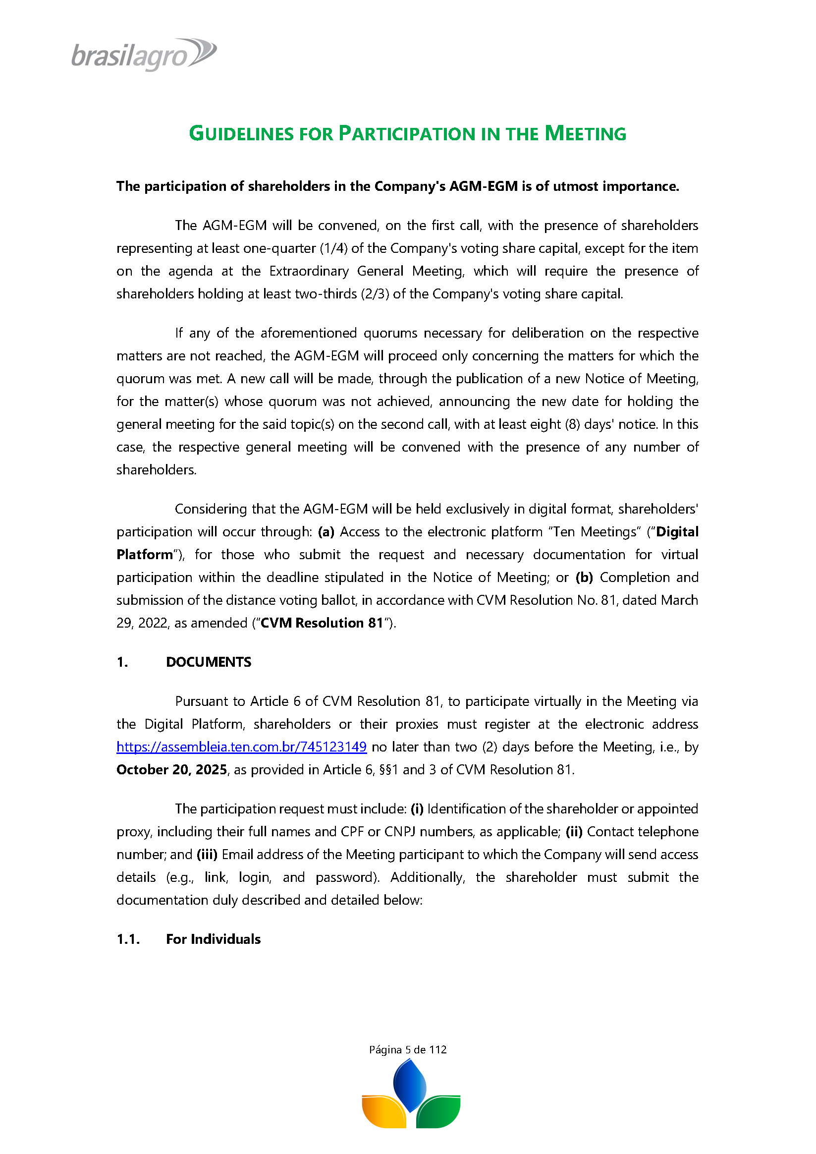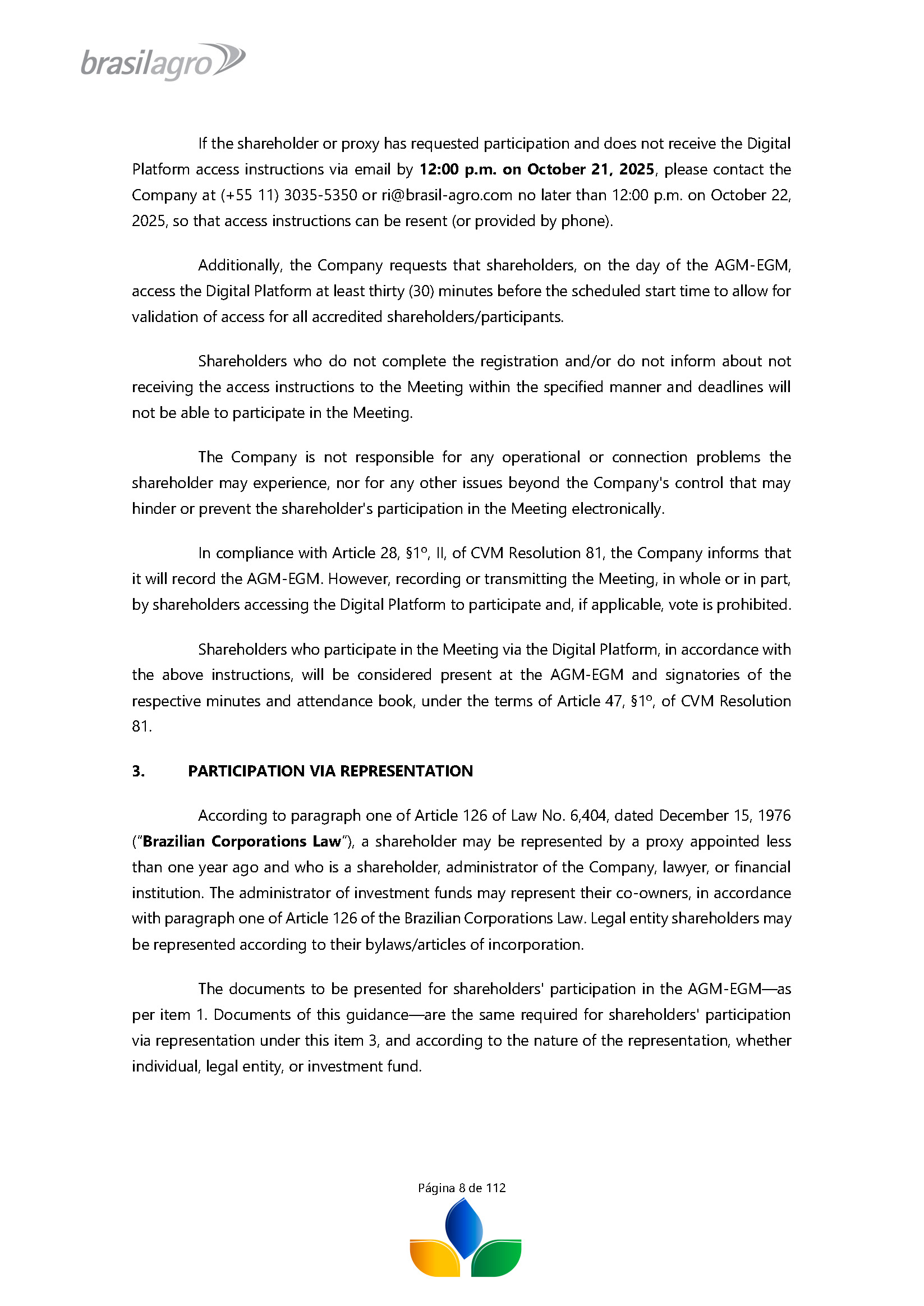 If the shareholder or proxy has requested participation and does not receive the Digital Platform access instructions via email by 12 : 00 p . m . on October 21 , 2025 , please contact the Company at (+ 55 11 ) 3035 - 5350 or ri@brasil - agro . com no later than 12 : 00 p . m . on October 22 , 2025 , so that access instructions can be resent (or provided by phone) . Additionally, the Company requests that shareholders, on the day of the AGM - EGM, access the Digital Platform at least thirty ( 30 ) minutes before the scheduled start time to allow for validation of access for all accredited shareholders/participants . Shareholders who do not complete the registration and/or do not inform about not receiving the access instructions to the Meeting within the specified manner and deadlines will not be able to participate in the Meeting . The Company is not responsible for any operational or connection problems the shareholder may experience, nor for any other issues beyond the Company's control that may hinder or prevent the shareholder's participation in the Meeting electronically . In compliance with Article 28 , † 1 º, II, of CVM Resolution 81 , the Company informs that it will record the AGM - EGM . However, recording or transmitting the Meeting, in whole or in part, by shareholders accessing the Digital Platform to participate and, if applicable, vote is prohibited . Shareholders who participate in the Meeting via the Digital Platform, in accordance with the above instructions, will be considered present at the AGM - EGM and signatories of the respective minutes and attendance book, under the terms of Article 47 , † 1 º, of CVM Resolution 81 . 3. PARTICIPATION VIA REPRESENTATION According to paragraph one of Article 126 of Law No . 6 , 404 , dated December 15 , 1976 (“ Brazilian Corporations Law ”), a shareholder may be represented by a proxy appointed less than one year ago and who is a shareholder, administrator of the Company, lawyer, or financial institution . The administrator of investment funds may represent their co - owners, in accordance with paragraph one of Article 126 of the Brazilian Corporations Law . Legal entity shareholders may be represented according to their bylaws/articles of incorporation . The documents to be presented for shareholders' participation in the AGM - EGM — as per item 1 . Documents of this guidance — are the same required for shareholders' participation via representation under this item 3 , and according to the nature of the representation, whether individual, legal entity, or investment fund . Página 8 de 112