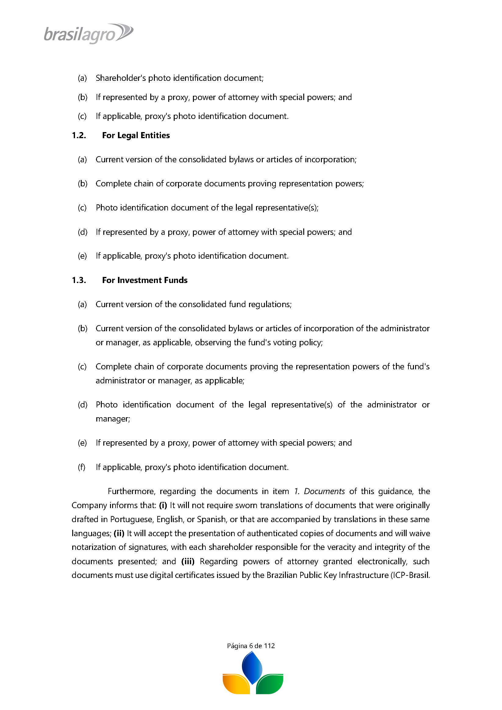 (a) Shareholder's photo identification document; (b) If represented by a proxy, power of attorney with special powers; and (c) If applicable, proxy's photo identification document. 2. For Legal Entities (a) Current version of the consolidated bylaws or articles of incorporation; (b) Complete chain of corporate documents proving representation powers; (c) Photo identification document of the legal representative(s); (d) If represented by a proxy, power of attorney with special powers; and (e) If applicable, proxy's photo identification document. 3. For Investment Funds (a) Current version of the consolidated fund regulations; (b) Current version of the consolidated bylaws or articles of incorporation of the administrator or manager, as applicable, observing the fund's voting policy; (c) Complete chain of corporate documents proving the representation powers of the fund's administrator or manager, as applicable; (d) Photo identification document of the legal representative(s) of the administrator or manager; (e) If represented by a proxy, power of attorney with special powers; and (f) If applicable, proxy's photo identification document. Furthermore, regarding the documents in item 1 . Documents of this guidance, the Company informs that : (i) It will not require sworn translations of documents that were originally drafted in Portuguese, English, or Spanish, or that are accompanied by translations in these same languages ; (ii) It will accept the presentation of authenticated copies of documents and will waive notarization of signatures, with each shareholder responsible for the veracity and integrity of the documents presented ; and (iii) Regarding powers of attorney granted electronically, such documents must use digital certificates issued by the Brazilian Public Key Infrastructure (ICP - Brasil . Página 6 de 112