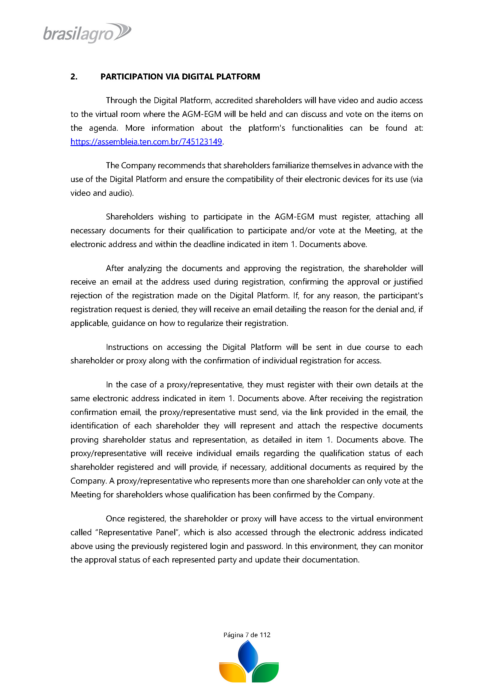 2. PARTICIPATION VIA DIGITAL PLATFORM Through the Digital Platform, accredited shareholders will have video and audio access to the virtual room where the AGM - EGM will be held and can discuss and vote on the items on the agenda . More information about the platform's functionalities can be found at : https : //assembleia . ten . com . br/ 745123149 . The Company recommends that shareholders familiarize themselves in advance with the use of the Digital Platform and ensure the compatibility of their electronic devices for its use (via video and audio) . Shareholders wishing to participate in the AGM - EGM must register, attaching all necessary documents for their qualification to participate and/or vote at the Meeting, at the electronic address and within the deadline indicated in item 1 . Documents above . After analyzing the documents and approving the registration, the shareholder will receive an email at the address used during registration, confirming the approval or justified rejection of the registration made on the Digital Platform . If, for any reason, the participant's registration request is denied, they will receive an email detailing the reason for the denial and, if applicable, guidance on how to regularize their registration . Instructions on accessing the Digital Platform will be sent in due course to each shareholder or proxy along with the confirmation of individual registration for access . In the case of a proxy/representative, they must register with their own details at the same electronic address indicated in item 1 . Documents above . After receiving the registration confirmation email, the proxy/representative must send, via the link provided in the email, the identification of each shareholder they will represent and attach the respective documents proving shareholder status and representation, as detailed in item 1 . Documents above . The proxy/representative will receive individual emails regarding the qualification status of each shareholder registered and will provide, if necessary, additional documents as required by the Company . A proxy/representative who represents more than one shareholder can only vote at the Meeting for shareholders whose qualification has been confirmed by the Company . Once registered, the shareholder or proxy will have access to the virtual environment called “Representative Panel”, which is also accessed through the electronic address indicated above using the previously registered login and password . In this environment, they can monitor the approval status of each represented party and update their documentation . Página 7 de 112