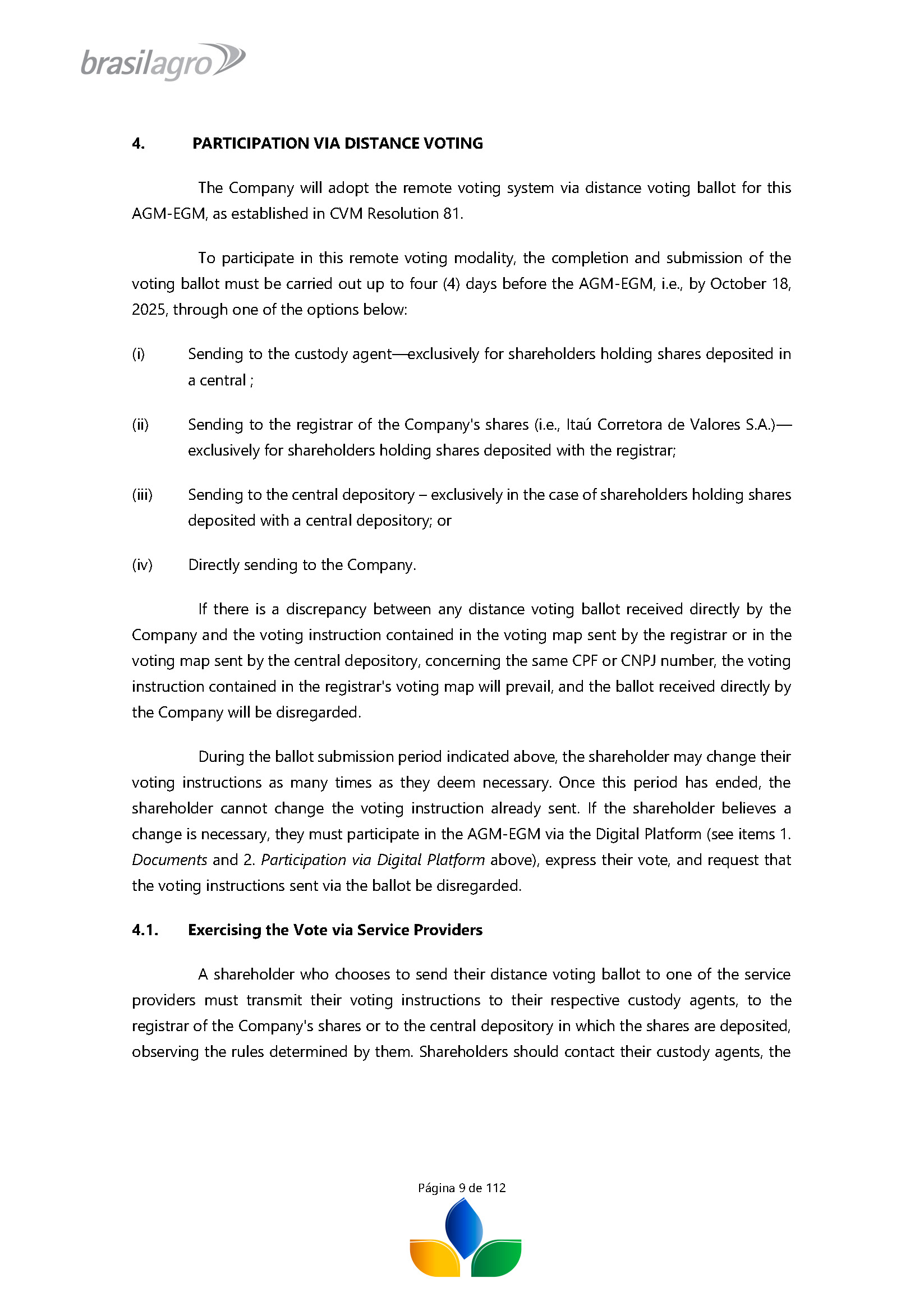 4. PARTICIPATION VIA DISTANCE VOTING The Company will adopt the remote voting system via distance voting ballot for this AGM - EGM, as established in CVM Resolution 81 . To participate in this remote voting modality, the completion and submission of the voting ballot must be carried out up to four ( 4 ) days before the AGM - EGM, i . e . , by October 18 , 2025 , through one of the options below : Página 9 de 112 (i) Sending to the custody agent — exclusively for shareholders holding shares deposited in a central ; (ii) Sending to the registrar of the Company's shares (i.e., Itaú Corretora de Valores S.A.) — exclusively for shareholders holding shares deposited with the registrar; (iii) Sending to the central depository – exclusively in the case of shareholders holding shares deposited with a central depository; or (iv) Directly sending to the Company. If there is a discrepancy between any distance voting ballot received directly by the Company and the voting instruction contained in the voting map sent by the registrar or in the voting map sent by the central depository, concerning the same CPF or CNPJ number, the voting instruction contained in the registrar's voting map will prevail, and the ballot received directly by the Company will be disregarded . During the ballot submission period indicated above, the shareholder may change their voting instructions as many times as they deem necessary . Once this period has ended, the shareholder cannot change the voting instruction already sent . If the shareholder believes a change is necessary, they must participate in the AGM - EGM via the Digital Platform (see items 1 . Documents and 2 . Participation via Digital Platform above), express their vote, and request that the voting instructions sent via the ballot be disregarded . 4.1. Exercising the Vote via Service Providers A shareholder who chooses to send their distance voting ballot to one of the service providers must transmit their voting instructions to their respective custody agents, to the registrar of the Company's shares or to the central depository in which the shares are deposited, observing the rules determined by them . Shareholders should contact their custody agents, the
