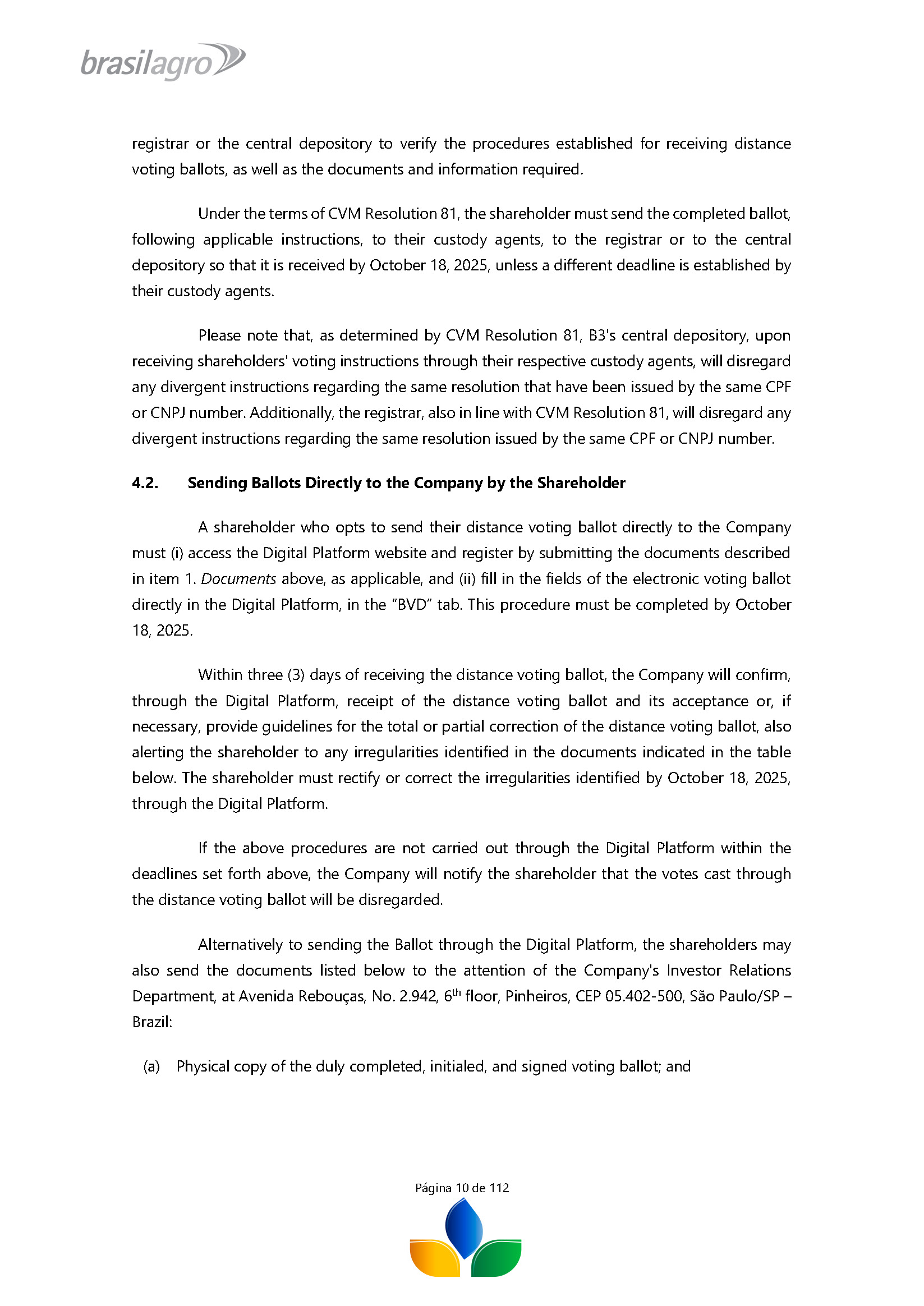 registrar or the central depository to verify the procedures established for receiving distance voting ballots, as well as the documents and information required. Under the terms of CVM Resolution 81 , the shareholder must send the completed ballot, following applicable instructions, to their custody agents, to the registrar or to the central depository so that it is received by October 18 , 2025 , unless a different deadline is established by their custody agents . Please note that, as determined by CVM Resolution 81 , B 3 's central depository, upon receiving shareholders' voting instructions through their respective custody agents, will disregard any divergent instructions regarding the same resolution that have been issued by the same CPF or CNPJ number . Additionally, the registrar, also in line with CVM Resolution 81 , will disregard any divergent instructions regarding the same resolution issued by the same CPF or CNPJ number . 2. Sending Ballots Directly to the Company by the Shareholder A shareholder who opts to send their distance voting ballot directly to the Company must (i) access the Digital Platform website and register by submitting the documents described in item 1 . Documents above, as applicable, and (ii) fill in the fields of the electronic voting ballot directly in the Digital Platform, in the “BVD” tab . This procedure must be completed by October 18 , 2025 . Within three ( 3 ) days of receiving the distance voting ballot, the Company will confirm, through the Digital Platform, receipt of the distance voting ballot and its acceptance or, if necessary, provide guidelines for the total or partial correction of the distance voting ballot, also alerting the shareholder to any irregularities identified in the documents indicated in the table below . The shareholder must rectify or correct the irregularities identified by October 18 , 2025 , through the Digital Platform . If the above procedures are not carried out through the Digital Platform within the deadlines set forth above, the Company will notify the shareholder that the votes cast through the distance voting ballot will be disregarded . Alternatively to sending the Ballot through the Digital Platform, the shareholders may also send the documents listed below to the attention of the Company's Investor Relations Department, at Avenida Rebouças, No . 2 . 942 , 6 th floor, Pinheiros, CEP 05 . 402 - 500 , São Paulo/SP – Brazil : (a) Physical copy of the duly completed, initialed, and signed voting ballot; and Página 10 de 112