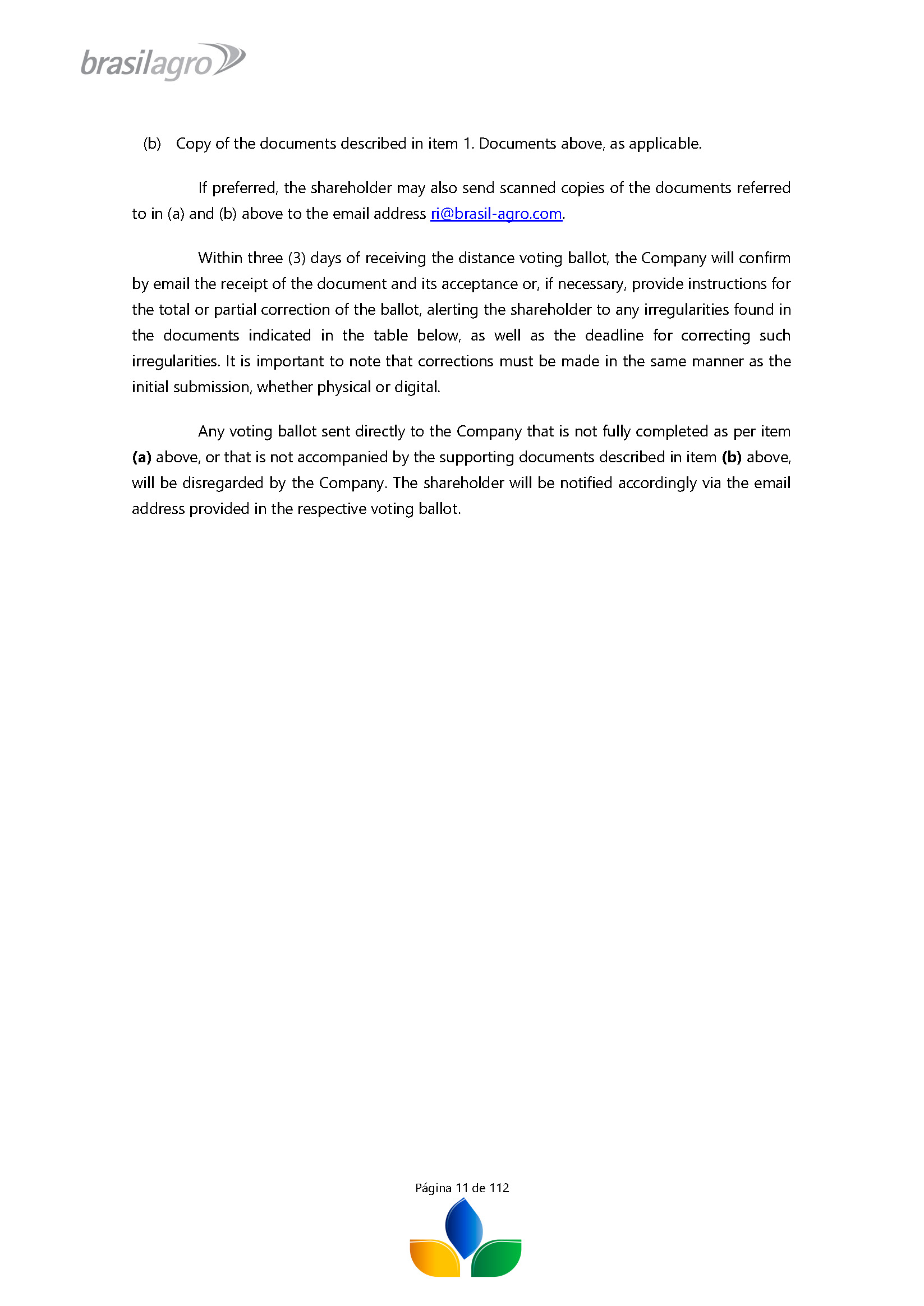 (b) Copy of the documents described in item 1. Documents above, as applicable. If preferred, the shareholder may also send scanned copies of the documents referred to in (a) and (b) above to the email address ri@brasil - agro . com . Within three ( 3 ) days of receiving the distance voting ballot, the Company will confirm by email the receipt of the document and its acceptance or, if necessary, provide instructions for the total or partial correction of the ballot, alerting the shareholder to any irregularities found in the documents indicated in the table below, as well as the deadline for correcting such irregularities . It is important to note that corrections must be made in the same manner as the initial submission, whether physical or digital . Any voting ballot sent directly to the Company that is not fully completed as per item (a) above, or that is not accompanied by the supporting documents described in item (b) above, will be disregarded by the Company. The shareholder will be notified accordingly via the email address provided in the respective voting ballot. Página 11 de 112