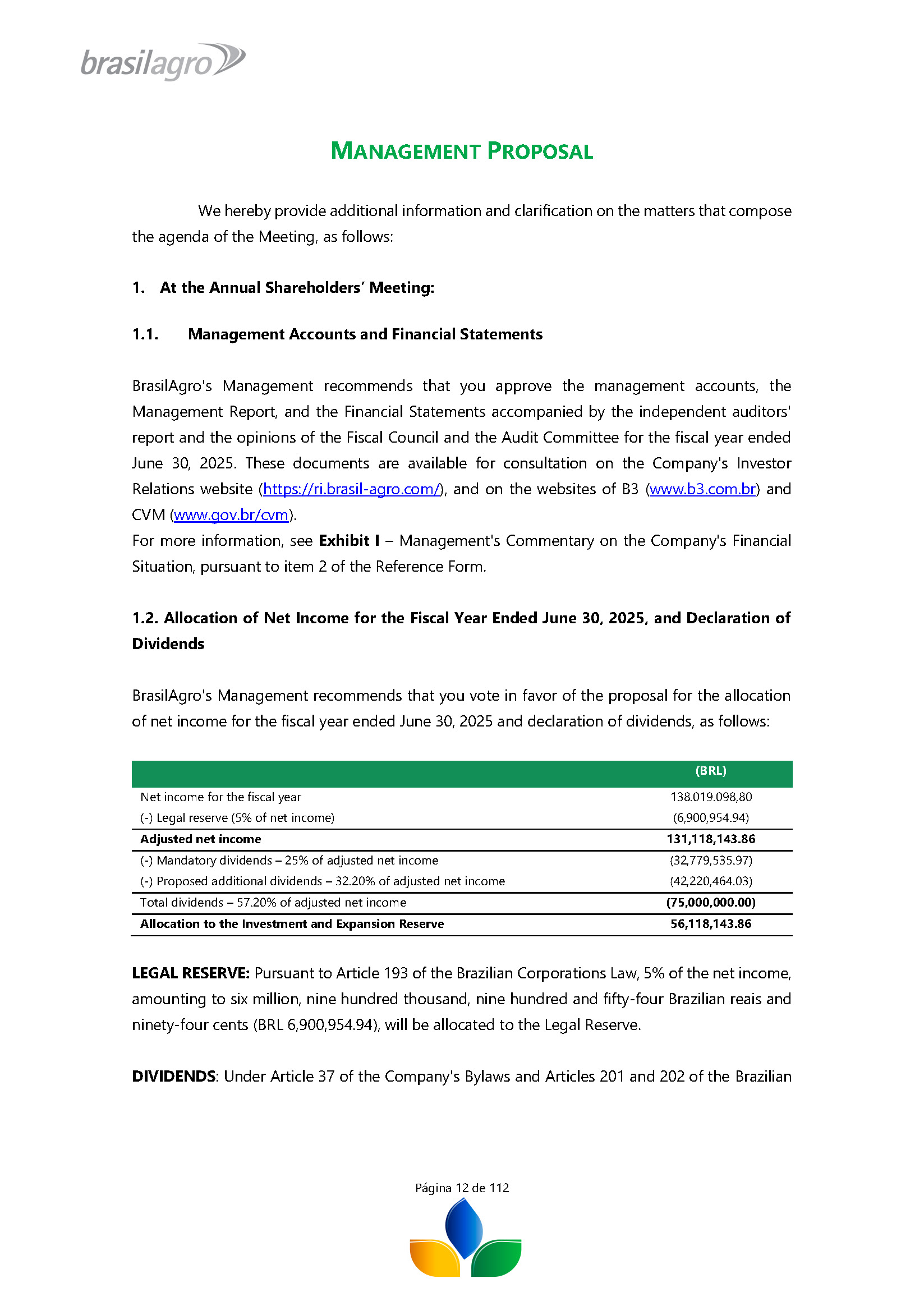 M ANAGEMENT P ROPOSAL We hereby provide additional information and clarification on the matters that compose the agenda of the Meeting, as follows: 1. At the Annual Shareholders’ Meeting: 1. Management Accounts and Financial Statements BrasilAgro's Management recommends that you approve the management accounts, the Management Report, and the Financial Statements accompanied by the independent auditors' report and the opinions of the Fiscal Council and the Audit Committee for the fiscal year ended June 30 , 2025 . These documents are available for consultation on the Company's Investor Relations website ( https : //ri . brasil - agro . com/ ), and on the websites of B 3 ( www . b 3 . com . br ) and CVM ( www . gov . br/cvm ) . For more information, see Exhibit I – Management's Commentary on the Company's Financial Situation, pursuant to item 2 of the Reference Form . 2. Allocation of Net Income for the Fiscal Year Ended June 30, 2025, and Declaration of Dividends BrasilAgro's Management recommends that you vote in favor of the proposal for the allocation of net income for the fiscal year ended June 30 , 2025 and declaration of dividends, as follows : Página 12 de 112 (BRL) 138.019.098,80 Net income for the fiscal year (6,900,954.94) ( - ) Legal reserve (5% of net income) 131,118,143.86 Adjusted net income (32,779,535.97) ( - ) Mandatory dividends – 25% of adjusted net income (42,220,464.03) ( - ) Proposed additional dividends – 32.20% of adjusted net income (75,000,000.00) Total dividends – 57.20% of adjusted net income 56,118,143.86 Allocation to the Investment and Expansion Reserve LEGAL RESERVE : Pursuant to Article 193 of the Brazilian Corporations Law, 5 % of the net income, amounting to six million, nine hundred thousand, nine hundred and fifty - four Brazilian reais and ninety - four cents (BRL 6 , 900 , 954 . 94 ), will be allocated to the Legal Reserve . DIVIDENDS : Under Article 37 of the Company's Bylaws and Articles 201 and 202 of the Brazilian