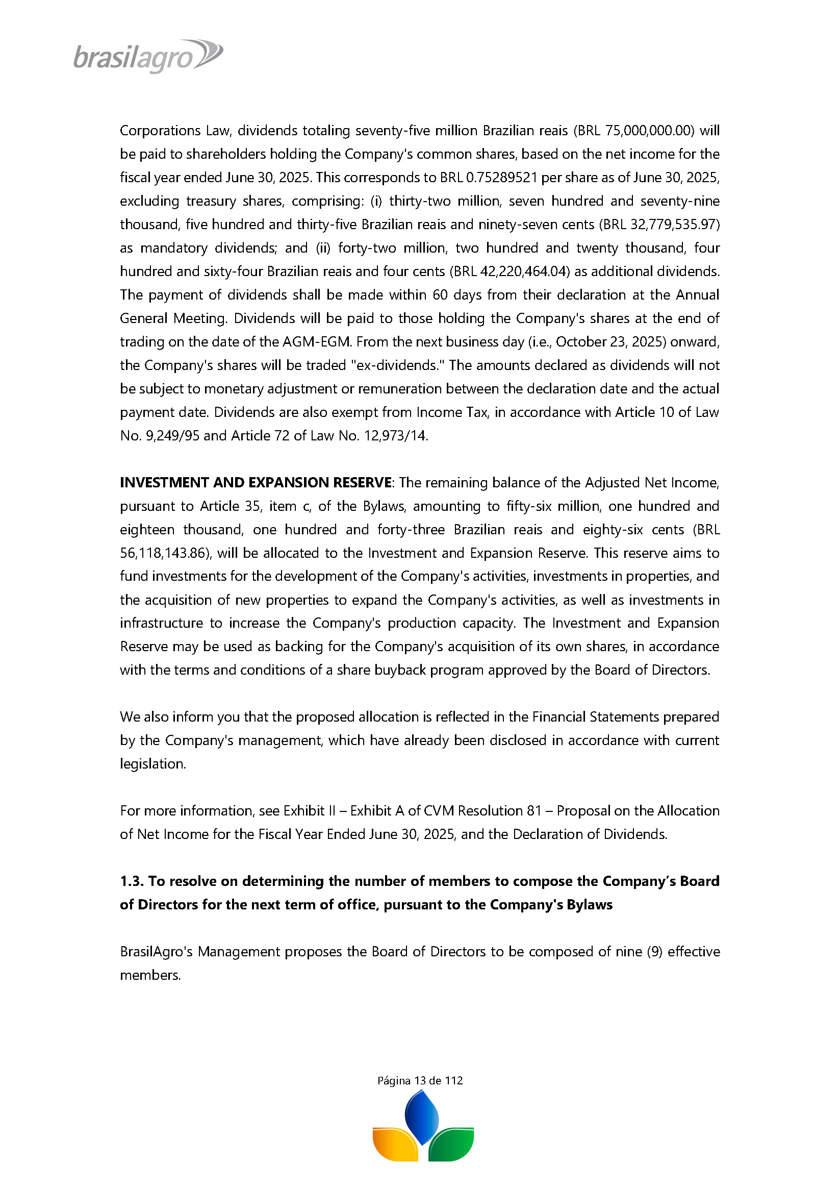 Corporations Law, dividends totaling seventy - five million Brazilian reais (BRL 75 , 000 , 000 . 00 ) will be paid to shareholders holding the Company's common shares, based on the net income for the fiscal year ended June 30 , 2025 . This corresponds to BRL 0 . 75289521 per share as of June 30 , 2025 , excluding treasury shares, comprising : (i) thirty - two million, seven hundred and seventy - nine thousand, five hundred and thirty - five Brazilian reais and ninety - seven cents (BRL 32 , 779 , 535 . 97 ) as mandatory dividends ; and (ii) forty - two million, two hundred and twenty thousand, four hundred and sixty - four Brazilian reais and four cents (BRL 42 , 220 , 464 . 04 ) as additional dividends . The payment of dividends shall be made within 60 days from their declaration at the Annual General Meeting . Dividends will be paid to those holding the Company's shares at the end of trading on the date of the AGM - EGM . From the next business day (i . e . , October 23 , 2025 ) onward, the Company's shares will be traded "ex - dividends . " The amounts declared as dividends will not be subject to monetary adjustment or remuneration between the declaration date and the actual payment date . Dividends are also exempt from Income Tax, in accordance with Article 10 of Law No . 9 , 249 / 95 and Article 72 of Law No . 12 , 973 / 14 . INVESTMENT AND EXPANSION RESERVE : The remaining balance of the Adjusted Net Income, pursuant to Article 35 , item c, of the Bylaws, amounting to fifty - six million, one hundred and eighteen thousand, one hundred and forty - three Brazilian reais and eighty - six cents (BRL 56 , 118 , 143 . 86 ), will be allocated to the Investment and Expansion Reserve . This reserve aims to fund investments for the development of the Company's activities, investments in properties, and the acquisition of new properties to expand the Company's activities, as well as investments in infrastructure to increase the Company's production capacity . The Investment and Expansion Reserve may be used as backing for the Company's acquisition of its own shares, in accordance with the terms and conditions of a share buyback program approved by the Board of Directors . We also inform you that the proposed allocation is reflected in the Financial Statements prepared by the Company's management, which have already been disclosed in accordance with current legislation . For more information, see Exhibit II – Exhibit A of CVM Resolution 81 – Proposal on the Allocation of Net Income for the Fiscal Year Ended June 30 , 2025 , and the Declaration of Dividends . 1.3. To resolve on determining the number of members to compose the Company’s Board of Directors for the next term of office, pursuant to the Company's Bylaws BrasilAgro's Management proposes the Board of Directors to be composed of nine ( 9 ) effective members . Página 13 de 112
