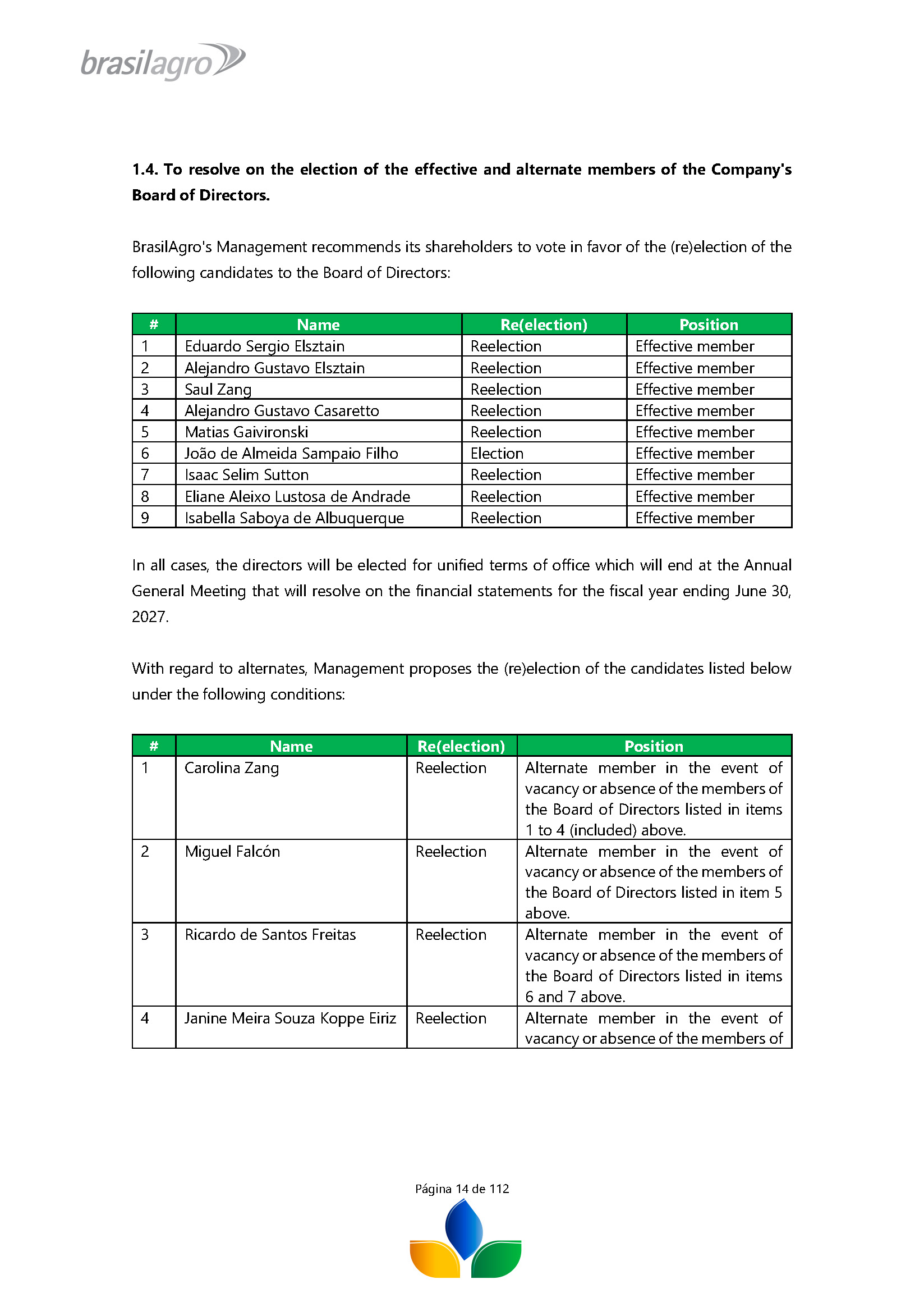 1.4. To resolve on the election of the effective and alternate members of the Company's Board of Directors. BrasilAgro's Management recommends its shareholders to vote in favor of the (re)election of the following candidates to the Board of Directors: Página 14 de 112 Position Re(election) Name # Effective member Reelection Eduardo Sergio Elsztain 1 Effective member Reelection Alejandro Gustavo Elsztain 2 Effective member Reelection Saul Zang 3 Effective member Reelection Alejandro Gustavo Casaretto 4 Effective member Reelection Matias Gaivironski 5 Effective member Election João de Almeida Sampaio Filho 6 Effective member Reelection Isaac Selim Sutton 7 Effective member Reelection Eliane Aleixo Lustosa de Andrade 8 Effective member Reelection Isabella Saboya de Albuquerque 9 In all cases, the directors will be elected for unified terms of office which will end at the Annual General Meeting that will resolve on the financial statements for the fiscal year ending June 30 , 2027 . With regard to alternates, Management proposes the (re)election of the candidates listed below under the following conditions : Position Re(election) Name # Alternate member in the event of vacancy or absence of the members of the Board of Directors listed in items 1 to 4 (included) above . Reelection Carolina Zang 1 Alternate member in the event of vacancy or absence of the members of the Board of Directors listed in item 5 above . Reelection Miguel Falcón 2 Alternate member in the event of vacancy or absence of the members of the Board of Directors listed in items 6 and 7 above . Reelection Ricardo de Santos Freitas 3 Alternate member in the event of vacancy or absence of the members of Reelection Janine Meira Souza Koppe Eiriz 4
