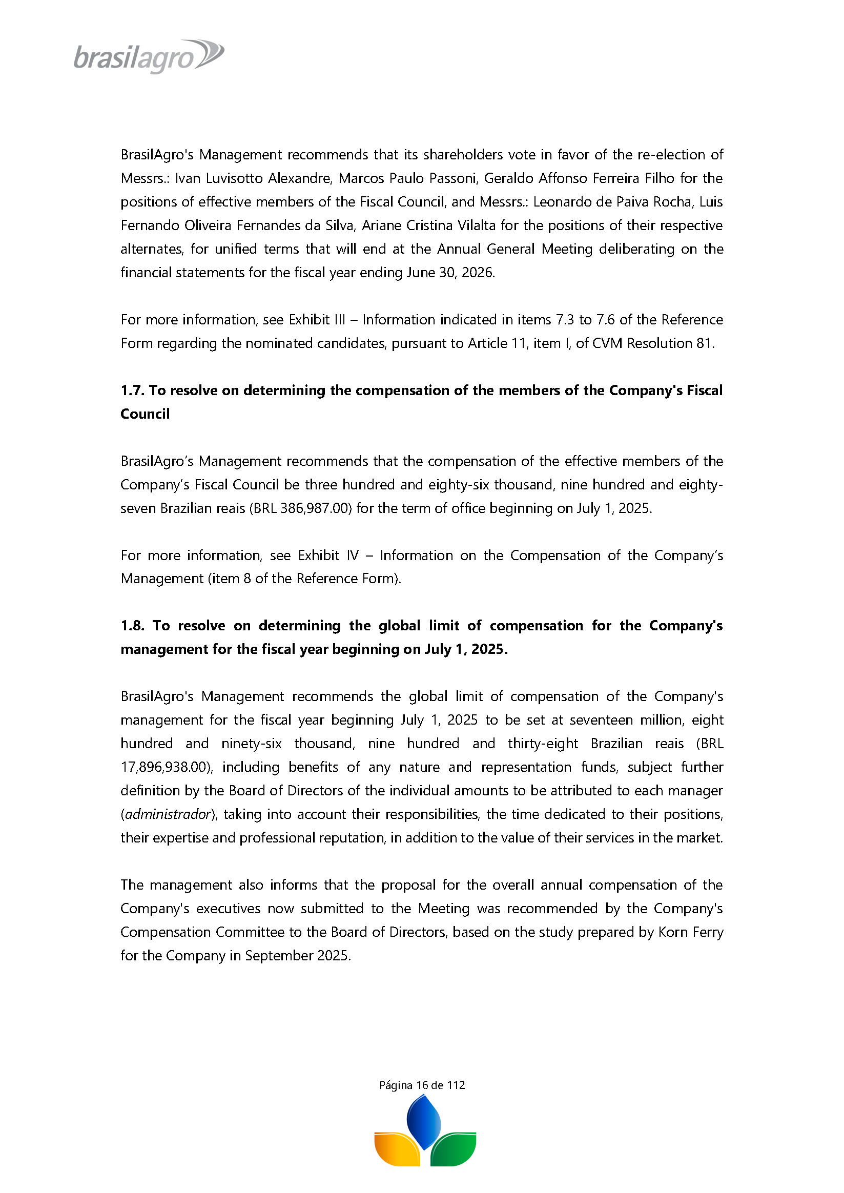 BrasilAgro's Management recommends that its shareholders vote in favor of the re - election of Messrs .: Ivan Luvisotto Alexandre, Marcos Paulo Passoni, Geraldo Affonso Ferreira Filho for the positions of effective members of the Fiscal Council, and Messrs .: Leonardo de Paiva Rocha, Luis Fernando Oliveira Fernandes da Silva, Ariane Cristina Vilalta for the positions of their respective alternates, for unified terms that will end at the Annual General Meeting deliberating on the financial statements for the fiscal year ending June 30 , 2026 . For more information, see Exhibit III – Information indicated in items 7 . 3 to 7 . 6 of the Reference Form regarding the nominated candidates, pursuant to Article 11 , item I, of CVM Resolution 81 . 7. To resolve on determining the compensation of the members of the Company's Fiscal Council BrasilAgro’s Management recommends that the compensation of the effective members of the Company’s Fiscal Council be three hundred and eighty - six thousand, nine hundred and eighty - seven Brazilian reais (BRL 386 , 987 . 00 ) for the term of office beginning on July 1 , 2025 . For more information, see Exhibit IV – Information on the Compensation of the Company’s Management (item 8 of the Reference Form) . 8. To resolve on determining the global limit of compensation for the Company's management for the fiscal year beginning on July 1, 2025. BrasilAgro's Management recommends the global limit of compensation of the Company's management for the fiscal year beginning July 1 , 2025 to be set at seventeen million, eight hundred and ninety - six thousand, nine hundred and thirty - eight Brazilian reais (BRL 17 , 896 , 938 . 00 ), including benefits of any nature and representation funds, subject further definition by the Board of Directors of the individual amounts to be attributed to each manager ( administrador ), taking into account their responsibilities, the time dedicated to their positions, their expertise and professional reputation, in addition to the value of their services in the market . The management also informs that the proposal for the overall annual compensation of the Company's executives now submitted to the Meeting was recommended by the Company's Compensation Committee to the Board of Directors, based on the study prepared by Korn Ferry for the Company in September 2025 . Página 16 de 112