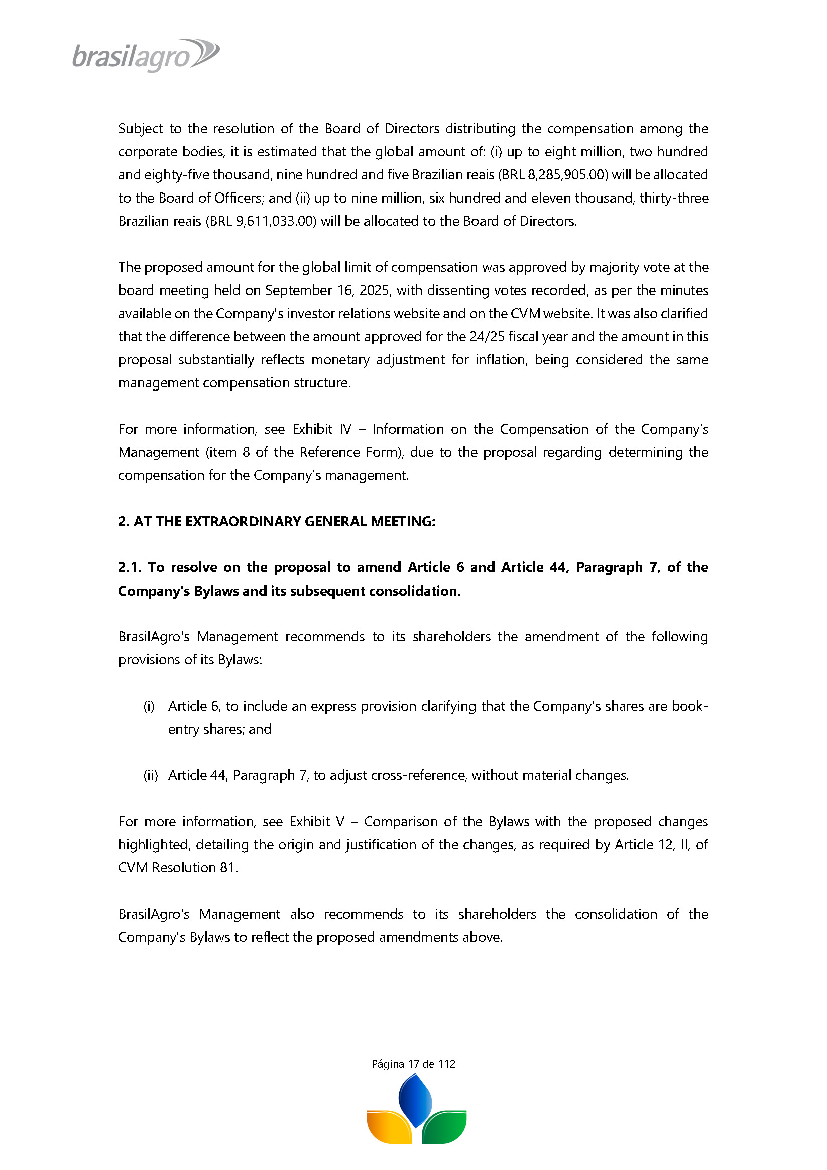 Subject to the resolution of the Board of Directors distributing the compensation among the corporate bodies, it is estimated that the global amount of : (i) up to eight million, two hundred and eighty - five thousand, nine hundred and five Brazilian reais (BRL 8 , 285 , 905 . 00 ) will be allocated to the Board of Officers ; and (ii) up to nine million, six hundred and eleven thousand, thirty - three Brazilian reais (BRL 9 , 611 , 033 . 00 ) will be allocated to the Board of Directors . The proposed amount for the global limit of compensation was approved by majority vote at the board meeting held on September 16 , 2025 , with dissenting votes recorded, as per the minutes available on the Company's investor relations website and on the CVM website . It was also clarified that the difference between the amount approved for the 24 / 25 fiscal year and the amount in this proposal substantially reflects monetary adjustment for inflation, being considered the same management compensation structure . For more information, see Exhibit IV – Information on the Compensation of the Company’s Management (item 8 of the Reference Form), due to the proposal regarding determining the compensation for the Company’s management . 2. AT THE EXTRAORDINARY GENERAL MEETING: 1. To resolve on the proposal to amend Article 6 and Article 44, Paragraph 7, of the Company's Bylaws and its subsequent consolidation. BrasilAgro's Management recommends to its shareholders the amendment of the following provisions of its Bylaws : (i) Article 6, to include an express provision clarifying that the Company's shares are book - entry shares; and (ii) Article 44, Paragraph 7, to adjust cross - reference, without material changes. For more information, see Exhibit V – Comparison of the Bylaws with the proposed changes highlighted, detailing the origin and justification of the changes, as required by Article 12 , II, of CVM Resolution 81 . BrasilAgro's Management also recommends to its shareholders the consolidation of the Company's Bylaws to reflect the proposed amendments above . Página 17 de 112
