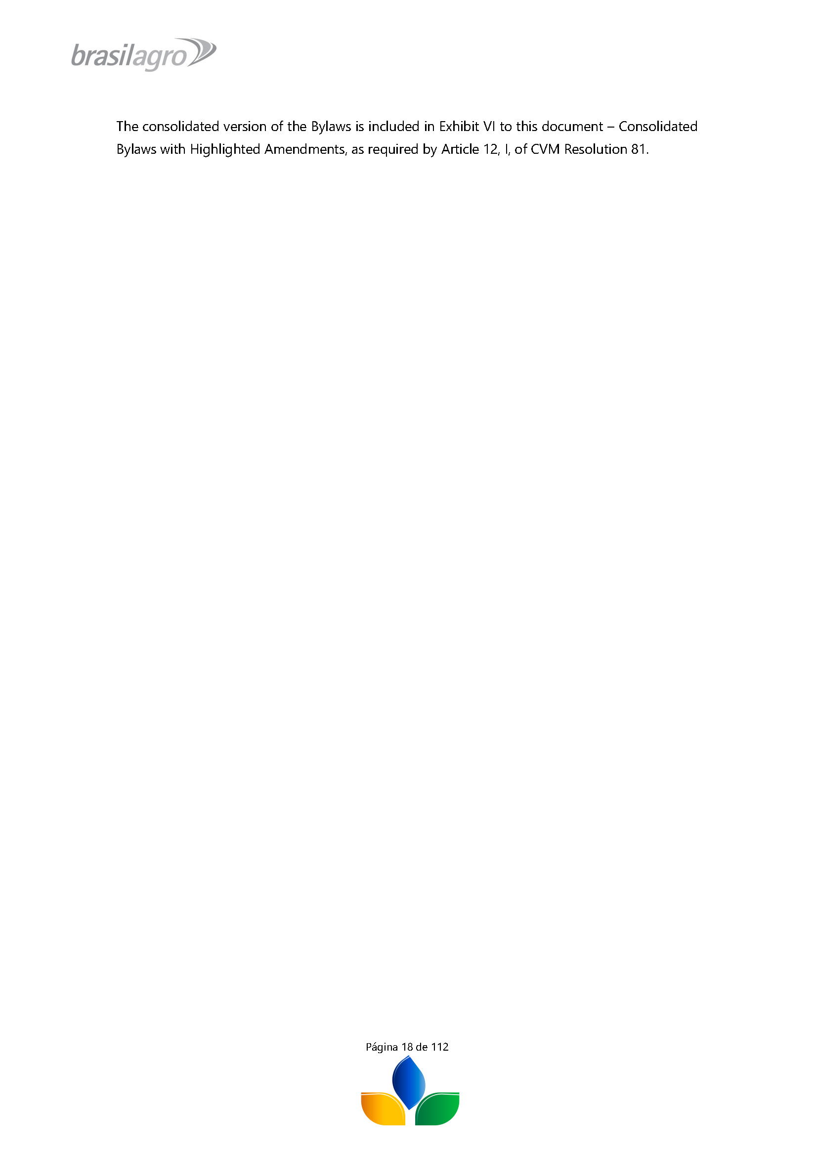 The consolidated version of the Bylaws is included in Exhibit VI to this document – Consolidated Bylaws with Highlighted Amendments, as required by Article 12, I, of CVM Resolution 81. Página 18 de 112