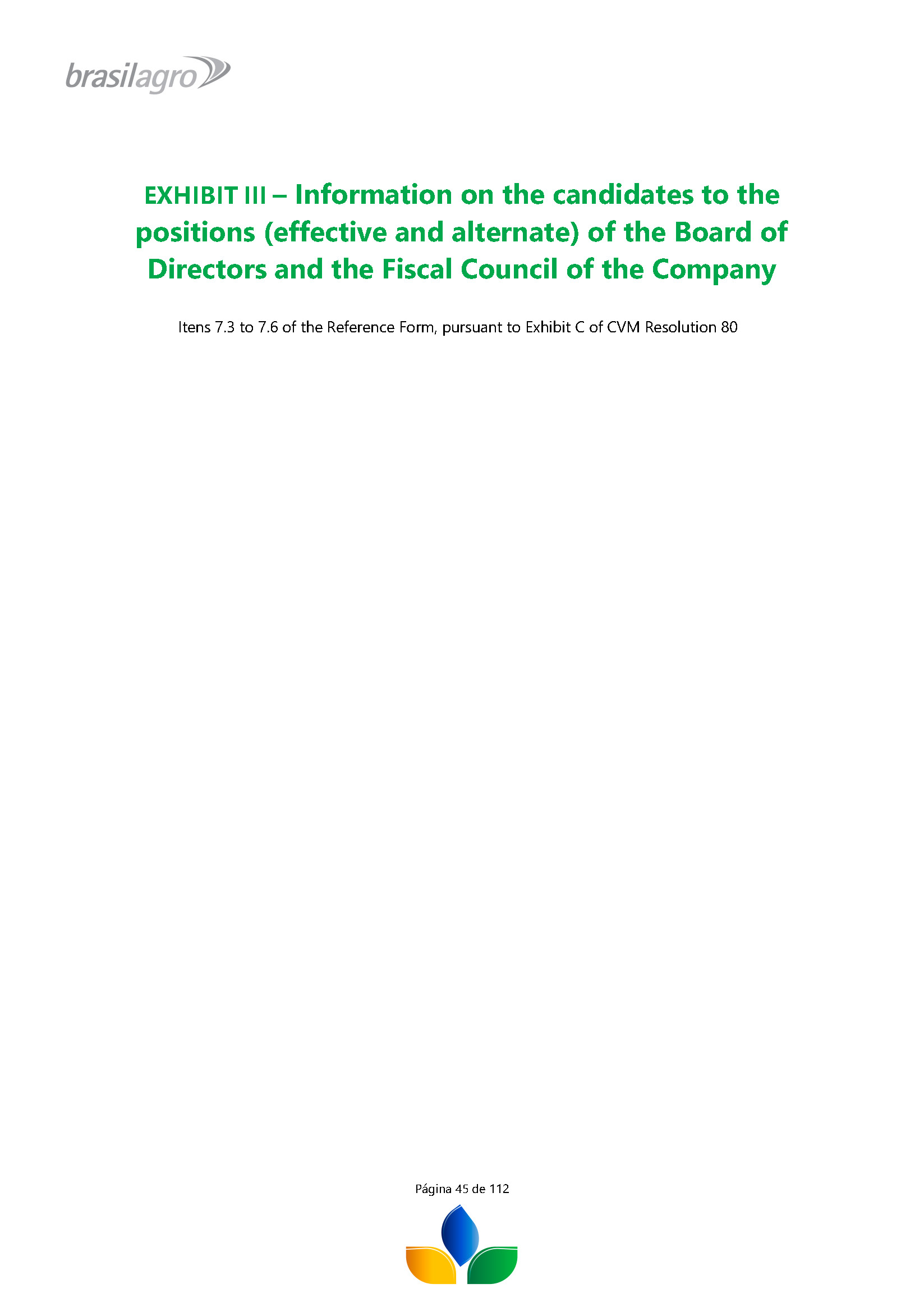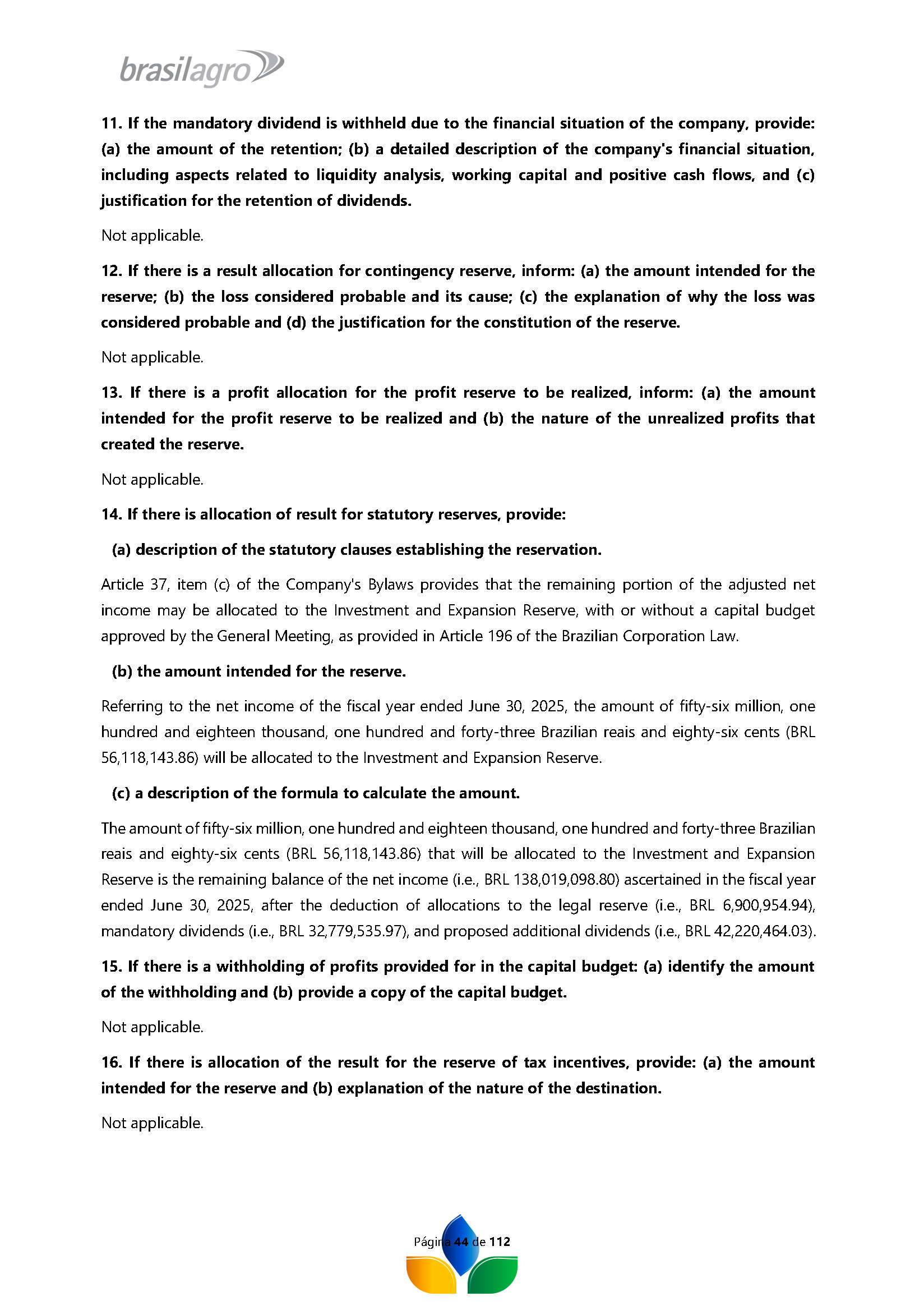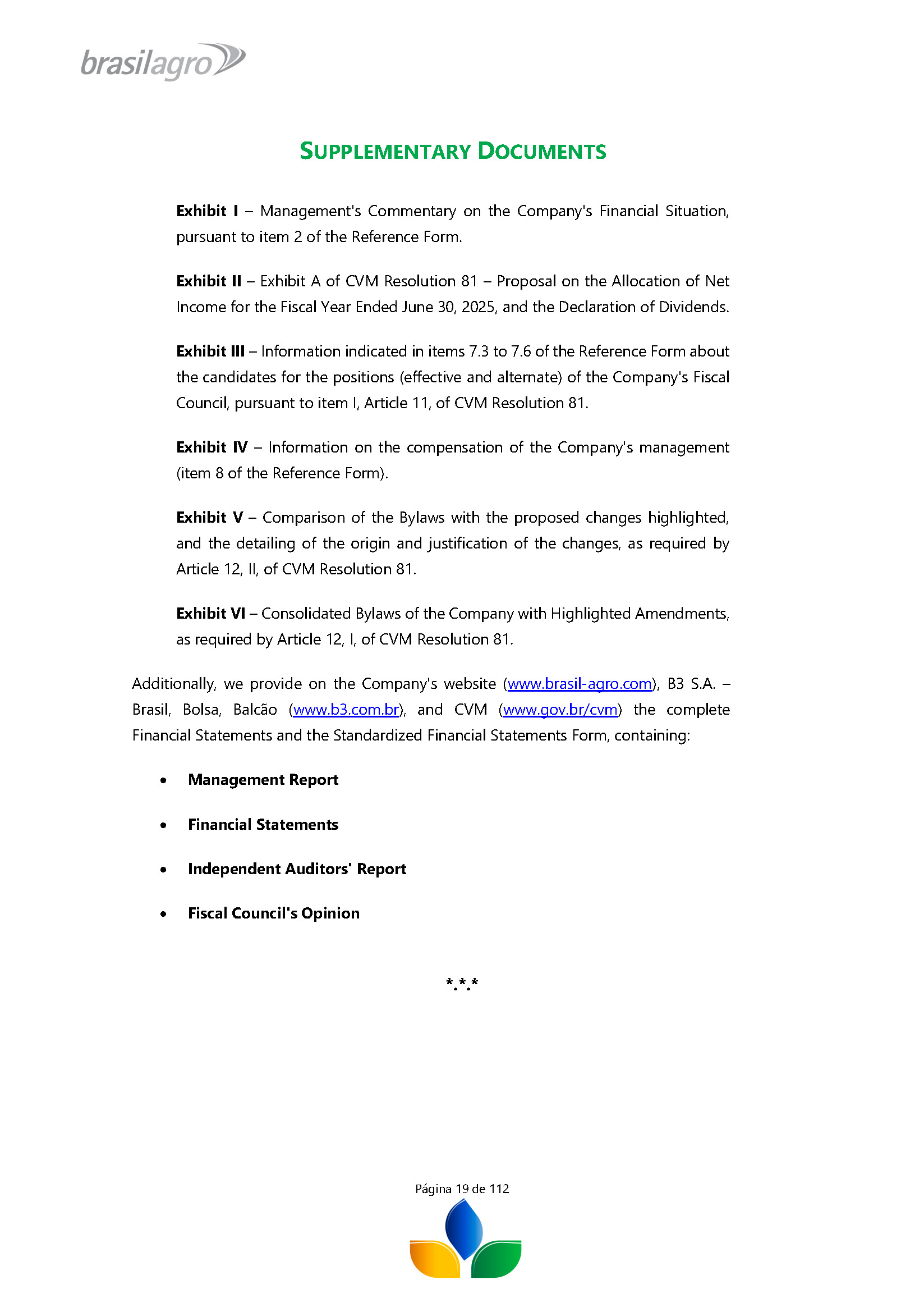 S UPPLEMENTARY D OCUMENTS Exhibit I – Management's Commentary on the Company's Financial Situation, pursuant to item 2 of the Reference Form . Exhibit II – Exhibit A of CVM Resolution 81 – Proposal on the Allocation of Net Income for the Fiscal Year Ended June 30 , 2025 , and the Declaration of Dividends . Exhibit III – Information indicated in items 7 . 3 to 7 . 6 of the Reference Form about the candidates for the positions (effective and alternate) of the Company's Fiscal Council, pursuant to item I, Article 11 , of CVM Resolution 81 . Exhibit IV – Information on the compensation of the Company's management (item 8 of the Reference Form) . Exhibit V – Comparison of the Bylaws with the proposed changes highlighted, and the detailing of the origin and justification of the changes, as required by Article 12 , II, of CVM Resolution 81 . Exhibit VI – Consolidated Bylaws of the Company with Highlighted Amendments, as required by Article 12 , I, of CVM Resolution 81 . Additionally, we provide on the Company's website ( www . brasil - agro . com ), B 3 S . A . – Brasil, Bolsa, Balcão ( www . b 3 . com . br ), and CVM ( www . gov . br/cvm ) the complete Financial Statements and the Standardized Financial Statements Form, containing :  Management Report  Financial Statements  Independent Auditors' Report  Fiscal Council's Opinion Página 19 de 112 *.*.*