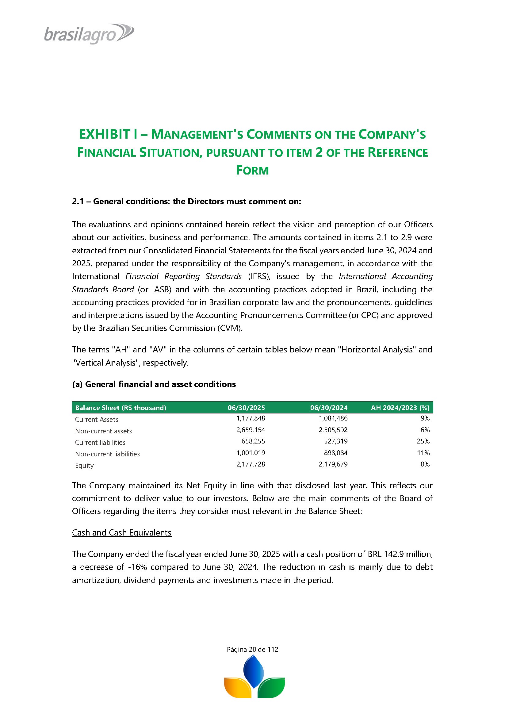 EXHIBIT I – M ANAGEMENT ' S C OMMENTS ON THE C OMPANY ' S F INANCIAL S ITUATION , PURSUANT TO ITEM 2 OF THE R EFERENCE F ORM 2.1 – General conditions: the Directors must comment on: The evaluations and opinions contained herein reflect the vision and perception of our Officers about our activities, business and performance . The amounts contained in items 2 . 1 to 2 . 9 were extracted from our Consolidated Financial Statements for the fiscal years ended June 30 , 2024 and 2025 , prepared under the responsibility of the Company's management, in accordance with the International Financial Reporting Standards (IFRS), issued by the International Accounting Standards Board (or IASB) and with the accounting practices adopted in Brazil, including the accounting practices provided for in Brazilian corporate law and the pronouncements, guidelines and interpretations issued by the Accounting Pronouncements Committee (or CPC) and approved by the Brazilian Securities Commission (CVM) . The terms "AH" and "AV" in the columns of certain tables below mean "Horizontal Analysis" and "Vertical Analysis", respectively . (a) General financial and asset conditions Página 20 de 112 AH 2024/2023 (%) 06/30/2024 06/30/2025 Balance Sheet (R$ thousand) 9% 1,084,486 1,177,848 Current Assets 6% 2,505,592 2,659,154 Non - current assets 25% 527,319 658,255 Current liabilities 11% 898,084 1,001,019 Non - current liabilities 0% 2,179,679 2,177,728 Equity The Company maintained its Net Equity in line with that disclosed last year . This reflects our commitment to deliver value to our investors . Below are the main comments of the Board of Officers regarding the items they consider most relevant in the Balance Sheet : Cash and Cash Equivalents The Company ended the fiscal year ended June 30 , 2025 with a cash position of BRL 142 . 9 million, a decrease of - 16 % compared to June 30 , 2024 . The reduction in cash is mainly due to debt amortization, dividend payments and investments made in the period .