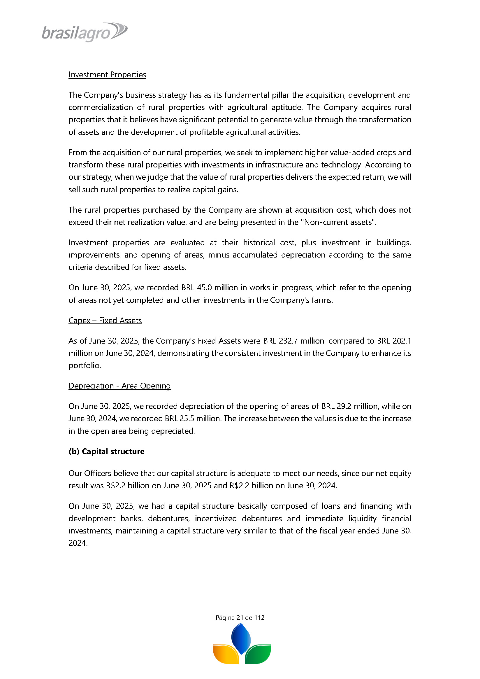 Investment Properties The Company's business strategy has as its fundamental pillar the acquisition, development and commercialization of rural properties with agricultural aptitude . The Company acquires rural properties that it believes have significant potential to generate value through the transformation of assets and the development of profitable agricultural activities . From the acquisition of our rural properties, we seek to implement higher value - added crops and transform these rural properties with investments in infrastructure and technology . According to our strategy, when we judge that the value of rural properties delivers the expected return, we will sell such rural properties to realize capital gains . The rural properties purchased by the Company are shown at acquisition cost, which does not exceed their net realization value, and are being presented in the "Non - current assets" . Investment properties are evaluated at their historical cost, plus investment in buildings, improvements, and opening of areas, minus accumulated depreciation according to the same criteria described for fixed assets . On June 30 , 2025 , we recorded BRL 45 . 0 million in works in progress, which refer to the opening of areas not yet completed and other investments in the Company's farms . Capex – Fixed Assets As of June 30 , 2025 , the Company's Fixed Assets were BRL 232 . 7 million, compared to BRL 202 . 1 million on June 30 , 2024 , demonstrating the consistent investment in the Company to enhance its portfolio . Depreciation - Area Opening On June 30 , 2025 , we recorded depreciation of the opening of areas of BRL 29 . 2 million, while on June 30 , 2024 , we recorded BRL 25 . 5 million . The increase between the values is due to the increase in the open area being depreciated . (b) Capital structure Our Officers believe that our capital structure is adequate to meet our needs, since our net equity result was R $ 2 . 2 billion on June 30 , 2025 and R $ 2 . 2 billion on June 30 , 2024 . On June 30 , 2025 , we had a capital structure basically composed of loans and financing with development banks, debentures, incentivized debentures and immediate liquidity financial investments, maintaining a capital structure very similar to that of the fiscal year ended June 30 , 2024 . Página 21 de 112