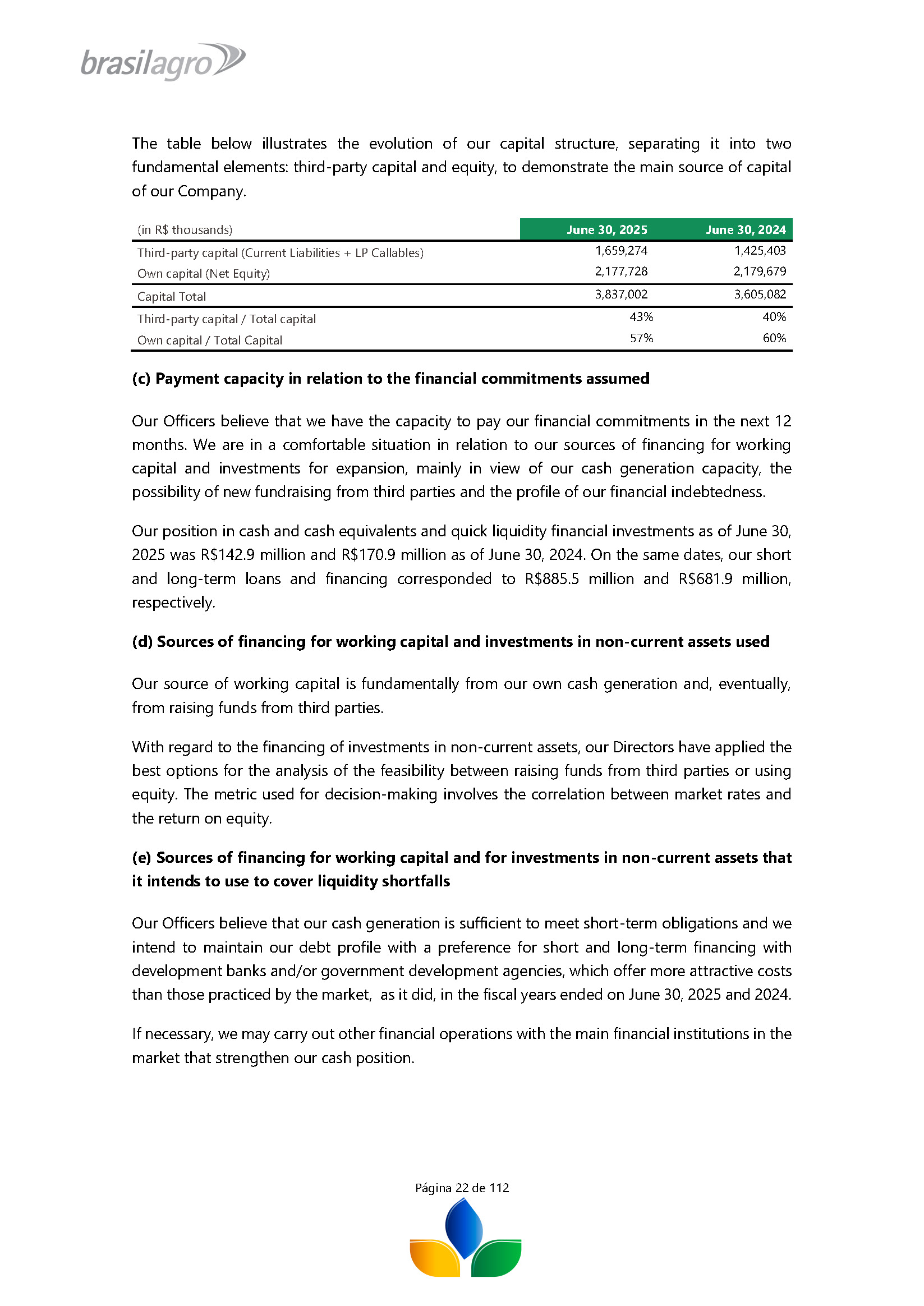 The table below illustrates the evolution of our capital structure, separating it into two fundamental elements : third - party capital and equity, to demonstrate the main source of capital of our Company . Página 22 de 112 June 30, 2024 June 30, 2025 (in R$ thousands) 1,425,403 1,659,274 Third - party capital (Current Liabilities + LP Callables) 2,179,679 2,177,728 Own capital (Net Equity) 3,605,082 3,837,002 Capital Total 40% 43% Third - party capital / Total capital 60% 57% Own capital / Total Capital (c) Payment capacity in relation to the financial commitments assumed Our Officers believe that we have the capacity to pay our financial commitments in the next 12 months . We are in a comfortable situation in relation to our sources of financing for working capital and investments for expansion, mainly in view of our cash generation capacity, the possibility of new fundraising from third parties and the profile of our financial indebtedness . Our position in cash and cash equivalents and quick liquidity financial investments as of June 30 , 2025 was R $ 142 . 9 million and R $ 170 . 9 million as of June 30 , 2024 . On the same dates, our short and long - term loans and financing corresponded to R $ 885 . 5 million and R $ 681 . 9 million, respectively . (d) Sources of financing for working capital and investments in non - current assets used Our source of working capital is fundamentally from our own cash generation and, eventually, from raising funds from third parties . With regard to the financing of investments in non - current assets, our Directors have applied the best options for the analysis of the feasibility between raising funds from third parties or using equity . The metric used for decision - making involves the correlation between market rates and the return on equity . (e) Sources of financing for working capital and for investments in non - current assets that it intends to use to cover liquidity shortfalls Our Officers believe that our cash generation is sufficient to meet short - term obligations and we intend to maintain our debt profile with a preference for short and long - term financing with development banks and/or government development agencies, which offer more attractive costs than those practiced by the market, as it did, in the fiscal years ended on June 30 , 2025 and 2024 . If necessary, we may carry out other financial operations with the main financial institutions in the market that strengthen our cash position .