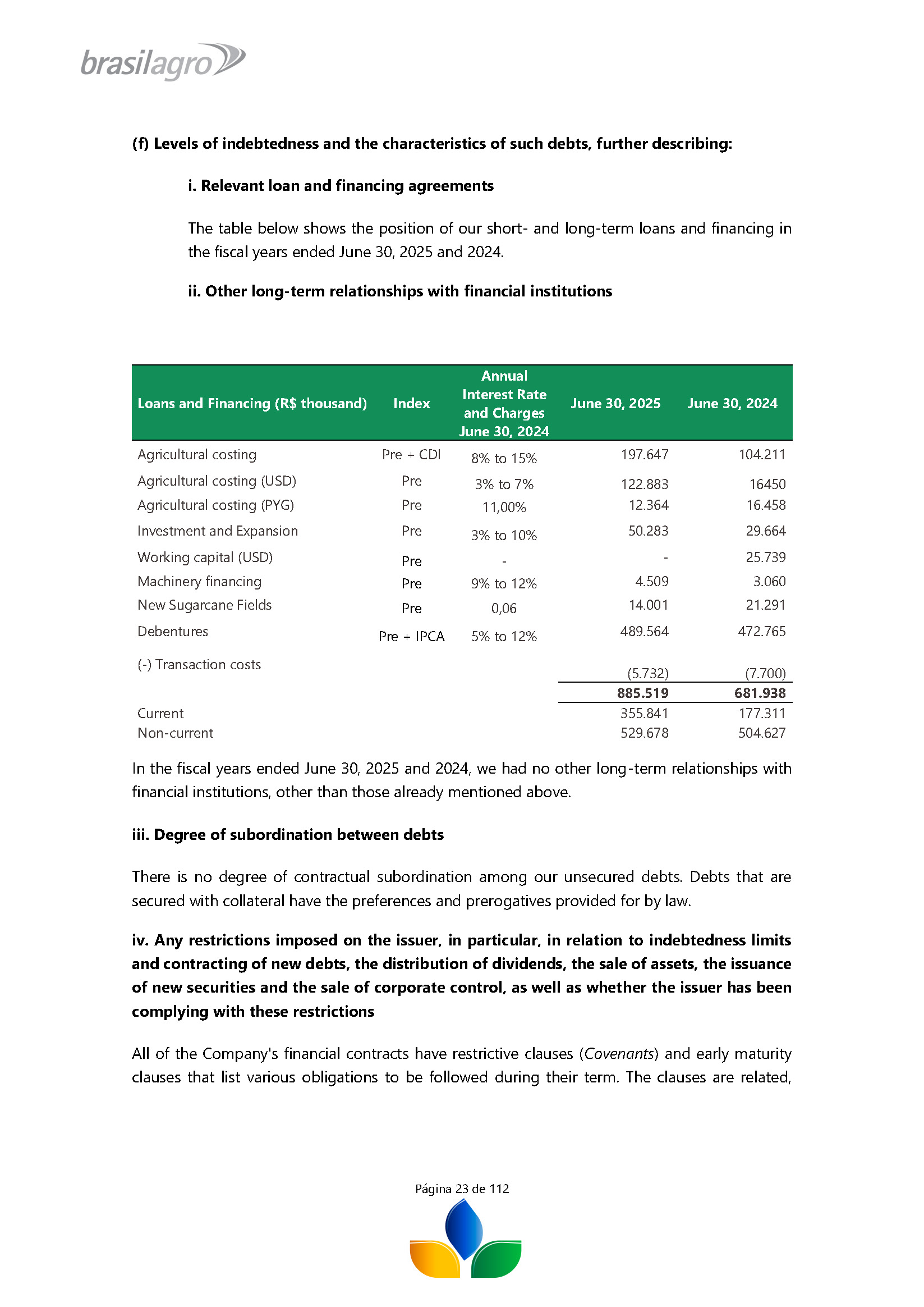 (f) Levels of indebtedness and the characteristics of such debts, further describing: i. Relevant loan and financing agreements The table below shows the position of our short - and long - term loans and financing in the fiscal years ended June 30, 2025 and 2024. ii. Other long - term relationships with financial institutions Página 23 de 112 June 30, 2024 June 30, 2025 Annual Interest Rate and Charges June 30 , 2024 Index Loans and Financing (R$ thousand) 104.211 197.647 8% to 15% Pre + CDI Agricultural costing 16450 122.883 3% to 7% Pre Agricultural costing (USD) 16.458 12.364 11,00% Pre Agricultural costing (PYG) 29.664 50.283 3% to 10% Pre Investment and Expansion 25.739 - - Pre Working capital (USD) 3.060 4.509 9% to 12% Pre Machinery financing 21.291 14.001 0,06 Pre New Sugarcane Fields 472.765 489.564 5% to 12% Pre + IPCA Debentures (7.700) (5.732) ( - ) Transaction costs 681.938 885.519 177.311 355.841 Current 504.627 529.678 Non - current In the fiscal years ended June 30, 2025 and 2024, we had no other long - term relationships with financial institutions, other than those already mentioned above. iii. Degree of subordination between debts There is no degree of contractual subordination among our unsecured debts. Debts that are secured with collateral have the preferences and prerogatives provided for by law. iv. Any restrictions imposed on the issuer, in particular, in relation to indebtedness limits and contracting of new debts, the distribution of dividends, the sale of assets, the issuance of new securities and the sale of corporate control, as well as whether the issuer has been complying with these restrictions All of the Company's financial contracts have restrictive clauses ( Covenants ) and early maturity clauses that list various obligations to be followed during their term. The clauses are related,