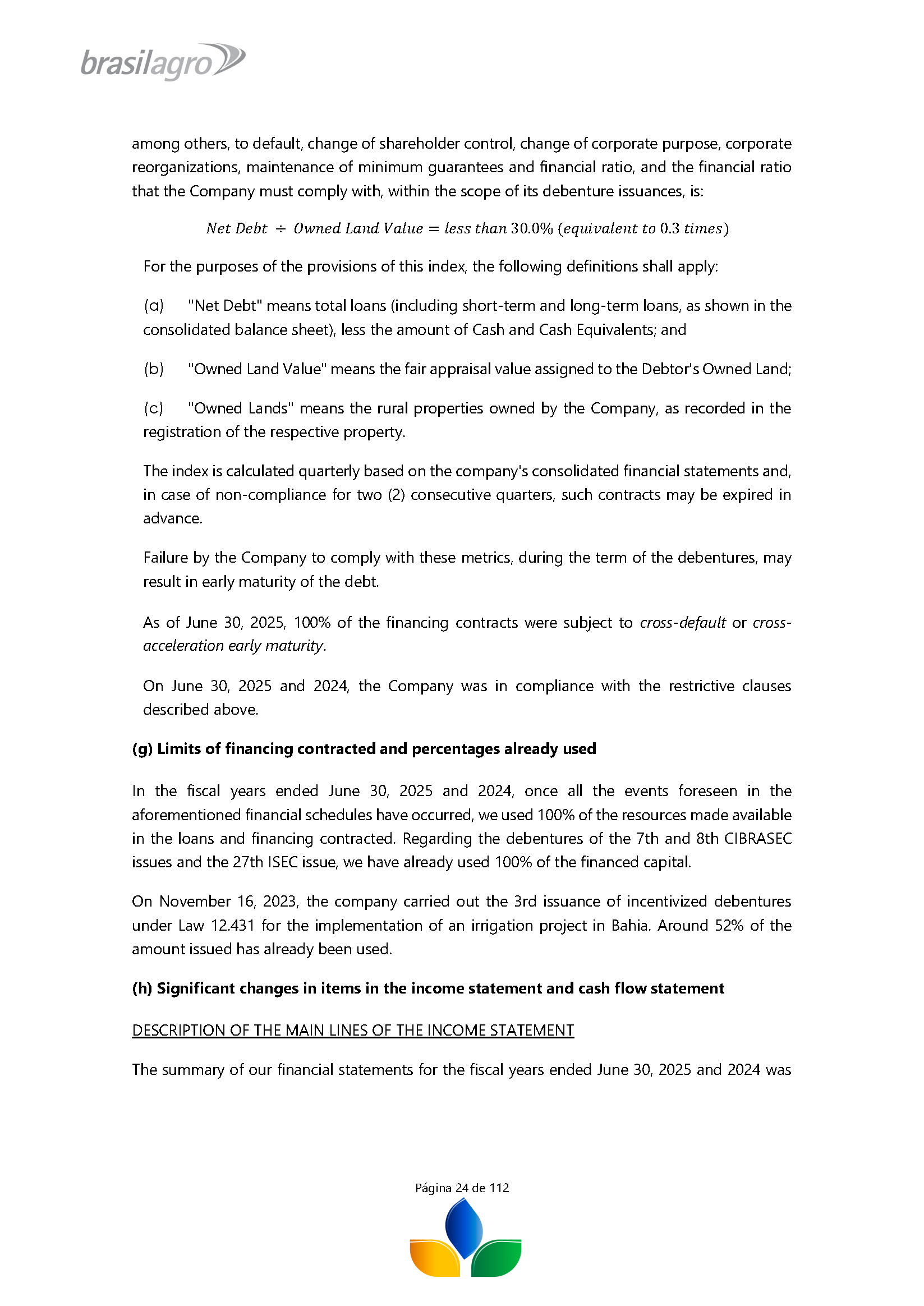 among others, to default, change of shareholder control, change of corporate purpose, corporate reorganizations, maintenance of minimum guarantees and financial ratio, and the financial ratio that the Company must comply with, within the scope of its debenture issuances, is : ܰ ݁ ݐ ܦ ݁ ܾ ݐ ൊ ܱ ݓ ݊ ݁ ݀ ܮ ܽ ݊ ݀ ܸ ܽ ݈ ݑ ݁ = ݈ ݁ ݏ ݏ ݐ ℎ ܽ ݊ 30.0% ( ݁ ݍ ݑ ݅ ݒ ܽ ݈ ݁ ݊ ݐ ݐ ݋ 0.3 ݐ ݅ ݉ ݁ ݏ ) For the purposes of the provisions of this index, the following definitions shall apply : (a) "Net Debt" means total loans (including short - term and long - term loans, as shown in the consolidated balance sheet), less the amount of Cash and Cash Equivalents; and (b) "Owned Land Value" means the fair appraisal value assigned to the Debtor's Owned Land; (c) "Owned Lands" means the rural properties owned by the Company, as recorded in the registration of the respective property. The index is calculated quarterly based on the company's consolidated financial statements and, in case of non - compliance for two ( 2 ) consecutive quarters, such contracts may be expired in advance . Failure by the Company to comply with these metrics, during the term of the debentures, may result in early maturity of the debt . As of June 30 , 2025 , 100 % of the financing contracts were subject to cross - default or cross - acceleration early maturity . On June 30 , 2025 and 2024 , the Company was in compliance with the restrictive clauses described above . (g) Limits of financing contracted and percentages already used In the fiscal years ended June 30 , 2025 and 2024 , once all the events foreseen in the aforementioned financial schedules have occurred, we used 100 % of the resources made available in the loans and financing contracted . Regarding the debentures of the 7 th and 8 th CIBRASEC issues and the 27 th ISEC issue, we have already used 100 % of the financed capital . On November 16 , 2023 , the company carried out the 3 rd issuance of incentivized debentures under Law 12 . 431 for the implementation of an irrigation project in Bahia . Around 52 % of the amount issued has already been used . (h) Significant changes in items in the income statement and cash flow statement DESCRIPTION OF THE MAIN LINES OF THE INCOME STATEMENT The summary of our financial statements for the fiscal years ended June 30 , 2025 and 2024 was Página 24 de 112