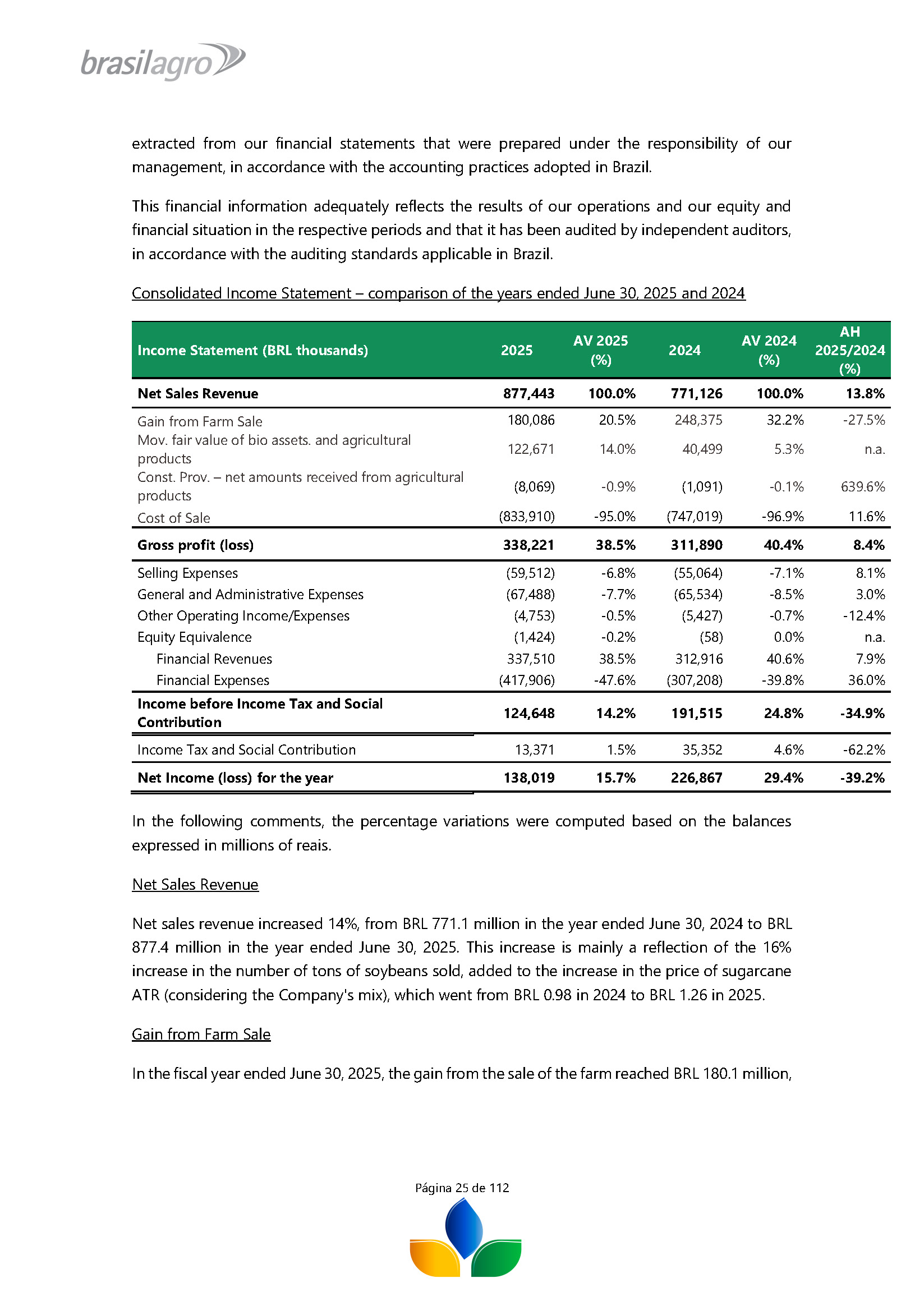 extracted from our financial statements that were prepared under the responsibility of our management, in accordance with the accounting practices adopted in Brazil . This financial information adequately reflects the results of our operations and our equity and financial situation in the respective periods and that it has been audited by independent auditors, in accordance with the auditing standards applicable in Brazil . Consolidated Income Statement – comparison of the years ended June 30 , 2025 and 2024 Página 25 de 112 AH 2025/2024 (%) AV 2024 (%) 2024 AV 2025 (%) 2025 Income Statement (BRL thousands) 13.8% 100.0% 771,126 100.0% 877,443 Net Sales Revenue - 27.5% 32.2% 248,375 20.5% 180,086 Gain from Farm Sale n.a. 5.3% 40,499 14.0% 122,671 Mov. fair value of bio assets. and agricultural products 639.6% - 0.1% (1,091) - 0.9% (8,069) Const. Prov. – net amounts received from agricultural products 11.6% - 96.9% (747,019) - 95.0% (833,910) Cost of Sale 8.4% 40.4% 311,890 38.5% 338,221 Gross profit (loss) 8.1% - 7.1% (55,064) - 6.8% (59,512) Selling Expenses 3.0% - 8.5% (65,534) - 7.7% (67,488) General and Administrative Expenses - 12.4% - 0.7% (5,427) - 0.5% (4,753) Other Operating Income/Expenses n.a. 0.0% (58) - 0.2% (1,424) Equity Equivalence 7.9% 40.6% 312,916 38.5% 337,510 Financial Revenues 36.0% - 39.8% (307,208) - 47.6% (417,906) Financial Expenses - 34.9% 24.8% 191,515 14.2% 124,648 Income before Income Tax and Social Contribution - 62.2% 4.6% 35,352 1.5% 13,371 Income Tax and Social Contribution - 39.2% 29.4% 226,867 15.7% 138,019 Net Income (loss) for the year In the following comments, the percentage variations were computed based on the balances expressed in millions of reais. Net Sales Revenue Net sales revenue increased 14%, from BRL 771.1 million in the year ended June 30, 2024 to BRL 877.4 million in the year ended June 30, 2025. This increase is mainly a reflection of the 16% increase in the number of tons of soybeans sold, added to the increase in the price of sugarcane ATR (considering the Company's mix), which went from BRL 0.98 in 2024 to BRL 1.26 in 2025. Gain from Farm Sale In the fiscal year ended June 30, 2025, the gain from the sale of the farm reached BRL 180.1 million,