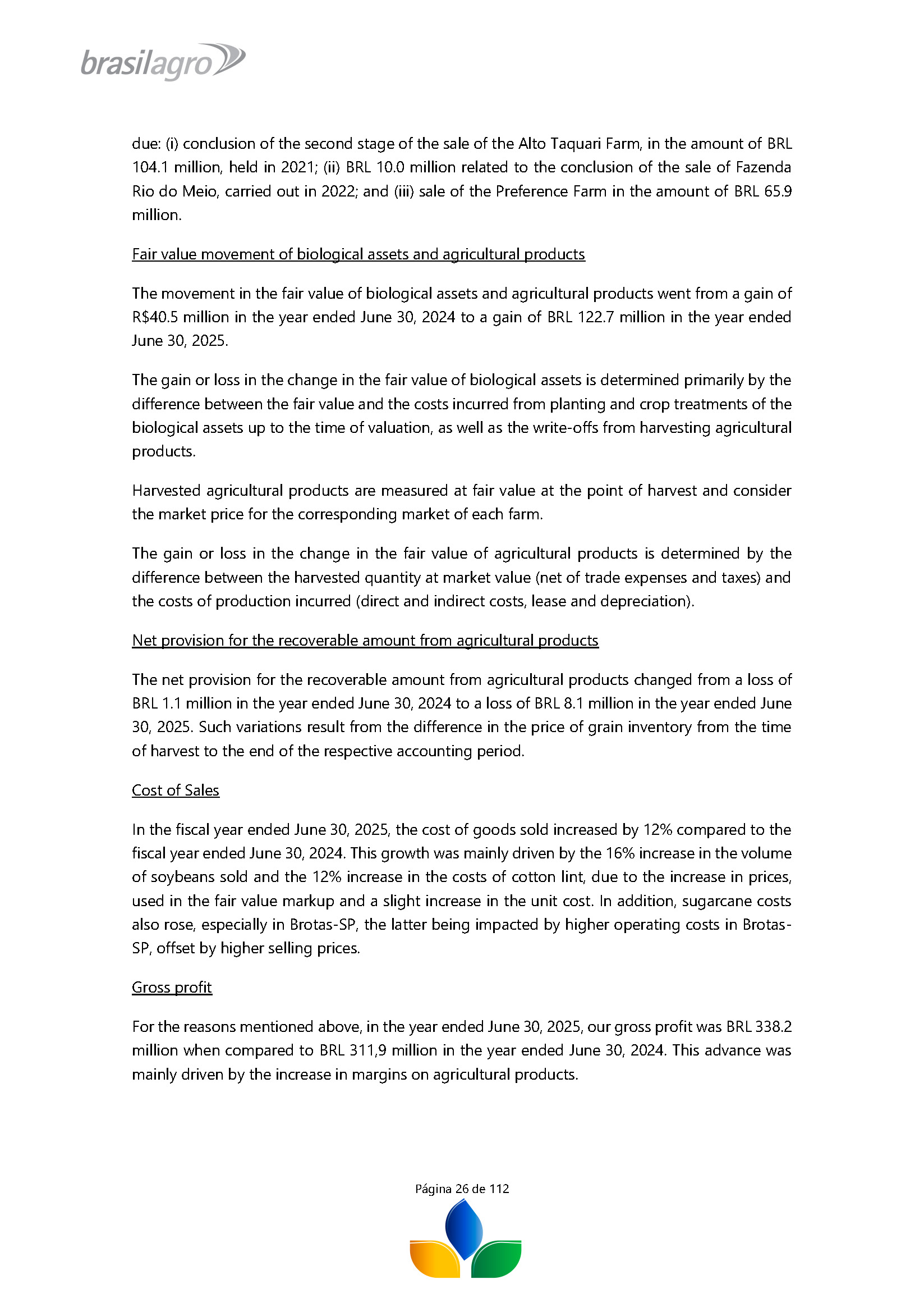 due: (i) conclusion of the second stage of the sale of the Alto Taquari Farm, in the amount of BRL 104.1 million, held in 2021; (ii) BRL 10.0 million related to the conclusion of the sale of Fazenda Rio do Meio, carried out in 2022; and (iii) sale of the Preference Farm in the amount of BRL 65.9 million. Fair value movement of biological assets and agricultural products The movement in the fair value of biological assets and agricultural products went from a gain of R $ 40 . 5 million in the year ended June 30 , 2024 to a gain of BRL 122 . 7 million in the year ended June 30 , 2025 . The gain or loss in the change in the fair value of biological assets is determined primarily by the difference between the fair value and the costs incurred from planting and crop treatments of the biological assets up to the time of valuation, as well as the write - offs from harvesting agricultural products . Harvested agricultural products are measured at fair value at the point of harvest and consider the market price for the corresponding market of each farm . The gain or loss in the change in the fair value of agricultural products is determined by the difference between the harvested quantity at market value (net of trade expenses and taxes) and the costs of production incurred (direct and indirect costs, lease and depreciation) . Net provision for the recoverable amount from agricultural products The net provision for the recoverable amount from agricultural products changed from a loss of BRL 1 . 1 million in the year ended June 30 , 2024 to a loss of BRL 8 . 1 million in the year ended June 30 , 2025 . Such variations result from the difference in the price of grain inventory from the time of harvest to the end of the respective accounting period . Cost of Sales In the fiscal year ended June 30 , 2025 , the cost of goods sold increased by 12 % compared to the fiscal year ended June 30 , 2024 . This growth was mainly driven by the 16 % increase in the volume of soybeans sold and the 12 % increase in the costs of cotton lint, due to the increase in prices, used in the fair value markup and a slight increase in the unit cost . In addition, sugarcane costs also rose, especially in Brotas - SP, the latter being impacted by higher operating costs in Brotas - SP, offset by higher selling prices . Gross profit For the reasons mentioned above, in the year ended June 30 , 2025 , our gross profit was BRL 338 . 2 million when compared to BRL 311 , 9 million in the year ended June 30 , 2024 . This advance was mainly driven by the increase in margins on agricultural products . Página 26 de 112