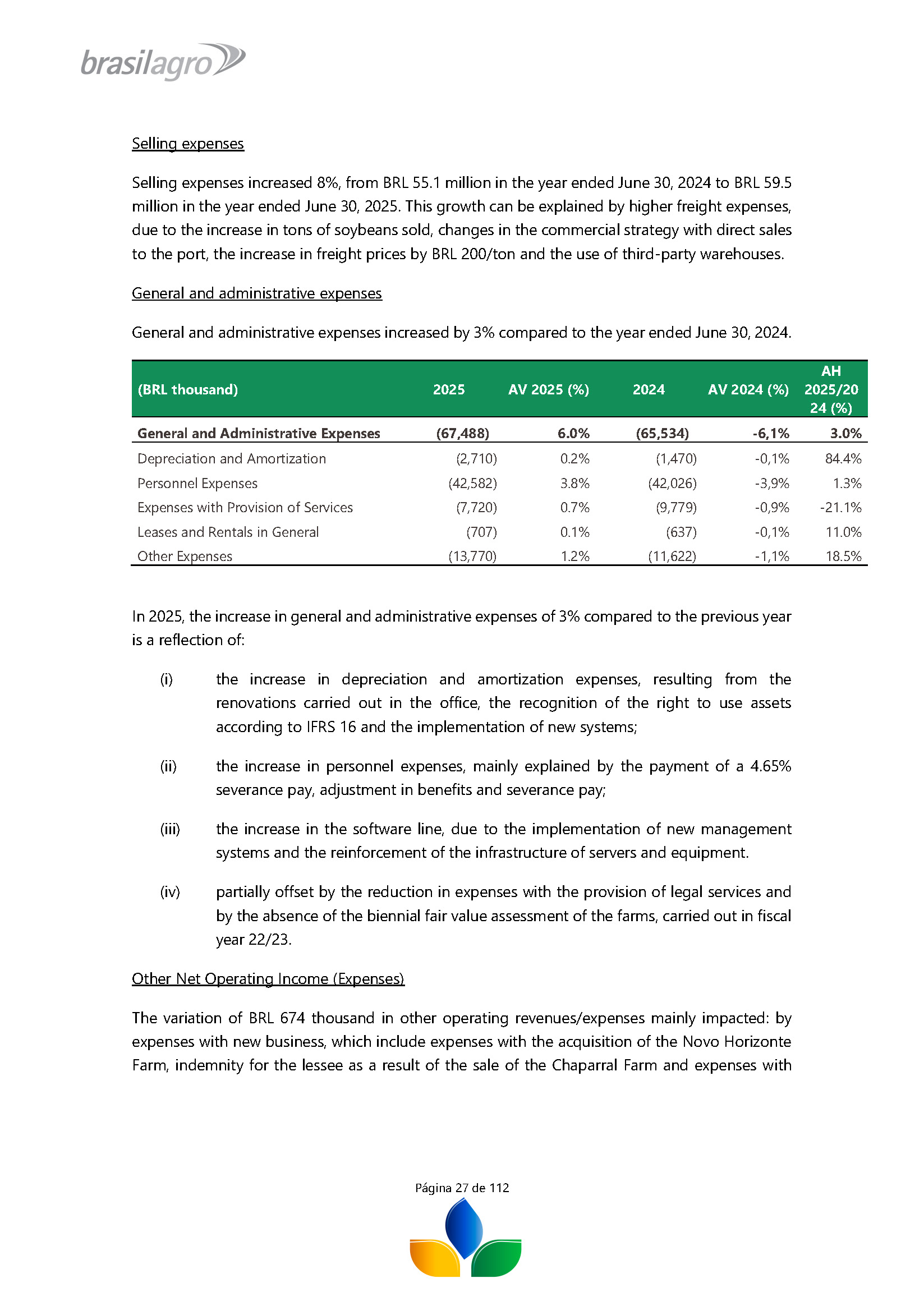 Selling expenses Selling expenses increased 8 % , from BRL 55 . 1 million in the year ended June 30 , 2024 to BRL 59 . 5 million in the year ended June 30 , 2025 . This growth can be explained by higher freight expenses, due to the increase in tons of soybeans sold, changes in the commercial strategy with direct sales to the port, the increase in freight prices by BRL 200 /ton and the use of third - party warehouses . General and administrative expenses General and administrative expenses increased by 3% compared to the year ended June 30, 2024. Página 27 de 112 AH 2025/20 24 (%) AV 2024 (%) 2024 AV 2025 (%) 2025 (BRL thousand) 3.0% - 6,1% (65,534) 6.0% (67,488) General and Administrative Expenses 84.4% - 0,1% (1,470) 0.2% (2,710) Depreciation and Amortization 1.3% - 3,9% (42,026) 3.8% (42,582) Personnel Expenses - 21.1% - 0,9% (9,779) 0.7% (7,720) Expenses with Provision of Services 11.0% - 0,1% (637) 0.1% (707) Leases and Rentals in General 18.5% - 1,1% (11,622) 1.2% (13,770) Other Expenses In 2025, the increase in general and administrative expenses of 3% compared to the previous year is a reflection of: (i) the increase in depreciation and amortization expenses, resulting from the renovations carried out in the office, the recognition of the right to use assets according to IFRS 16 and the implementation of new systems ; (ii) the increase in personnel expenses, mainly explained by the payment of a 4.65% severance pay, adjustment in benefits and severance pay; (iii) the increase in the software line, due to the implementation of new management systems and the reinforcement of the infrastructure of servers and equipment. (iv) partially offset by the reduction in expenses with the provision of legal services and by the absence of the biennial fair value assessment of the farms, carried out in fiscal year 22 / 23 . Other Net Operating Income (Expenses) The variation of BRL 674 thousand in other operating revenues/expenses mainly impacted : by expenses with new business, which include expenses with the acquisition of the Novo Horizonte Farm, indemnity for the lessee as a result of the sale of the Chaparral Farm and expenses with